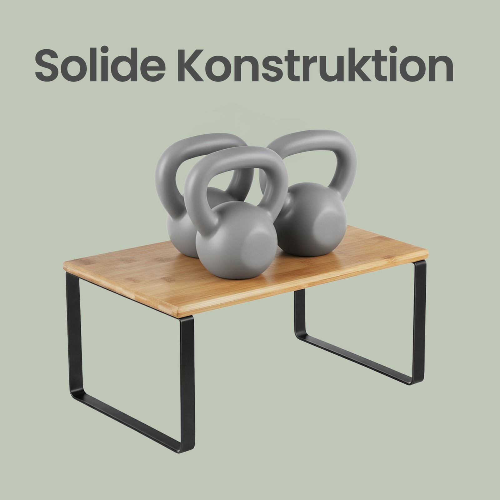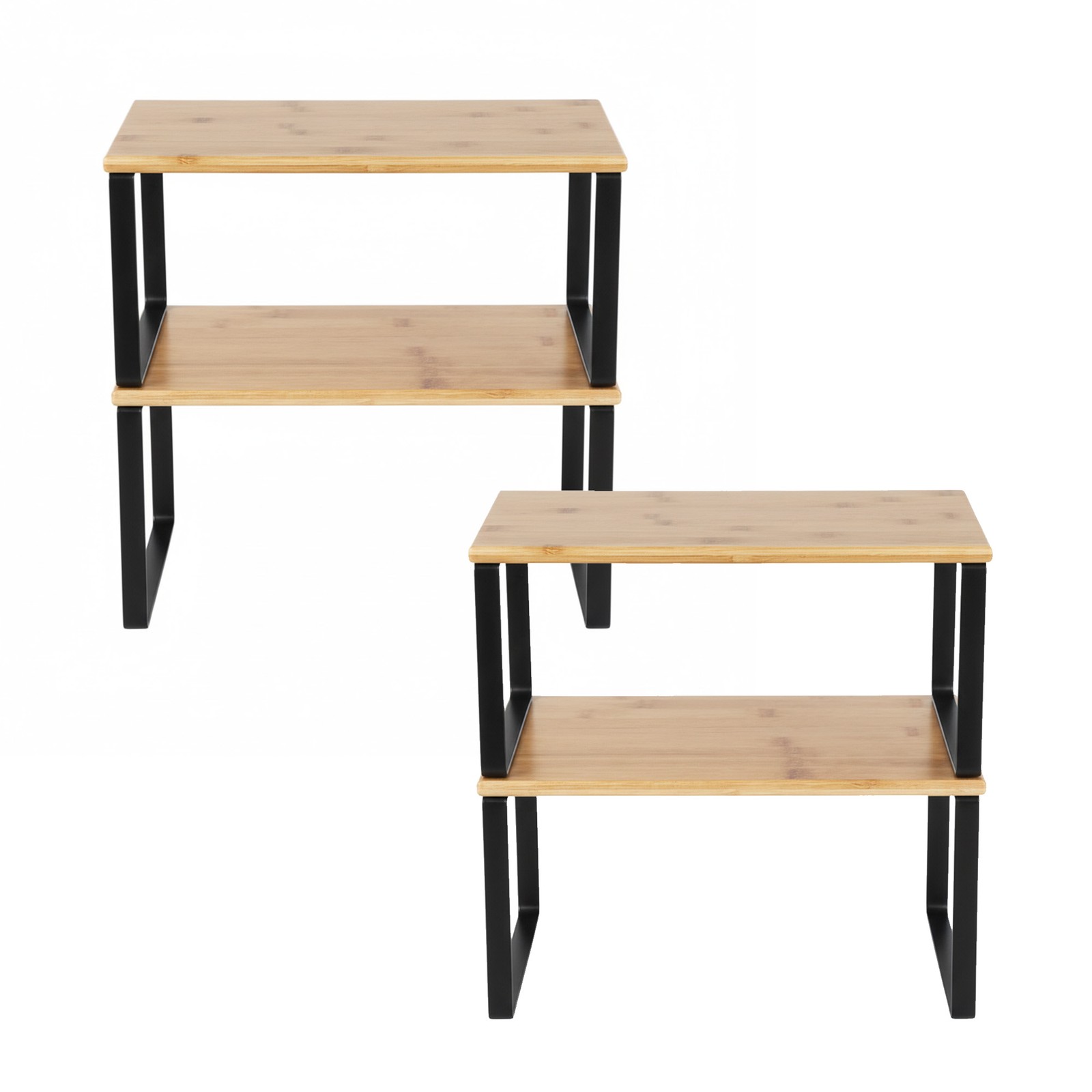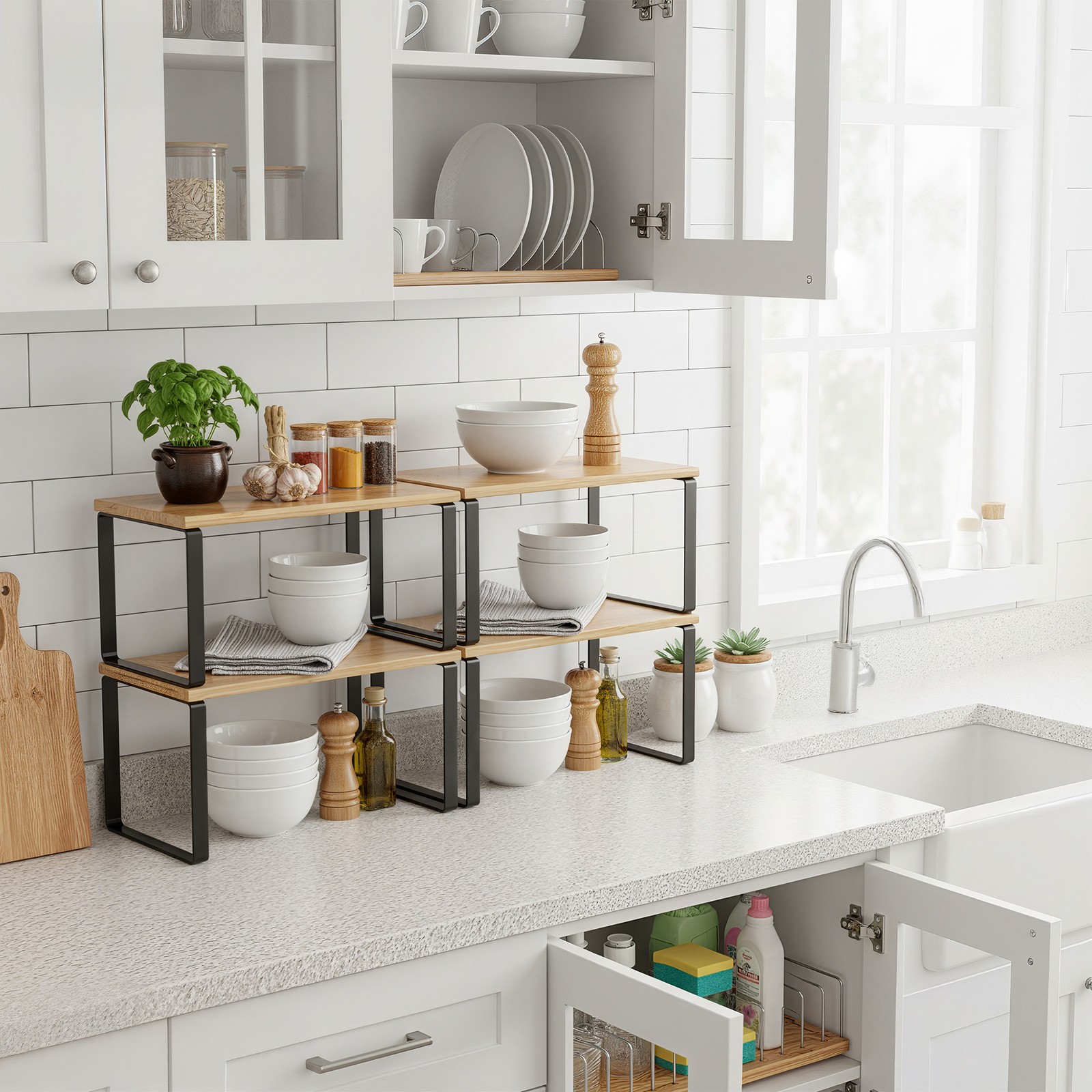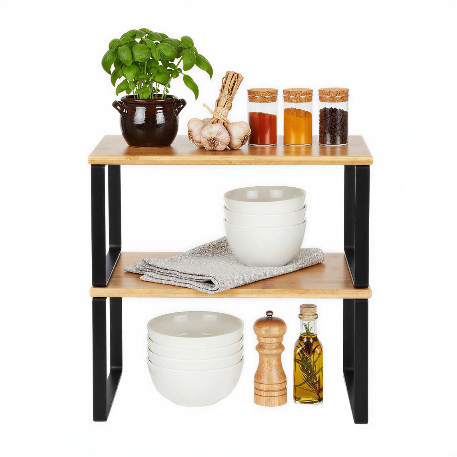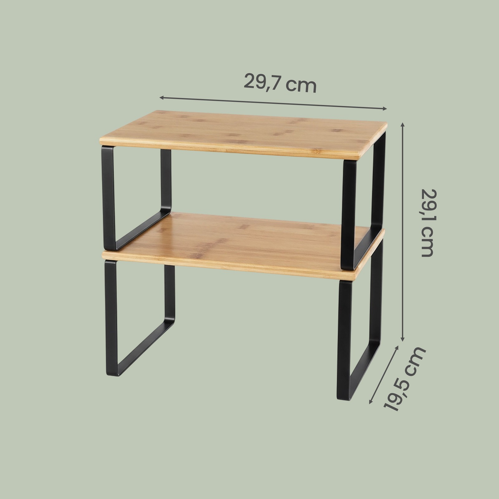 I k?kkenet: Placer dem i skabet eller p? bordet for at skabe flere hylder og flere stabelmuligheder til kornflakesd?ser, krydderid?ser, glas, sk?le og mere. Man kan aldrig have for mange hylder i k?kkenet, vel? I stuen: Med disse hylder kan du skabe et ryddeligt kaffehj?rne: kaffekopperne nedenunder, tekanden ovenp?. Her finder dine kaffe-tilbeh?r deres plads. P? kontoret: Stabel hylderne p? dit skrivebord for at udvide pladsen. Arranger kopper, h?ftemaskiner, klemmer og andre daglige kontorartikler p? forskellige niveauer for at skabe et ryddeligt skrivebord.Hvad har du t?nkt dig at bruge dette s?t til?Produktdetaljer:Farve: Sort-naturfarverMateriale: Metal, bambusM?l p? den store hylde: 19,5 x 29,7 x 15,5 cm (D x B x H)M?l p? den lille hylde: 18,5 x 29,7 x 13,6 cm (D x B x H)Samlet v?gt: 2,6 kg Maks. statisk belastning pr. hylde: 15 kg Leveringsomfang: 4 x k?kkenorganizer 1 x tilbeh?rspakke 1 x vejledning SONGICs bem?rkninger: F?lg vejledningen ved stabling. Undg? langvarig brug i fugtige omgivelser.