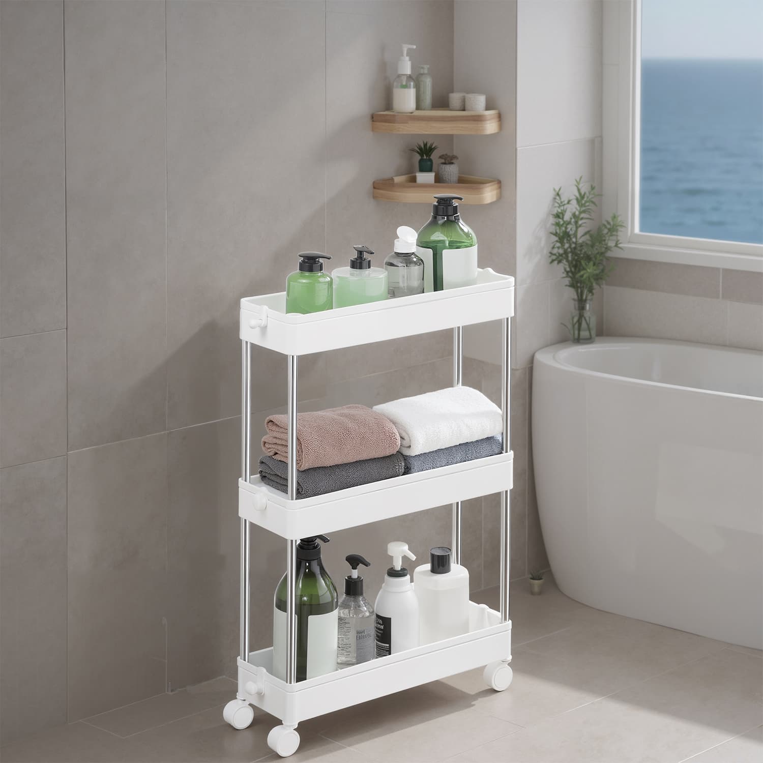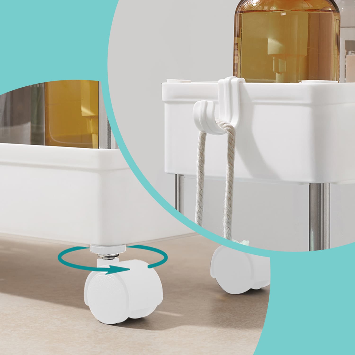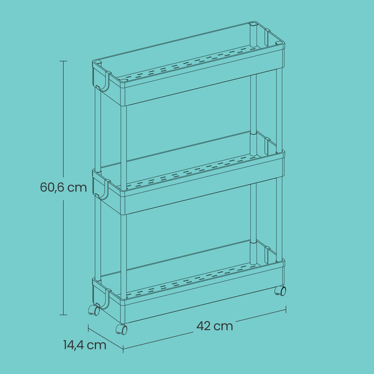 Er nogle af de ting, du brugte i g?r, allerede forsvundet i dag, og skal du bruge lang tid p? at lede efter dem? Bare rolig, denne rullevogn fra SONGMICS hj?lper dig med at g?re en ende p? dette irriterende gemmeleg! Alt inden for r?kkevidde Udstyret med 3 h?jkvalitets PP-plasthylder og underst?ttet af robuste metalr?r tilbyder denne rullevogn plads nok til alle de genstande, der endnu ikke har fundet en fast plads i dit hjem. Denne multitalent kan ogs? uden problemer b?re deres v?gt. Desuden passer serveringsvognen takket v?re sin kompakte st?rrelse (40 x 13 x 60 cm) perfekt i badev?relset til opbevaring af sk?nhedsprodukter, i k?kkenet til opbevaring af k?kkenredskaber eller p? kontoret til opbevaring af dokumenter. Hvis du gerne vil have ofte anvendte genstande lige ved h?nden, er dette produkt fra SONGMICS lige noget for dig! Produktdetaljer:- Farve: Hvid – Materiale: PP (polypropylen), metalr?r – St?rrelse: 40 x 12,5 x 60 cm (L x B x H) – V?gt: 0,9 kg – Maks. samlet statisk belastning: 15 kg – Maks. statisk belastning pr. hylde: 5 kg Leveringsomfang:- 1 x rullebord – 3 x kroge – 1 x vejledning (DE, EN, DE, FR, ES, IT) SONGMICS bem?rkninger: – Monter kun produktet som beskrevet i denne vejledning. Undlad at afmontere det med magt. – Hver hylde kan b?re op til 5 kg. Undlad at opbevare tungere genstande p? produktet.