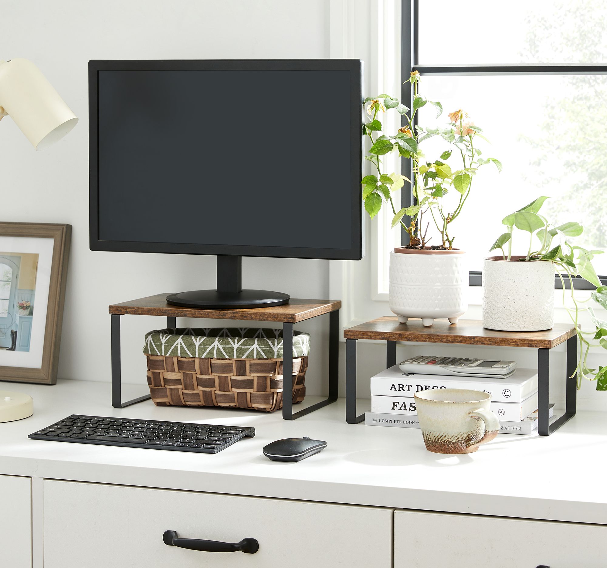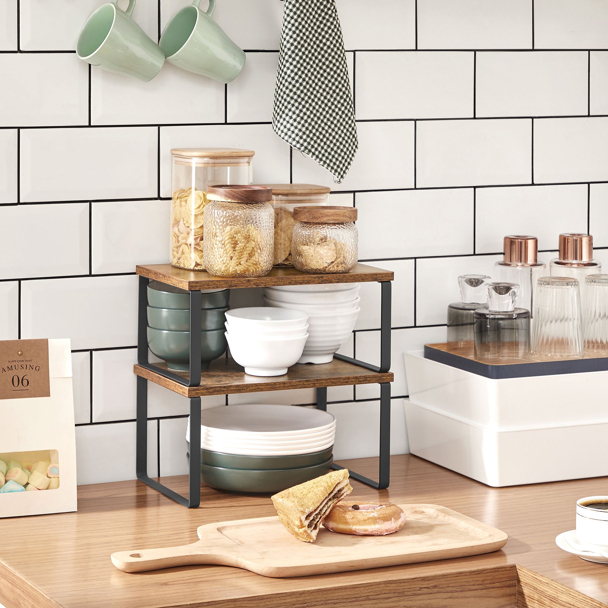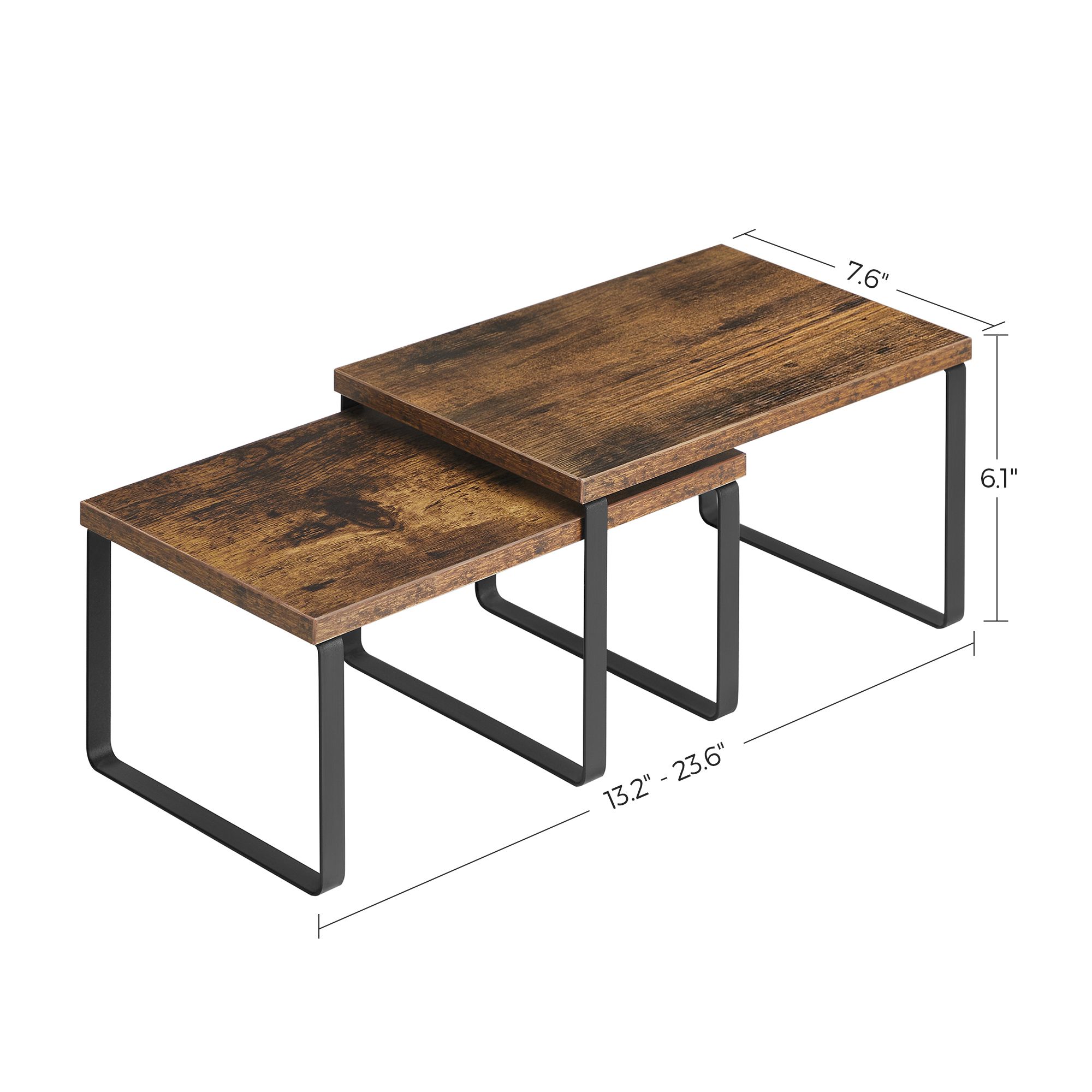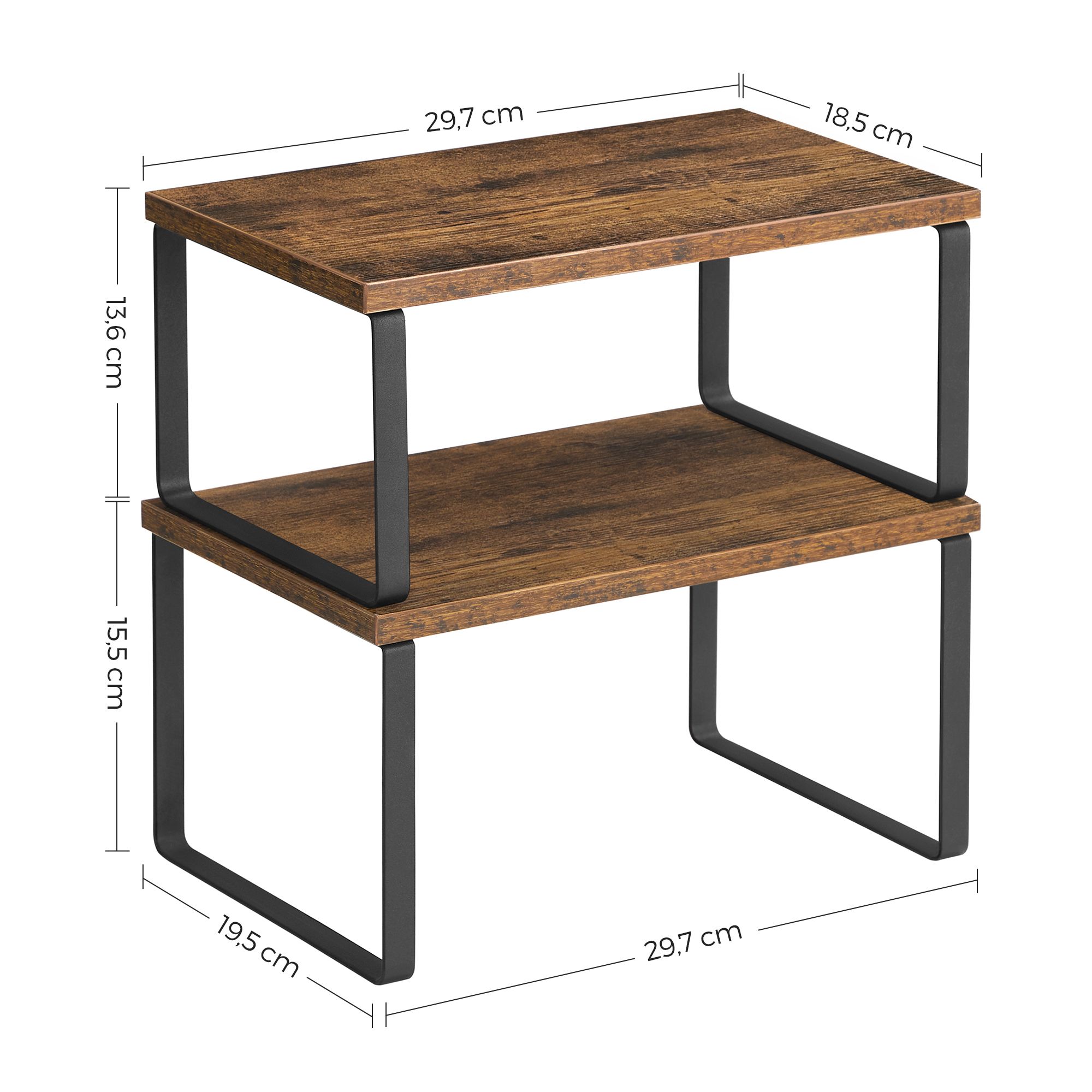 Ryd op p? din bordplade: En rodet samling af ingredienser p? bordpladen kan v?re frustrerende og g?re det sv?rt at finde den rigtige krydderikrukke p? et splitsekund, n?r du laver mad. Her kommer l?sningen: Disse charmerende hylder giver dig 4 niveauer til at genoprette b?de plads, orden og stil. Lad din fantasi l?be frit: Opret en mini-te-station i stuen, brug hylderne i badev?relset til dine toiletartikler og makeup, eller l?g dine daglige kontorartikler p? dem for at f? et ryddeligt skrivebord igen. Dette reols?t er ikke kun designet til krydderiflasker og glas! Produktdetaljer: Farve: Vintagebrun-sort Materiale: Metal, sp?nplade St?rrelse p? den store reol: 29,7 x 19,5 x 15,5 cm (L x B x H)St?rrelse p? den lille hylde: 29,7 x 18,5 x 13,6 cm (L x B x H) Samlet v?gt: 2,6 kg Maks. statisk belastning pr. hylde: 15 kg Leveringsomfang: 4 x krydderihylde 1 x tilbeh?rspakke 1 x vejledning SONGMICS Bem?rkninger: F?lg vejledningen for at stable hylderne.Undg? langvarig brug i fugtige omgivelser.