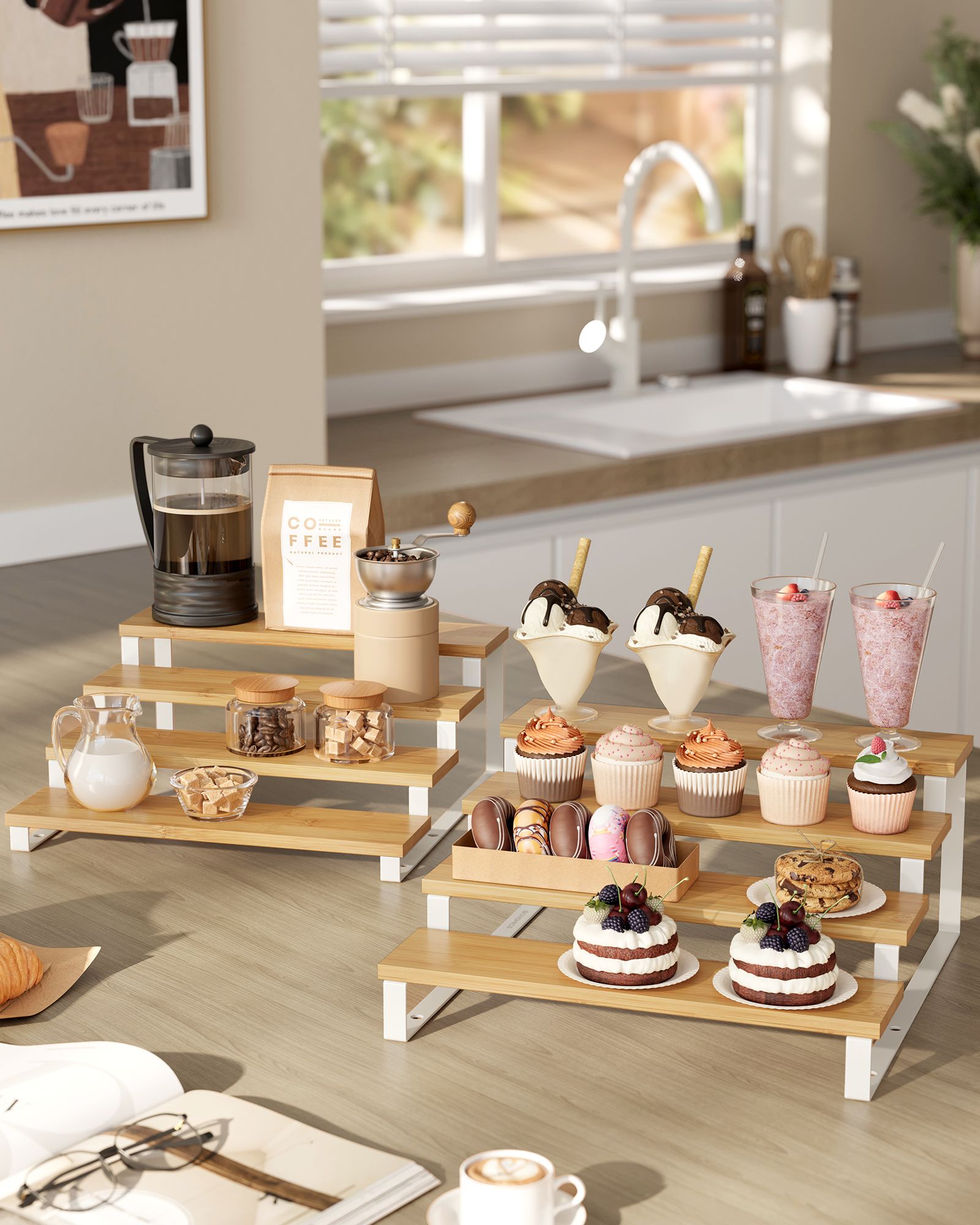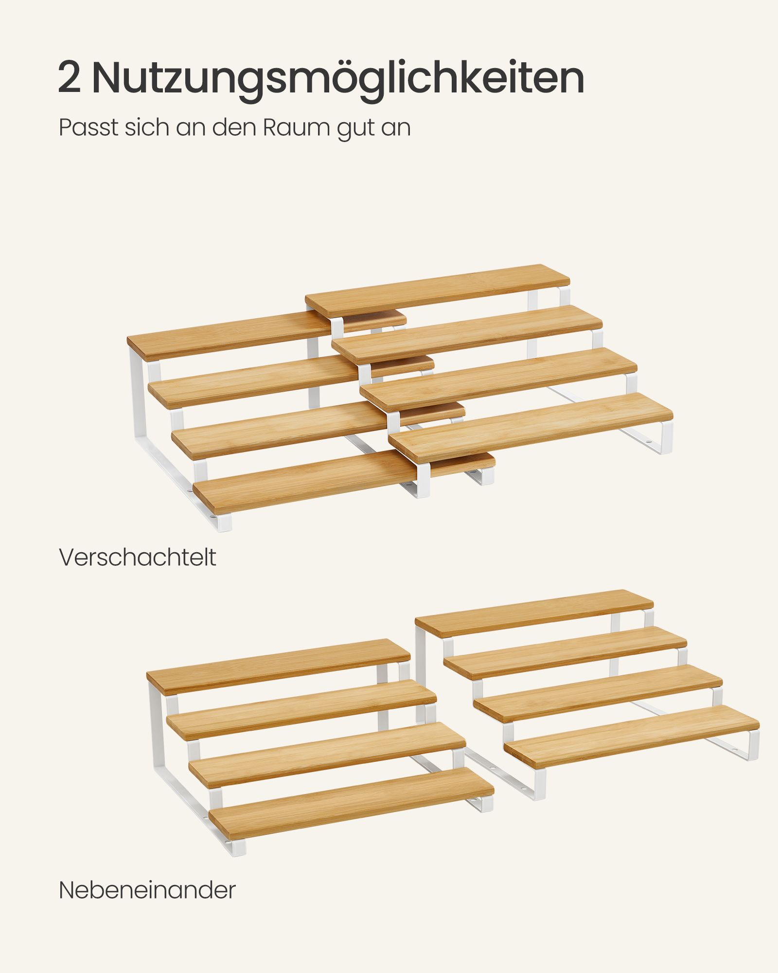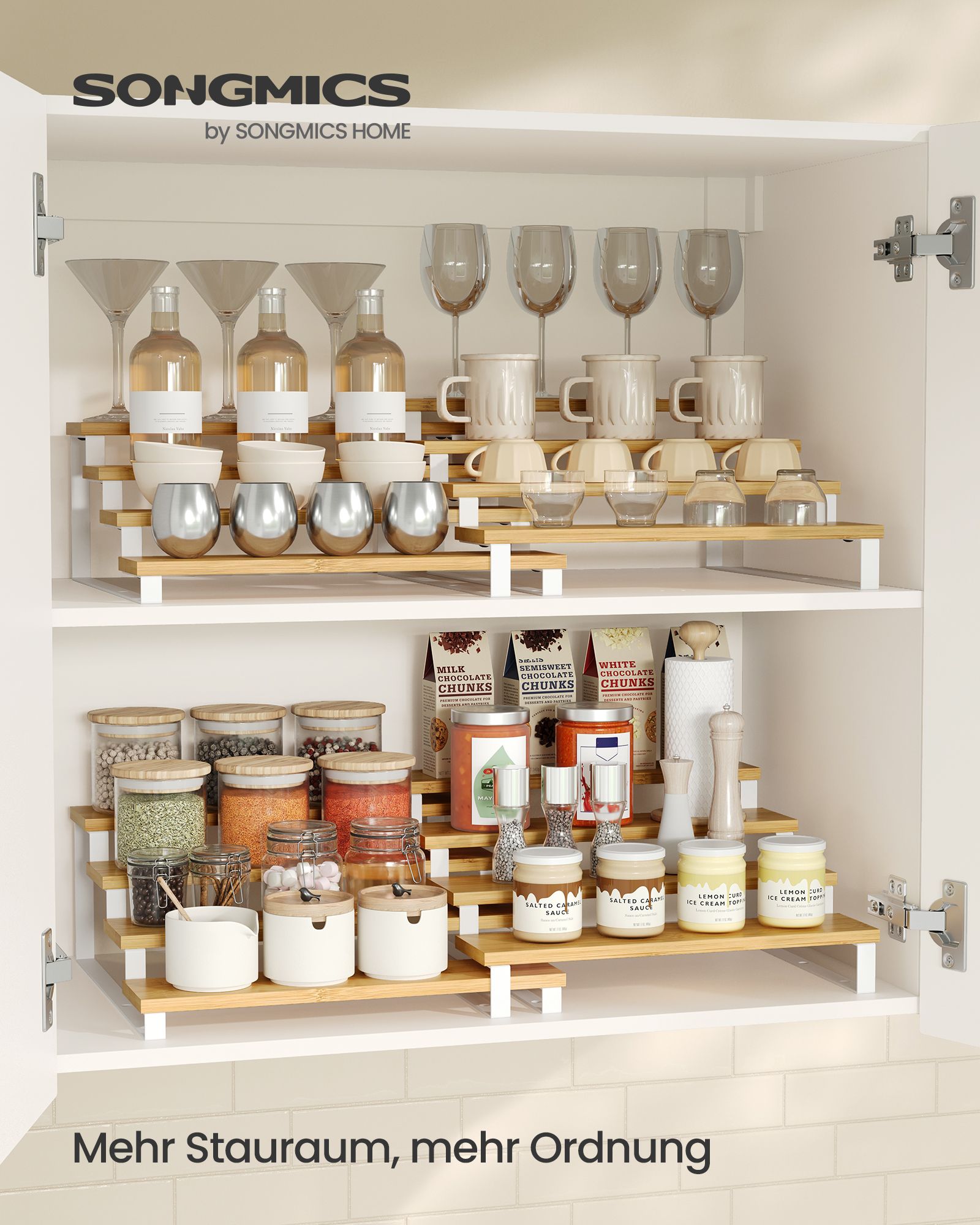 SONGMICS krydderihylder, st?ende k?kkenhylder, k?kkenorganizer, 2-pak, tr?materiale, 4 hylder hver, udtr?kkelige, stabelbare, til spisekammer, bordplade