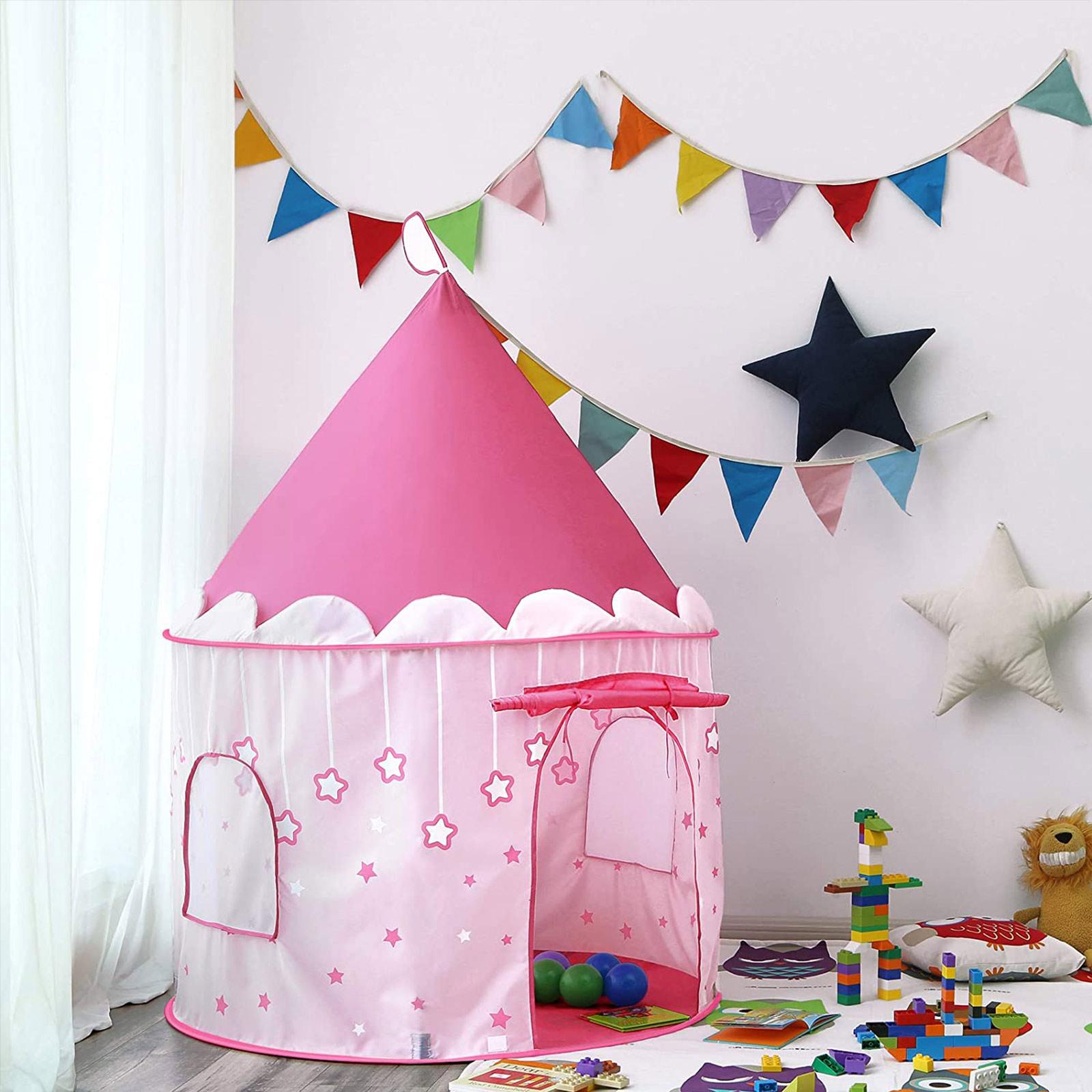 T?ler selv de st?rste vildbasser Takket v?re 190T polyester-materialet er teltet s?rligt holdbart. Fastg?rende stof?bninger forhindrer st?ngerne i at glide. Produktet har best?et T?V Rheinland’s sikkerhedstests inden for “br?ndbarhed” og “mekaniske egenskaber”. Ideel til indend?rs og udend?rs brug Teltet er det perfekte sted at v?re hjemme, n?r man ikke er hjemme. Du kan s?tte det op i legerummet, sovev?relset, haven eller andre steder. Legehuset er ogs? en komfortabel bolig p? udflugter. S?t det op p? f? minutter Teltet har en pop-up-mekanisme og kan derfor s?ttes op p? f? minutter. For at afslutte ops?tningen skal du blot skubbe de 4 glasfiberst?nger ind i de tilh?rende ?bninger, og s? kan du igen koncentrere dig om de daglige huslige pligter, mens dit barn leger lystigt. Teltet kan desuden nemt foldes sammen efter brug og opbevares eller transporteres i den medf?lgende b?retaske.Vent ikke l?ngere og overrask dit barn med denne s?de gave! Produktdetaljer: – Farve: Pink – Materiale: 190T polyester, glasfiberst?nger, galvaniserede jerntr?de – M?l: 101 x 135 cm (? x H) – V?gt: 1,13 kg Leveringsomfang:- 1 x telt – 4 x glasfiberst?nger – 1 x opbevaringstaske – 1 x vejledning (DE, EN, FR, ES, IT) SONGMICS Bem?rkninger:- Lysguirlanden er ikke inkluderet i leveringen. – S?rg for, at teltet f?r tilstr?kkelig dagslys, s? det lyser om natten. – Dette produkt er beregnet til b?rn fra 3 ?r. – B?rn m? ikke bruge produktet uden opsyn af en voksen.