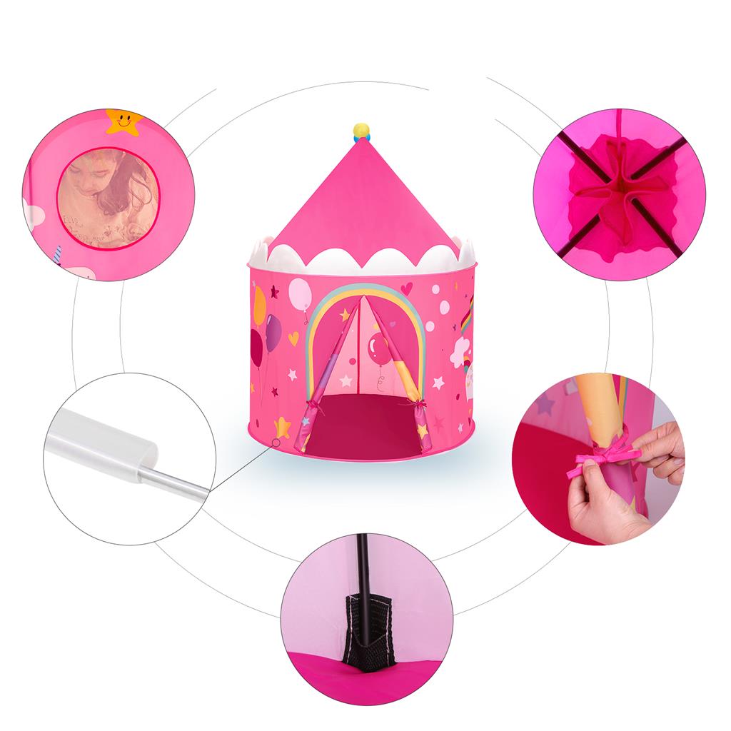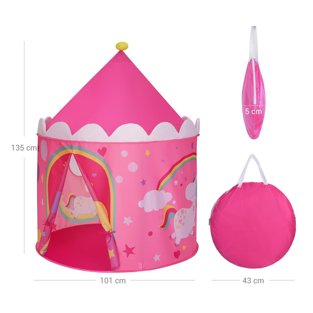 Kvalitet t?ller: 190T polyesterstof, solide glasfiberst?nger og forst?rkede s?mme ? alle disse h?jkvalitetsmaterialer sikrer, at dette legetelt kan modst? selv de st?rste vildbasser. Med denne gave kan intet g? galt: Dette legetelt fra SONGMICS er en perfekt gave til sm?b?rn. De vil helt sikkert juble af gl?de: “Endelig har jeg mit eget slot!” Her kan dine b?rn lege eller l?re, indtil de er omkring 8 ?r gamle! Kilde til gl?de: Takket v?re det brugervenlige design kan du nemt folde teltet sammen og opbevare det i den praktiske b?retaske. Det vil v?re en kilde til gl?de overalt: i stuen, hos en ven eller i en solrig have. Produktdetaljer:Farve: Pink-gul Materiale: 190T polyester, glasfiberst?nger, st?ltr?de St?rrelse: 101 x 135 cm (? x H) V?gt: 1,1 kg Leveringsomfang: 1 x legetelt 4 x glasfiberstang 1 x b?retaske 1 x vejledning (DE, EN, FR, ES, IT) SONGMICS Bem?rkninger:Brug ikke produktet i n?rheden af ?ben ild.