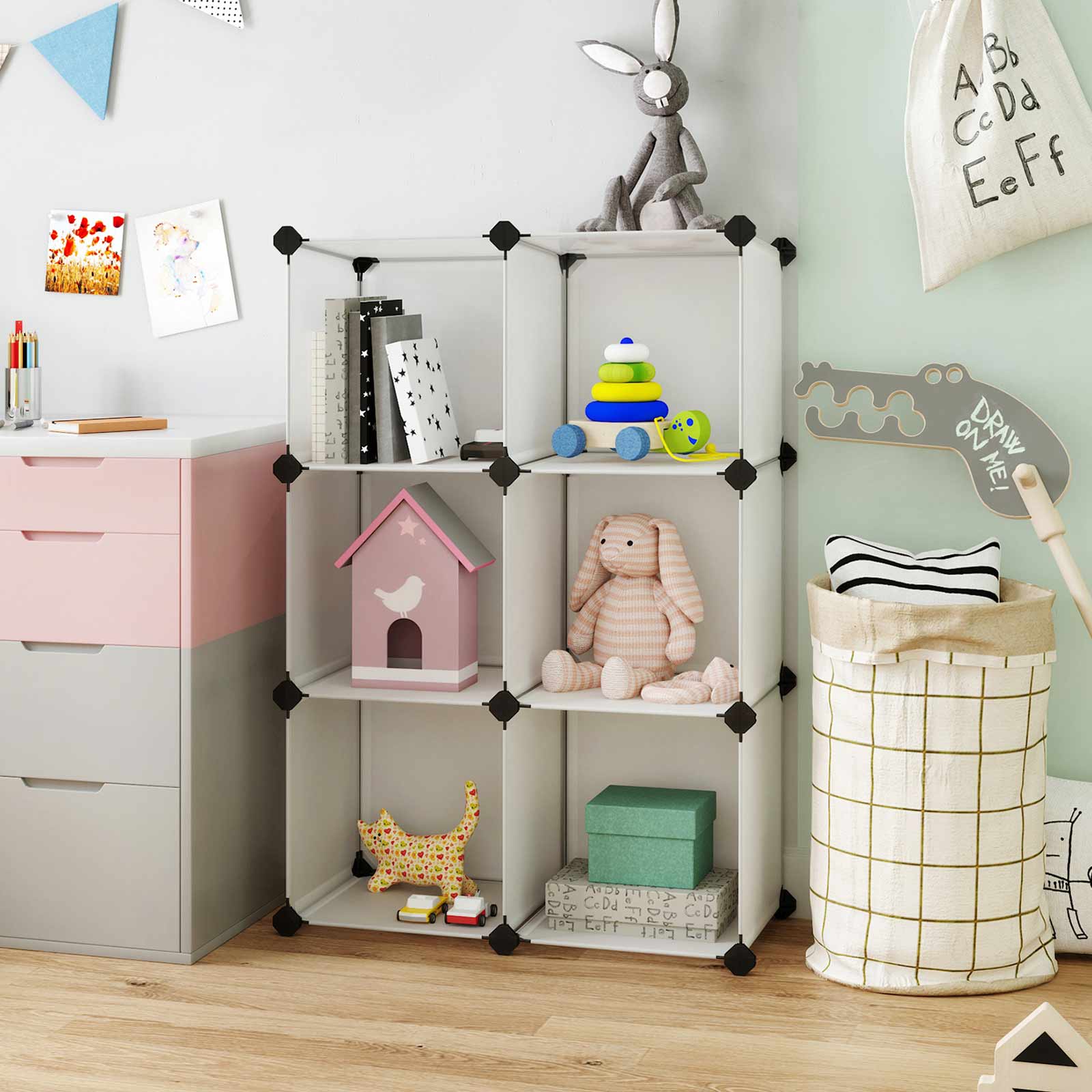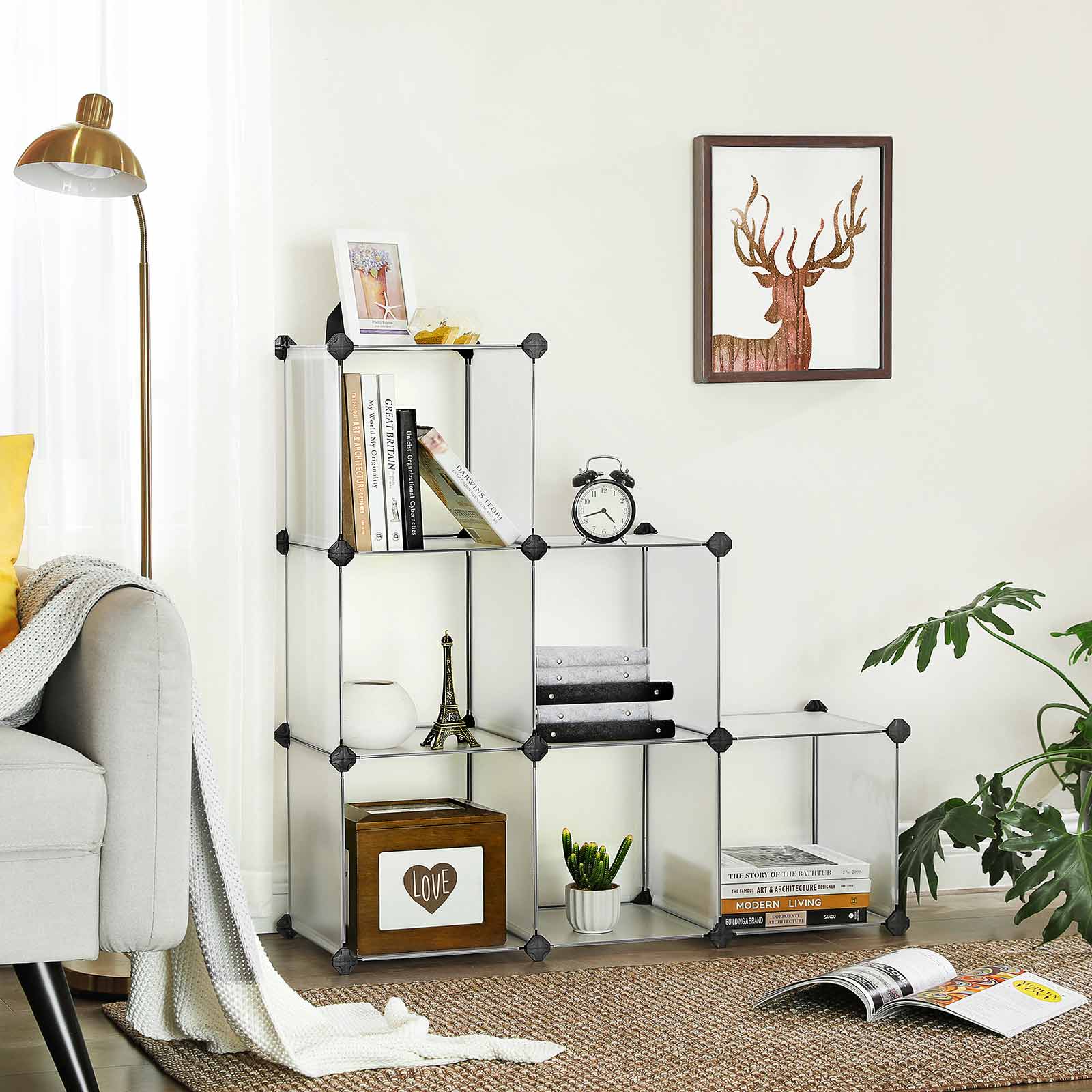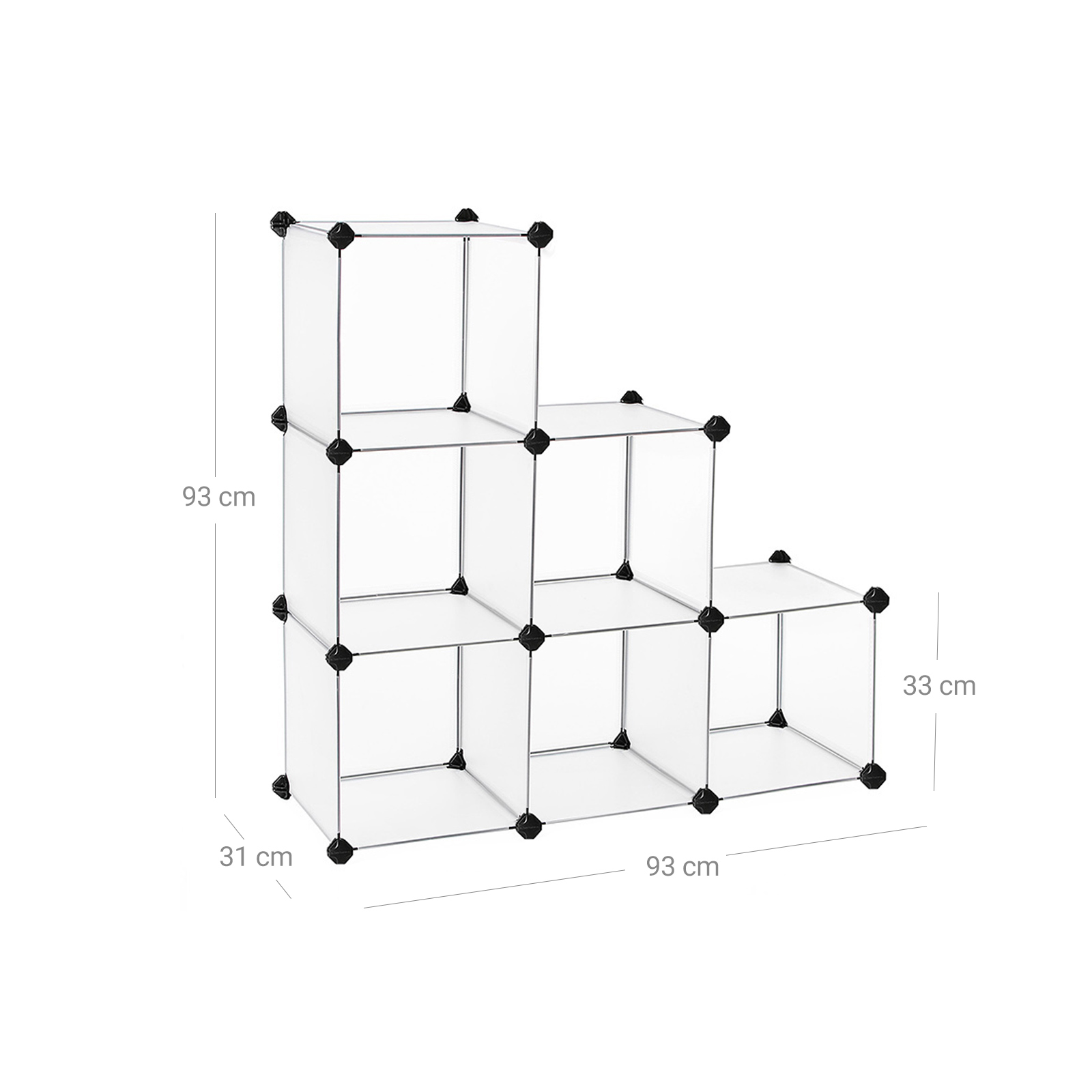 Songmics stativreol kombinerer lethed og stabilitet p? en ideel m?de. Montering foreg?r ved hj?lp af et sofistikeret stiksystem, og den grafiske monteringsvejledning guider dig trin for trin til et praktisk pladsbesparende vidunder. Reolen kan nemt skilles ad, hvis det er n?dvendigt, s? den kan opbevares eller transporteres uden at optage for meget plads. Uanset om du leder efter et opbevaringsreol til kontoret eller bare har brug for opbevaringsplads i gangen, tilbyder Songmics den rigtige l?sning til alle disse opgaver med sit fleksible system! Produktdetaljer: M?l: 93 x 93 x 31 cm (B x H x D) Materiale: PP-plast (plade) + ABS-plast (forbindelsesstykke) Farve: halvgennemsigtig hvid Maks. belastning pr. hylde: 10 kg Leveringsomfang: 24 x PP-plade (30 x 30 cm; halvgennemsigtig hvid) 26 x plastikforbindelsesstykke (sort) 1 x lille tr?hammer 1 x vejledning (DE, EN, FR, IT, ES) 1 x v?gbeskyttelse (2 s?t skruer, dyvler og nylonremme) Bem?rkninger: – Da reolen hovedsageligt best?r af PP-plast, skal du undg? at trykke h?rdt p? reolen, sl? h?rdt p? den eller lade den komme i kontakt med skarpe/spidse genstande. Pas ogs? p? ikke at s?tte dig p? reolen. Hold det v?k fra ant?ndelseskilder og ?ben ild. – N?r du monterer forbindelsesstykkerne, skal du v?re opm?rksom p?, at de runde flader med logoet “Songmics” alle skal vende udad. – N?r du monterer pladerne, skal du v?re opm?rksom p?, at pladernes udsparede hj?rner skal presses helt ind i forbindelsesstykkenes stik?bninger. Til dette form?l skal man altid trykke p? hvert forbindelsesstykke efter opbygningen af et niveau, indtil delene sidder “helt nede” og klikker p? plads. Det er vigtigt at sikre, at delene passer n?jagtigt, ellers vil reolen virke sk?v. – Pladerne best?r af en metalramme, der er bekl?dt med en stabil plastfolie, der er lagt over kanterne og derefter svejset fast. Det anbefales ikke at opbevare b?ger, h?ndv?gte eller andre tunge genstande i reolen.