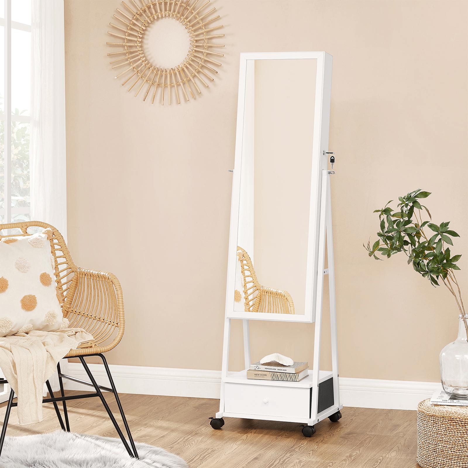 Sig farvel til kaos: Et rummeligt skab, et helkropsspejl, en hylde og en skuffe ? opbevar alt, hvad du har brug for, i dette funktionelle skab for at spare tid og plads. Takket v?re dette m?bels gener?se og smarte layout kan du organisere dine ting som en professionel. Opbevaringsplads, styrke og stil ? vi l?gger v?gt p? alle faktorer i dette smykkeskab:Fremstillet af h?jkvalitets tr?materiale for god robusthed i daglig brug Med flere rum, kroge, huller og pladser til opbevaring af forskellige accessories Enkelt, men elegant design, der giver dit v?relse et strejf af varme og charme Giv dette stilfulde smykkeskab i gave til dine k?re for at bringe gl?de i deres ansigter Produktdetaljer:Farve: Hvid Materiale: MDF (medium densitetsfiberplade), metal, glasspejl, skuffe af fleece med MDF-front Samlet st?rrelse: 41,5 x 37 x 152,5 cm (L x B x H) St?rrelse p? skabskroppen: 37 x 10 x 108,5 cm (L x B x H)V?gt: 14,2 kgLeveringsomfang:1 x smykkeskab1 x tilbeh?rspakke1 x v?ltesikring1 x vejledning (DE, EN, FR, ES, IT)SONGMICS Bem?rkninger:Uds?t ikke produktet for st?rk sollys i l?ngere tid.Placer produktet p? et t?rt sted. Af sikkerhedsm?ssige ?rsager er det forbudt for b?rn at klatre p? produktet eller lege med det.