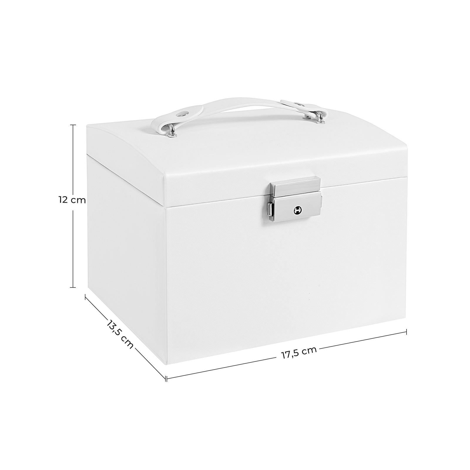 En ?jeblikkelig favorit: De enkle linjer, den kompakte st?rrelse og det bl?de betr?k af kunstl?der ? alt dette g?r dette smykkeskrin til et stilfuldt supplement til din kommode ? og til et perfekt hjem for dine skinnende smykker. Til rejsen? Lige tilpas: Uanset om det er til en dagsudflugt eller en l?ngere rejse… De mange opbevaringspladser i dette smykkeskrin g?r det muligt at tage dine vigtigste skatte med p? rejsen ? du kan bare beslutte, hvilke ?reringe og halsk?der du vil tage p?, alt efter situationen p? stedet! Endnu bedre: Takket v?re det afl?selige design med 2 n?gler er alt sikkert, mens du nyder rejsen.Produktdetaljer: Farve: Hvid Materiale: MDF (medium densitets fiberplade), PU (polyurethan), fl?jl St?rrelse: 17,5 x 13,5 x 12 cm (L x B x H) V?gt: 0,9 kg Leveringsomfang: 1 x smykkeskrin