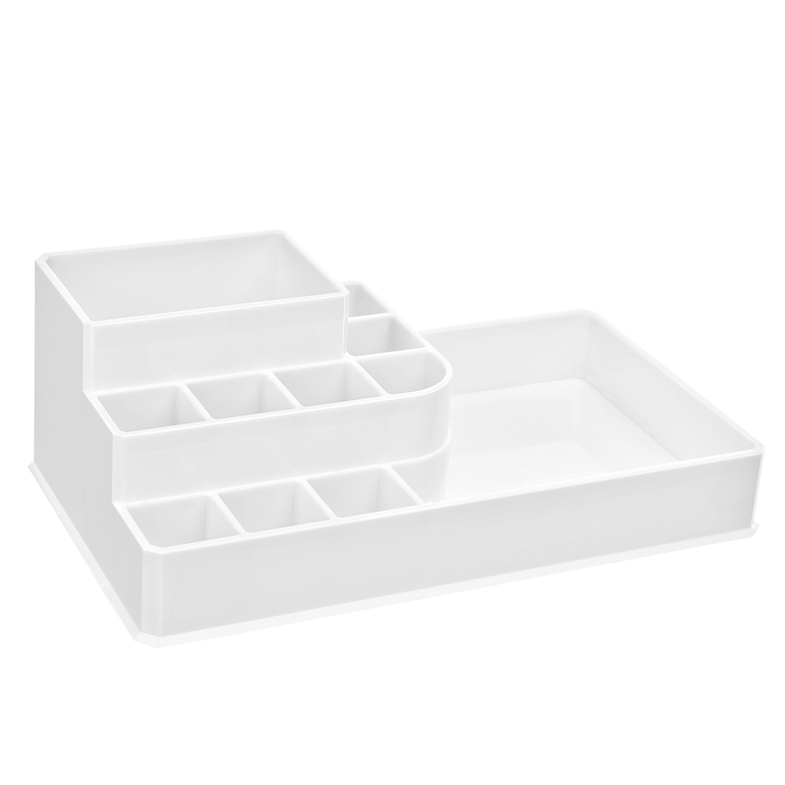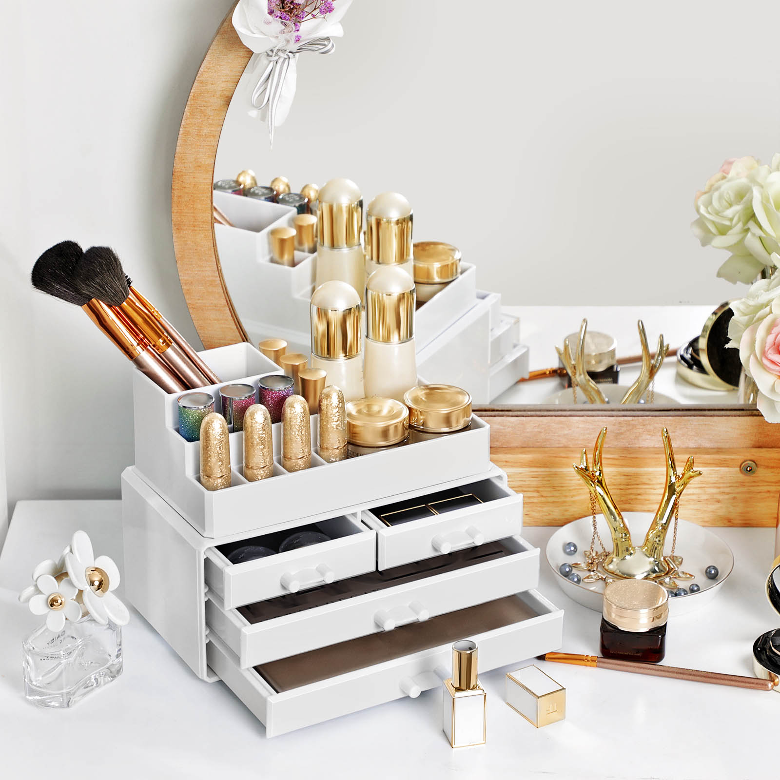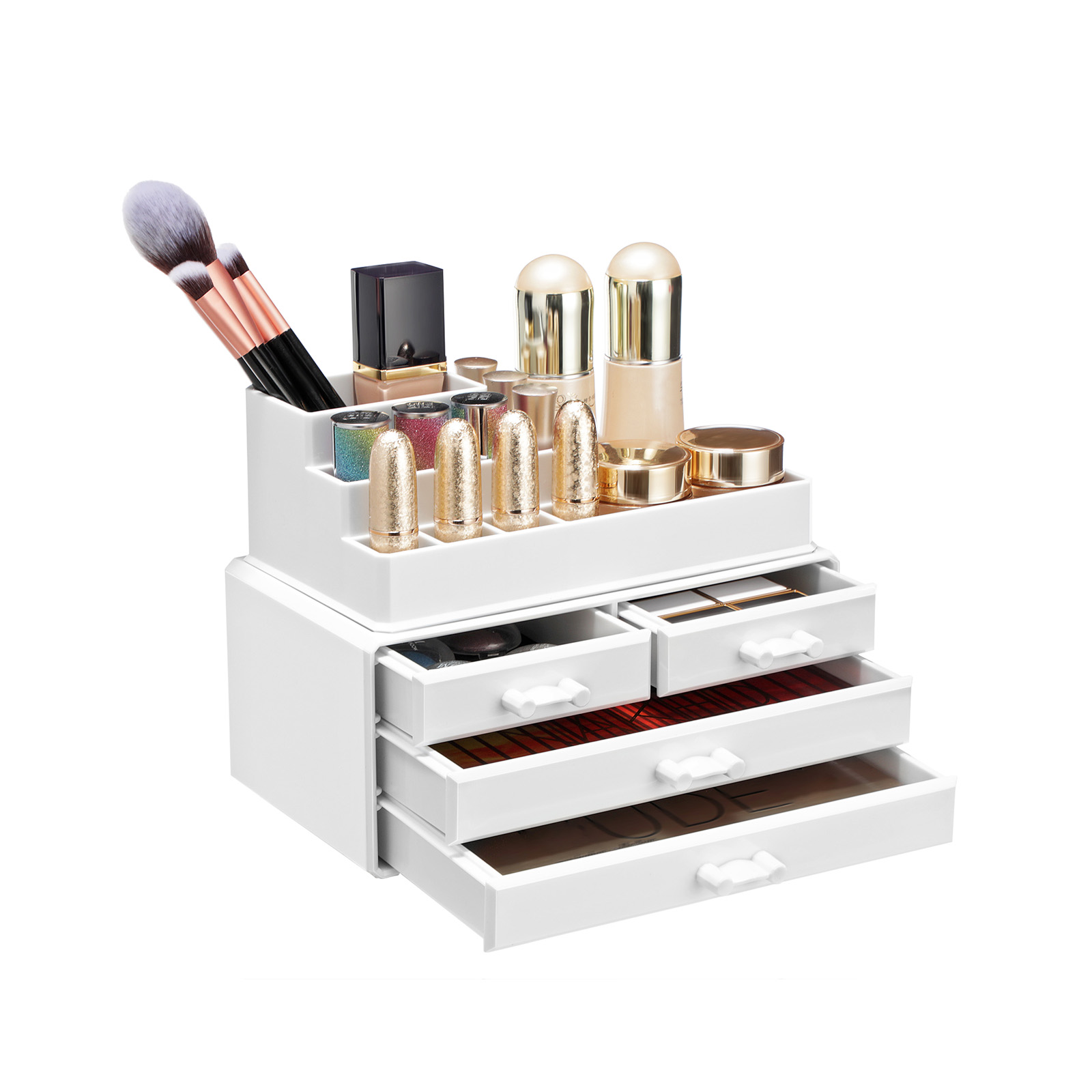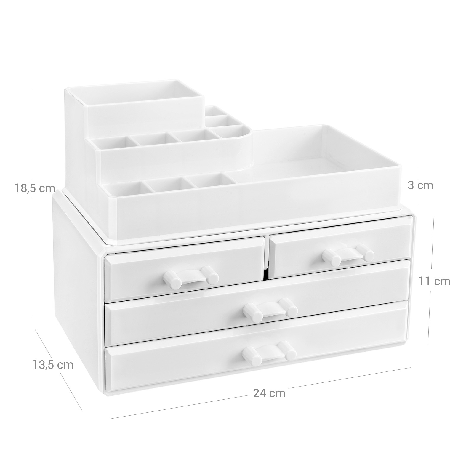 Beauty-Essential: At du kan v?re tilfreds med din makeup tidligt om morgenen, skyldes ikke kun dine evner eller det faktum, at du er en s?rlig aktiv morgenfugl. At du hurtigt kan finde dine makeup-redskaber, bidrager ogs? i h?j grad til din tilfredshed. Organiser derfor din makeup med denne kosmetikorganizer fra SONGMICS og g?r dit liv mere behageligt og stressfrit! 2-i-1 makeup-organizer: Brug de to dele af kosmetikboksen sammen, hvis du kun har begr?nset opbevaringsplads, eller p? to forskellige steder. Du kan f.eks. placere den ?verste del med 11 rum til l?bestift, pensler og neglelak separat p? dit toiletbord. S? er overfladen p? den nederste del fri til parfumeflasker eller cremer. I de 4 skuffer kan du desuden opbevare ?jenskygge, pincet og lignende. Din tilfredshed er vores m?l: Hvis du har yderligere sp?rgsm?l, er du velkommen til at kontakte vores kundeservice. Vores venlige medarbejdere st?r altid til r?dighed. Udstyr dit sk?nhedsparadis med denne kosmetikorganizer! Produktdetaljer: Farve: Hvid Materiale: Polystyren St?rrelse: 24 x 13,5 x 18,5 cm (L x B x H) V?gt: 1,2 kg Leveringsomfang: 1 x kosmetikorganizer SONGMICS Bem?rkninger: Behandl produktet med forsigtighed.