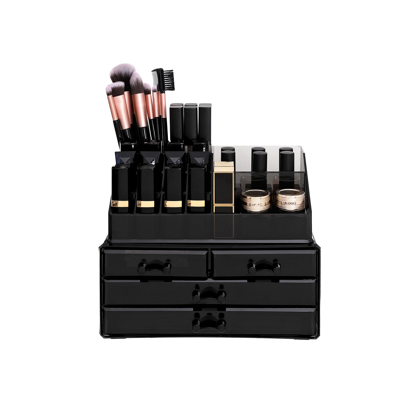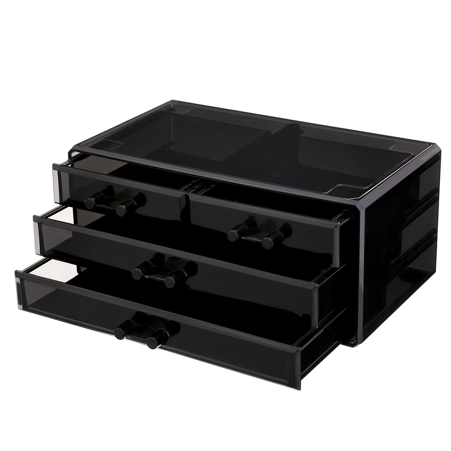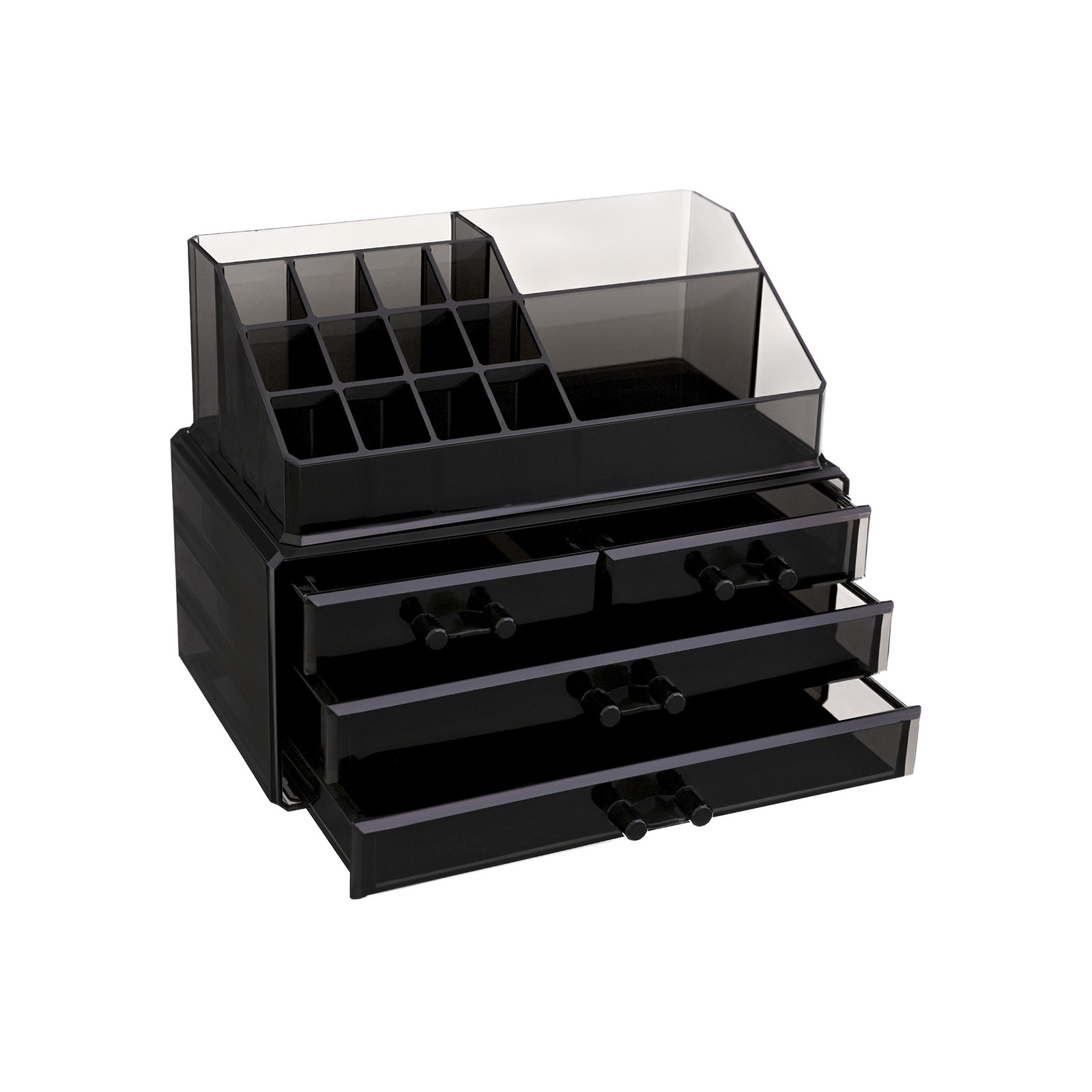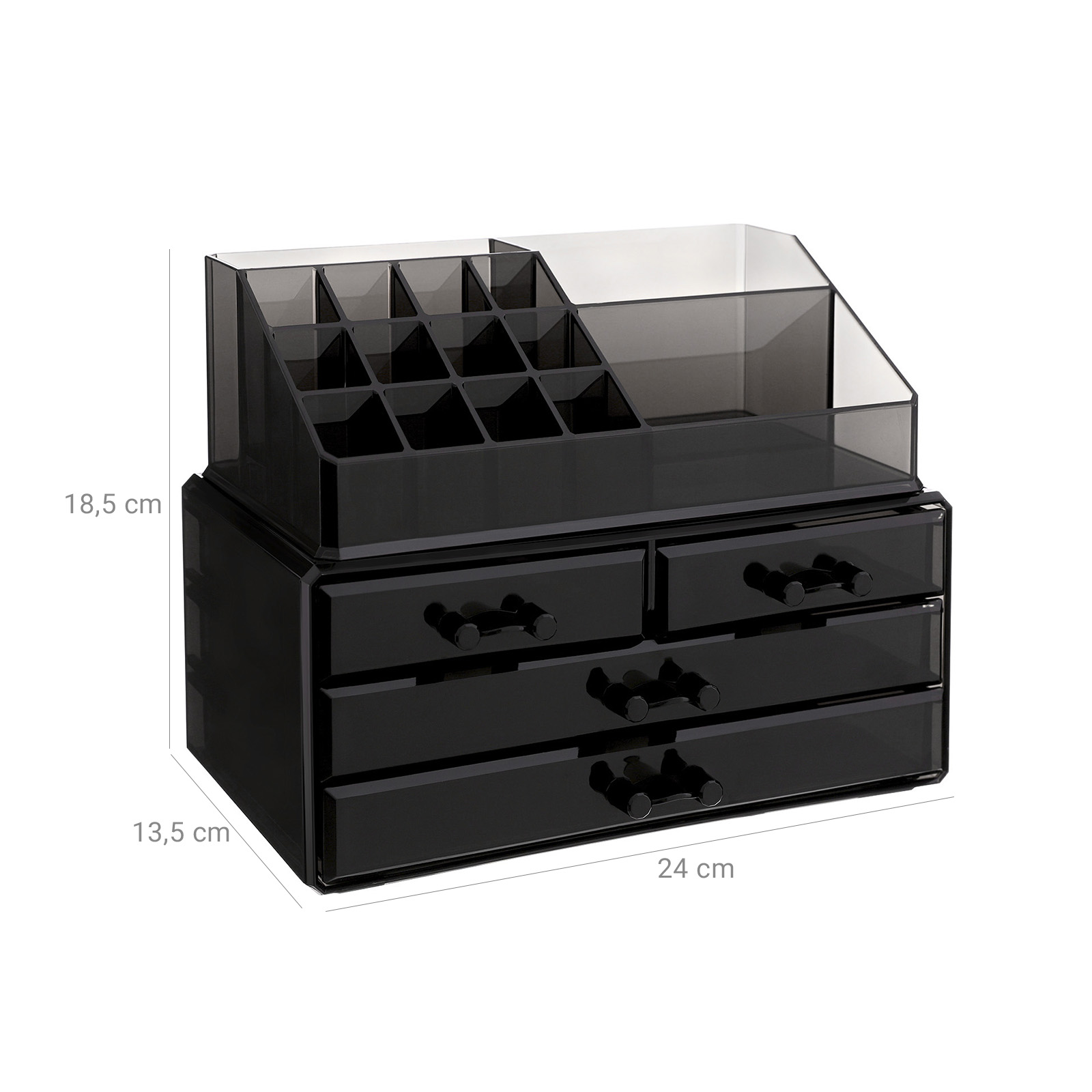 Ligger der makeup-ting overalt i badev?relset eller p? toiletbordet? Og kan du aldrig finde det rigtige, n?r du har brug for det? S? er denne transparente kosmetik-organizer i akryl perfekt til dig! Akrylen i sort er gennemskinnelig og af h?j kvalitet. Det giver dette elegante opbevaringssystem den fordel, at man straks kan se, hvad der er i rummene. Det g?r det lettere at finde de forskellige redskaber. Rummene og skufferne i forskellige h?jder og st?rrelser g?r det ogs? muligt at fordele tingene praktisk. S? kan du sortere alting p?nt. Denne kasse kan ogs? bruges til at rydde op, sortere og ordne alle andre redskaber, f.eks. sytr?d, skruer, kontorartikler osv. Kassen er p?nt udf?rt og har ingen skarpe kanter. Og skufferne har skinner i siderne, s? de glider let. Det skal ogs? n?vnes, at hver skuffe har en sort skridsikker underlag, der ikke kun forhindrer skuffen i at glide, men ogs? g?r det muligt at l?gge ting i skuffen uden at lave st?j. Endelig orden i makeup-kaoset! Bem?rk: Brug produktet med forsigtighed, og undg? st?d og ridser. For at sikre, at du f?r en kosmetikopbevaring, der passer til dine behov, bedes du kontrollere m?lene p? de indvendige rum, inden du bestiller. Kontakt os, hvis du har sp?rgsm?l. Produktdetaljer: Materiale: Akryl M?l: 24 x 18,5 x 13,5 cm (B x H x D) M?l ?verst: 22,5 x 8 x 13,5 cm (B x H x D) M?l nederst: 24 x 11 x 13,5 cm (B x H x D) Leveringsomfang: 1x kosmetikorganizer