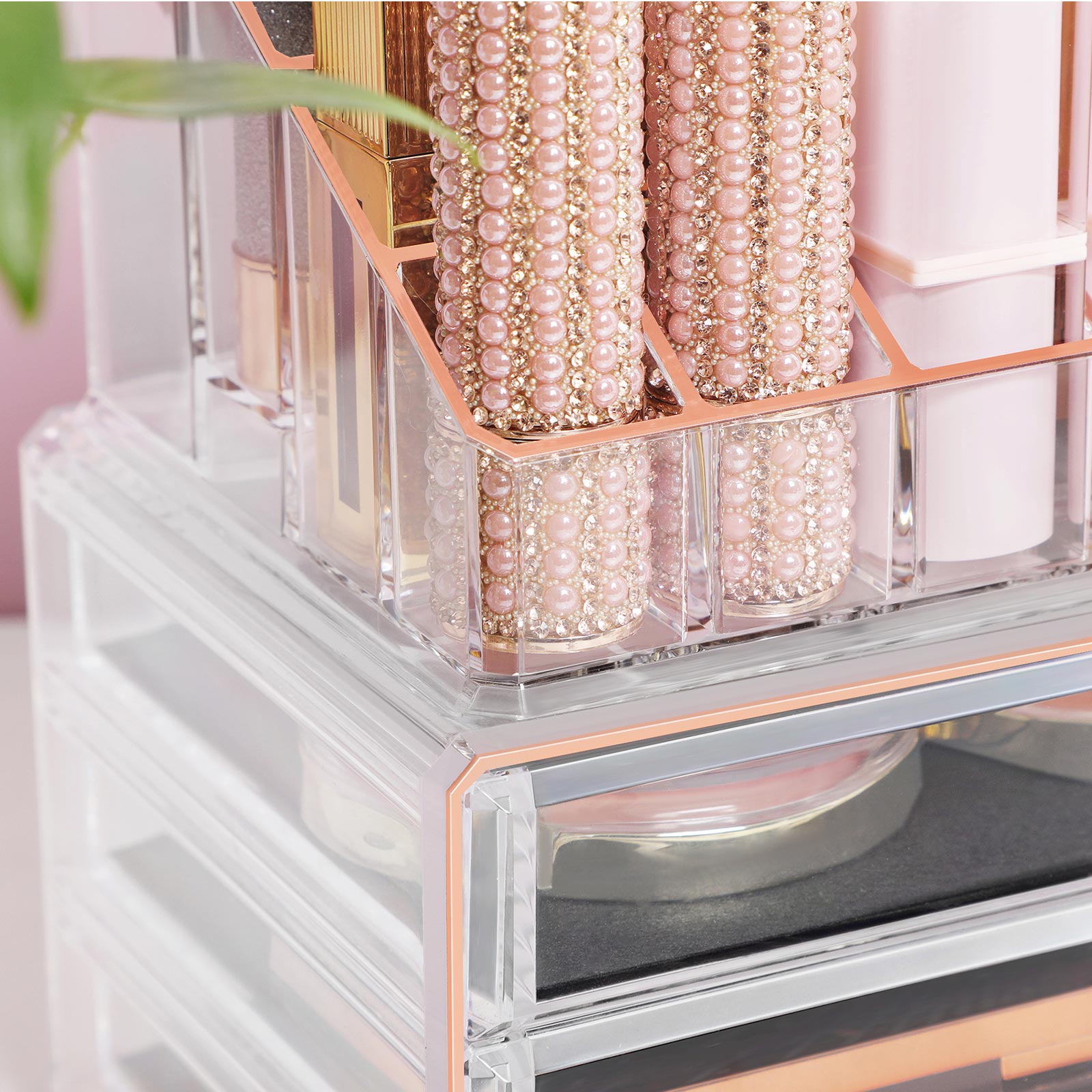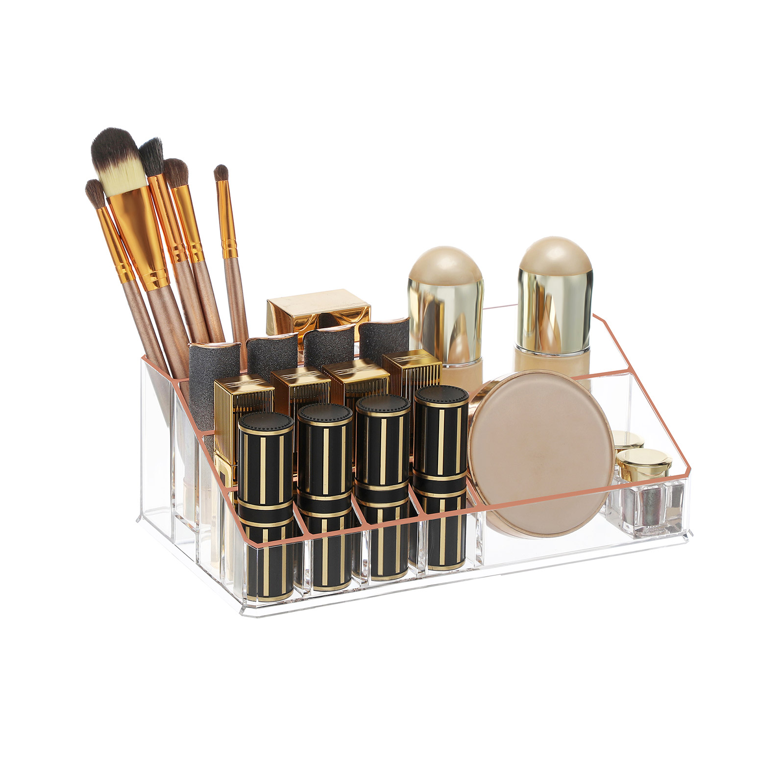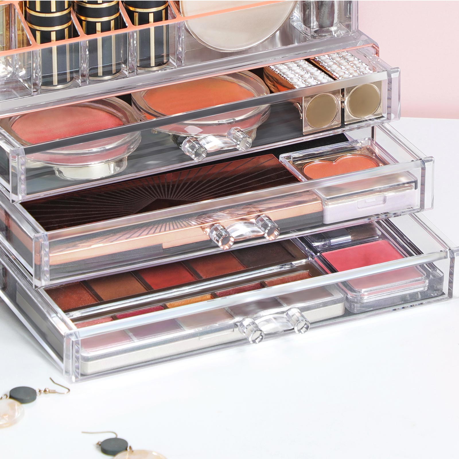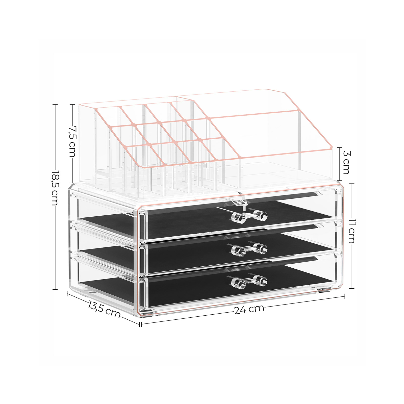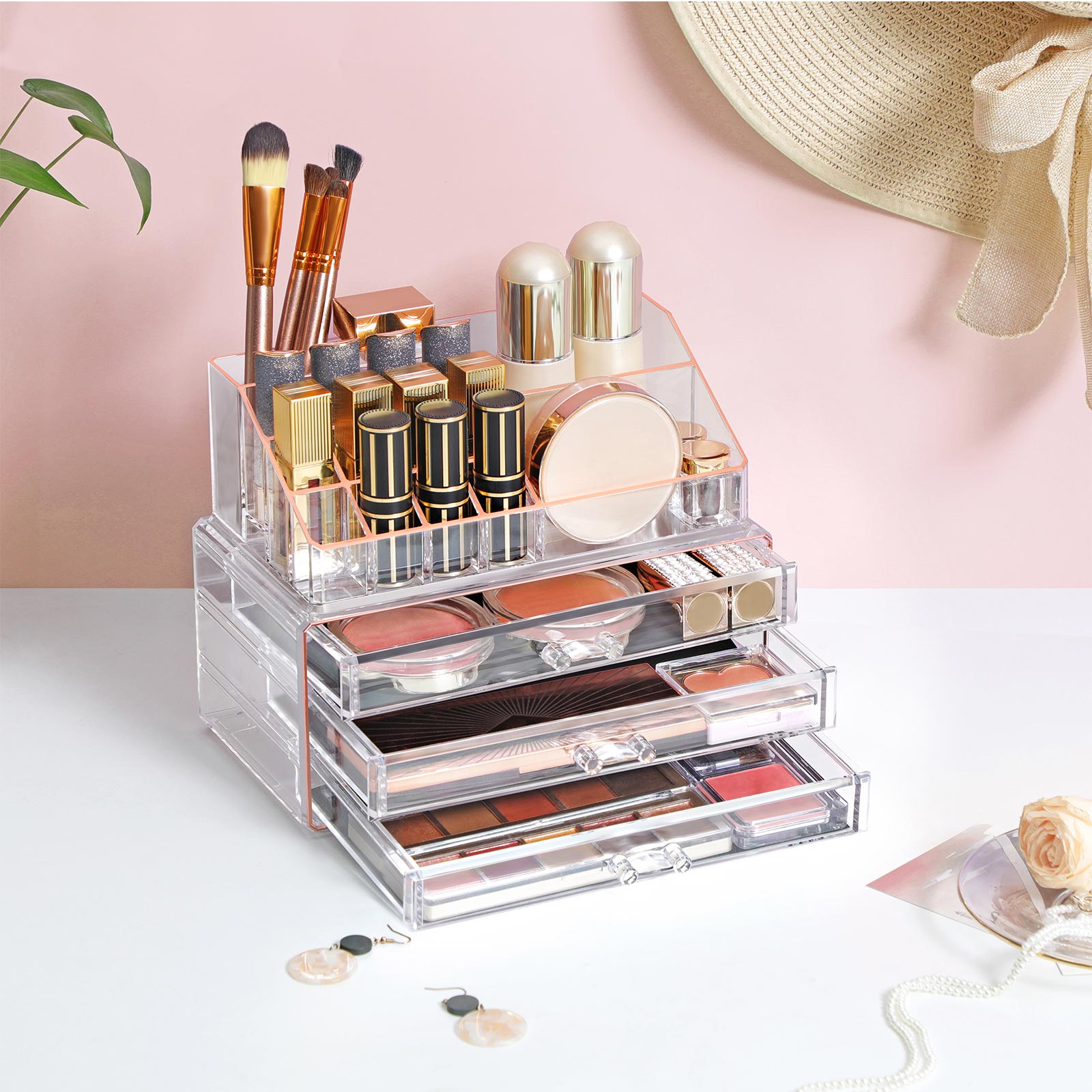 Bliv hurtigere klar om morgenen ?h nej, jeg er sent p? den igen! Vi har alle travlt om morgenen, men hvordan kan vi blive hurtigere klar? Med denne makeup-opbevaring fra SONGMICS kan du opbevare l?bestift, ?jenskygge eller pensler p? en ordentlig m?de. Du spilder ikke l?ngere tid p? at lede desperat efter de ting, du har brug for. Et hj?rne er nok Hvor fantastisk ? denne kosmetikopbevarer tilbyder s? meget opbevaringsplads, men tager kun meget lidt plads. Stabel den ?verste og nederste del oven p? hinanden for at befri dit toiletbord for kaos. Placer makeup-boksen i et hj?rne, s? har du alt, hvad du har brug for, p? ?t sted. Produktdetaljer:- Farve: Transparent rosaguld – Materiale: Polystyren – St?rrelse: 24 x 13,5 x 18,5 cm (L x B x H) – V?gt: 1,2 kg Leveringsomfang: – 1 x kosmetikopbevaringsboks SONGMICS Bem?rkninger: – Behandl produktet med forsigtighed.