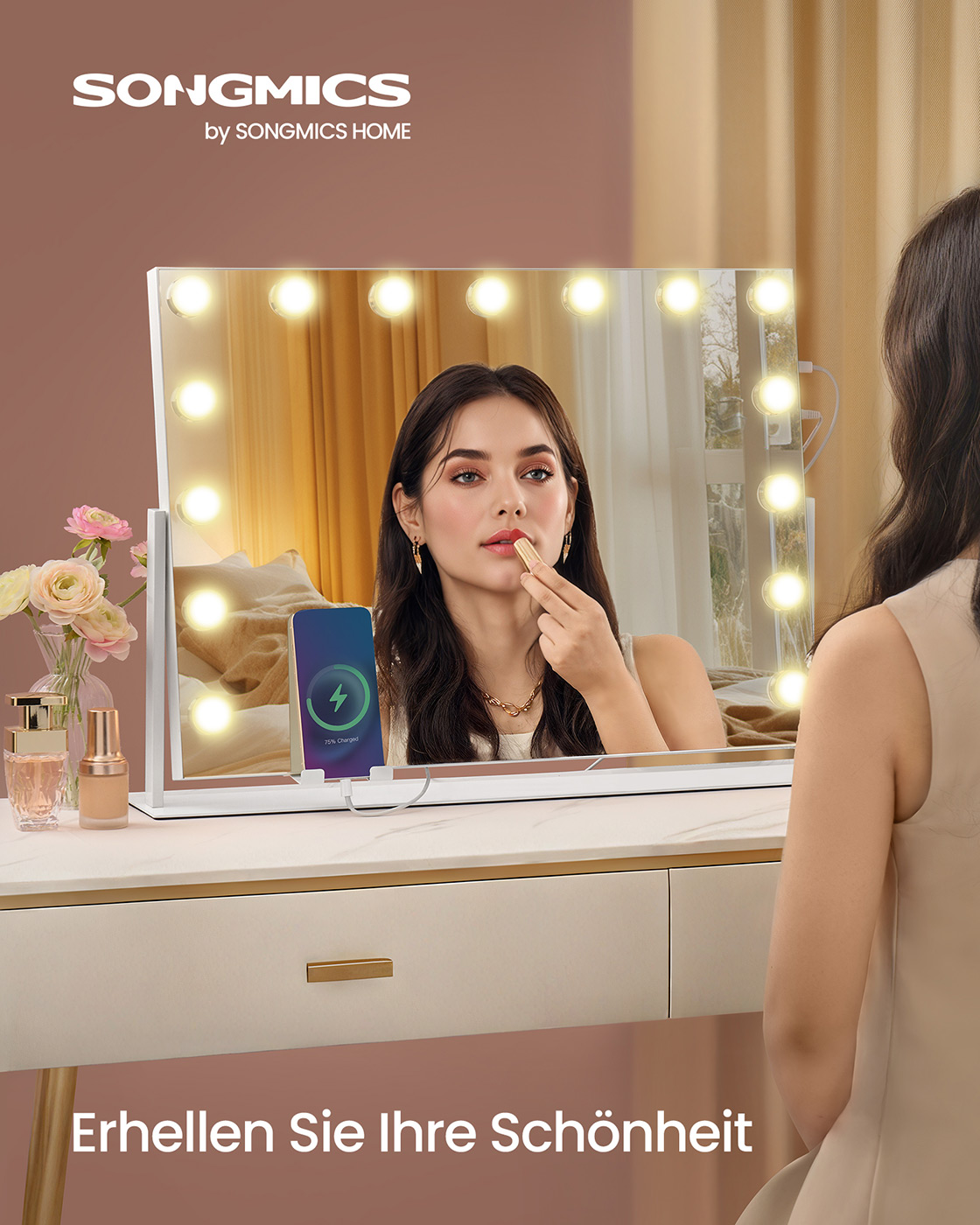 SONGMICS makeupspejl med belysning, kosmetikspejl med 15 LED-p?rer, med opladningsstik, touch-betjening, 3 lysfarver, d?mpbar, mobiltelefonholder, 58 x 43 cm, mat hvid LWM001W02