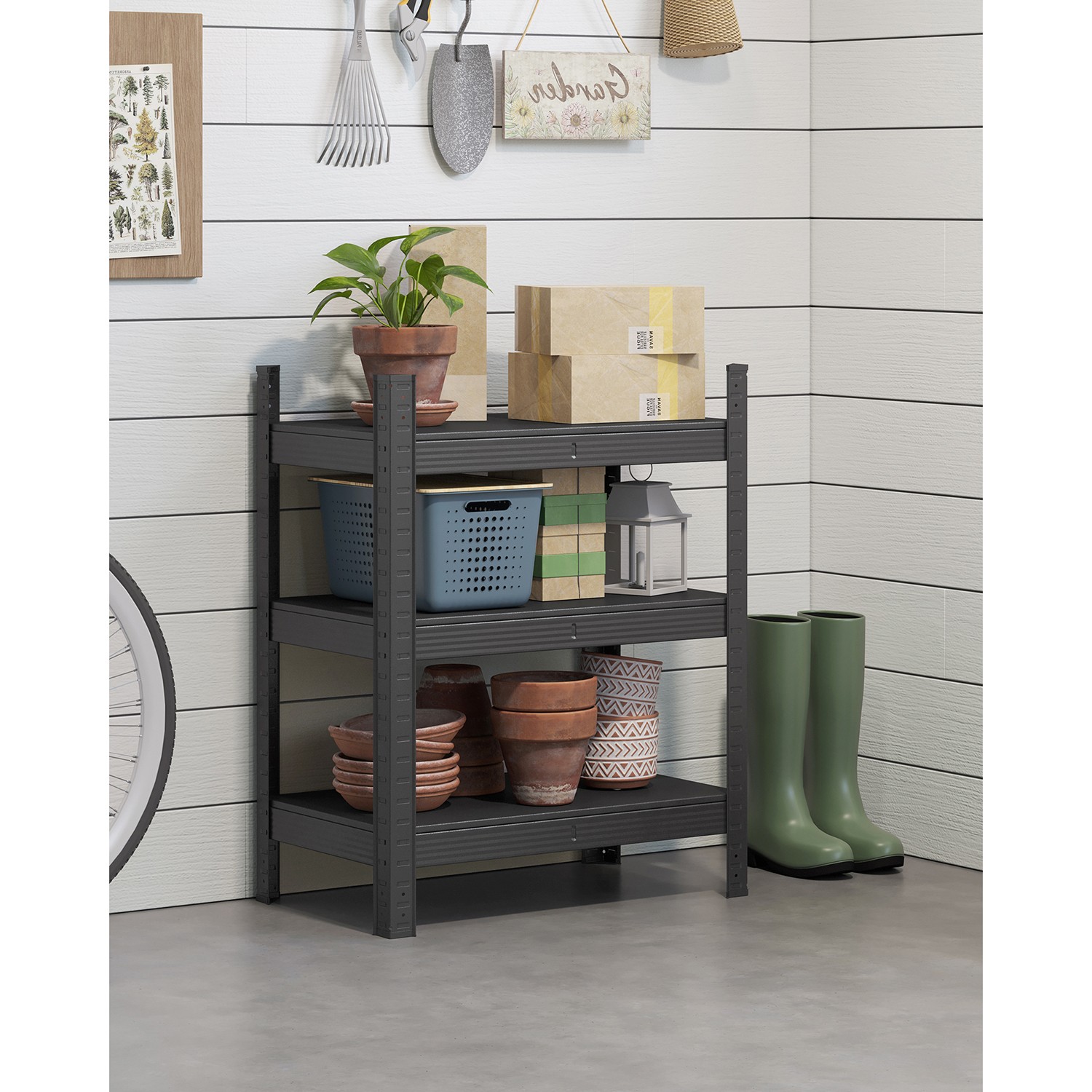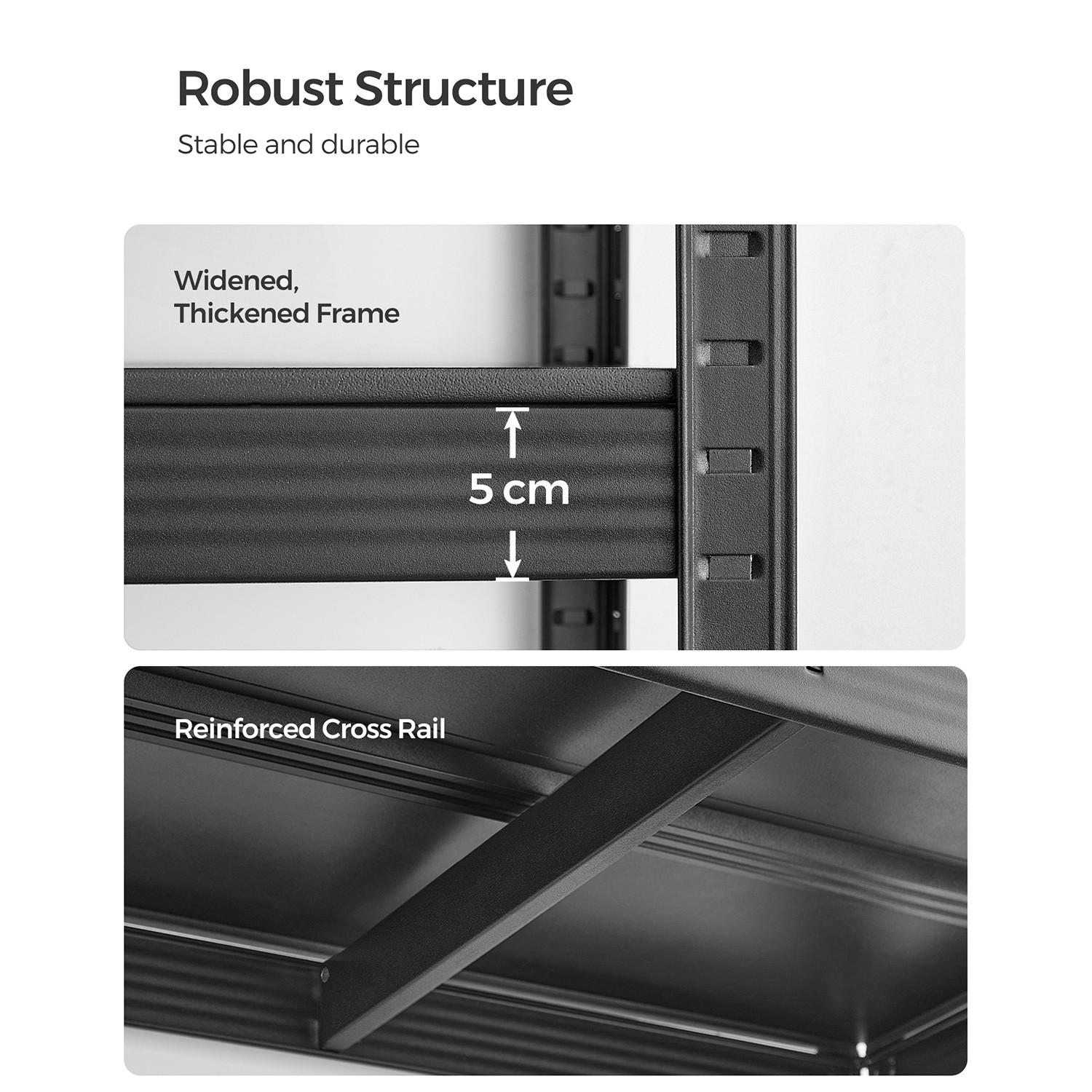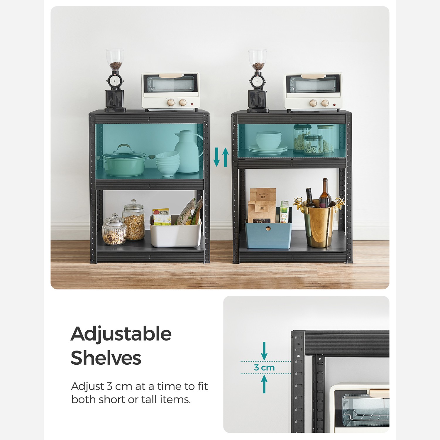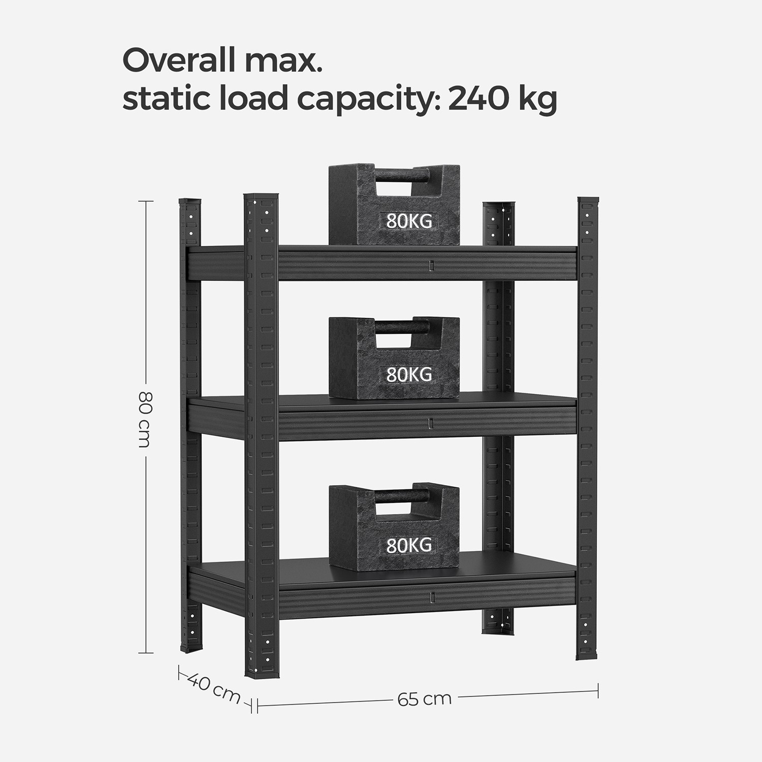Fordelene ved dette reol fra SONGMICS p? et ?jeblik: – St?lkonstruktionen giver stabil hold – De forst?rkede tv?rst?nger under hver metalhylde giver ekstra stabilitet – Den pulverlakerede overflade er rustbestandig og robust – Hver hylde kan b?re op til 80 kg – Hver hylde er h?jdejusterbar, s? den er fleksibel – Den medf?lgende tippesikring garanterer sikker og stabil brug – Velegnet til k?kkener, k?ldre, stuer, garager, altaner osv. Produktdetaljer: – Farve: Sort – Materiale: St?l – St?rrelse: 40 x 65 x 80 cm (D x B x H) – V?gt: 7 kg – Maks. statisk belastning pr. hylde: 80 kg – Maks. statisk belastning i alt: 240 kg Leveringsomfang:- 1 x opbevaringsreol – 1 x v?ltebeskyttelse – 1 x vejledning SONGMICS Bem?rkninger: – Fastg?r dette produkt til v?ggen med den medf?lgende v?ltebeskyttelse for at sikre sikker brug. – Brug altid handsker under montering. – Placer ikke produktet i et fugtigt milj?. – Den maksimale belastning i teksten refererer til den maksimale statiske v?gt.