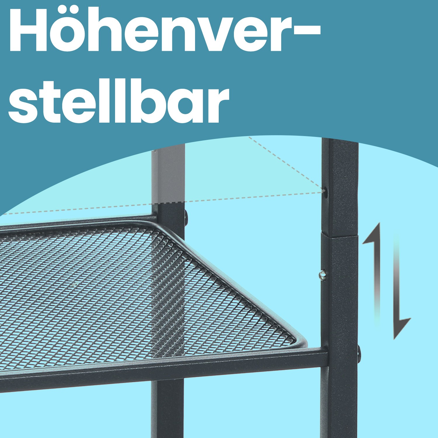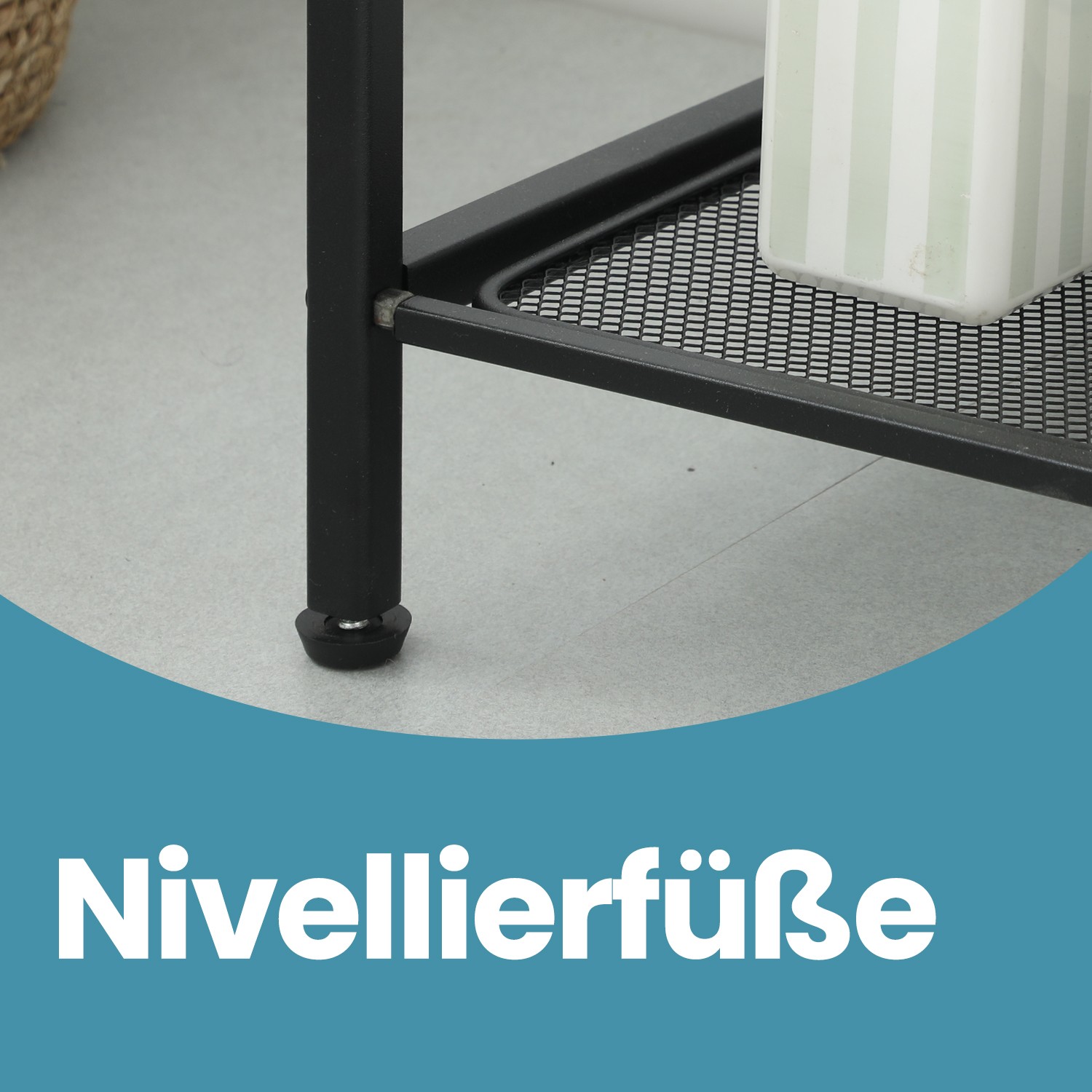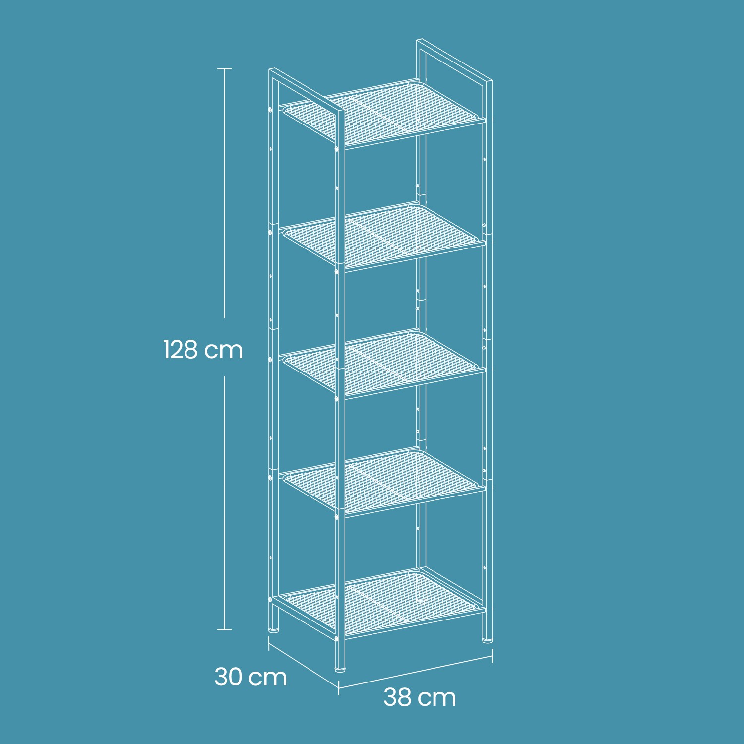 H?jdepunkterne ved dette badev?relsesreol i oversigt: – Takket v?re de h?jdejusterbare hylder kan du opbevare genstande i forskellige st?rrelser p? dette reol. – Du kan kombinere flere af disse reoler for at skabe mere opbevaringsplads. – Dette kompakte k?kkenreol optager kun lidt gulvplads. – Hver hylde p? dette plantehylde kan b?re en v?gt p? op til 10 kg.- De t?tmaskede gitterhylder giver badev?relsesreolen god stabilitet og b?reevne. – De justerbare f?dder udligner sm? uj?vnheder i gulvet. – Den enkle, forst?elige vejledning og de tydeligt m?rkede dele g?r det nemt at samle denne stativreol. – Denne reol er b?de stilfuld og praktisk og passer ind i forskellige rum. Produktdetaljer:- Farve: Sort – Materiale: St?l – St?rrelse: 38 x 30 x 128 cm (L x B x H) – V?gt: 3,3 kg – Maks. statisk belastning pr. hylde: 10 kg Leveringsomfang: – 1 x badev?relsesreol – 1 x tilbeh?rspakke – 1 x vippesikring – 1 x vejledning SONGMICS Bem?rkninger:- Ved montering af hver hylde skal de fire huller p? siderammen v?re i samme h?jde.
