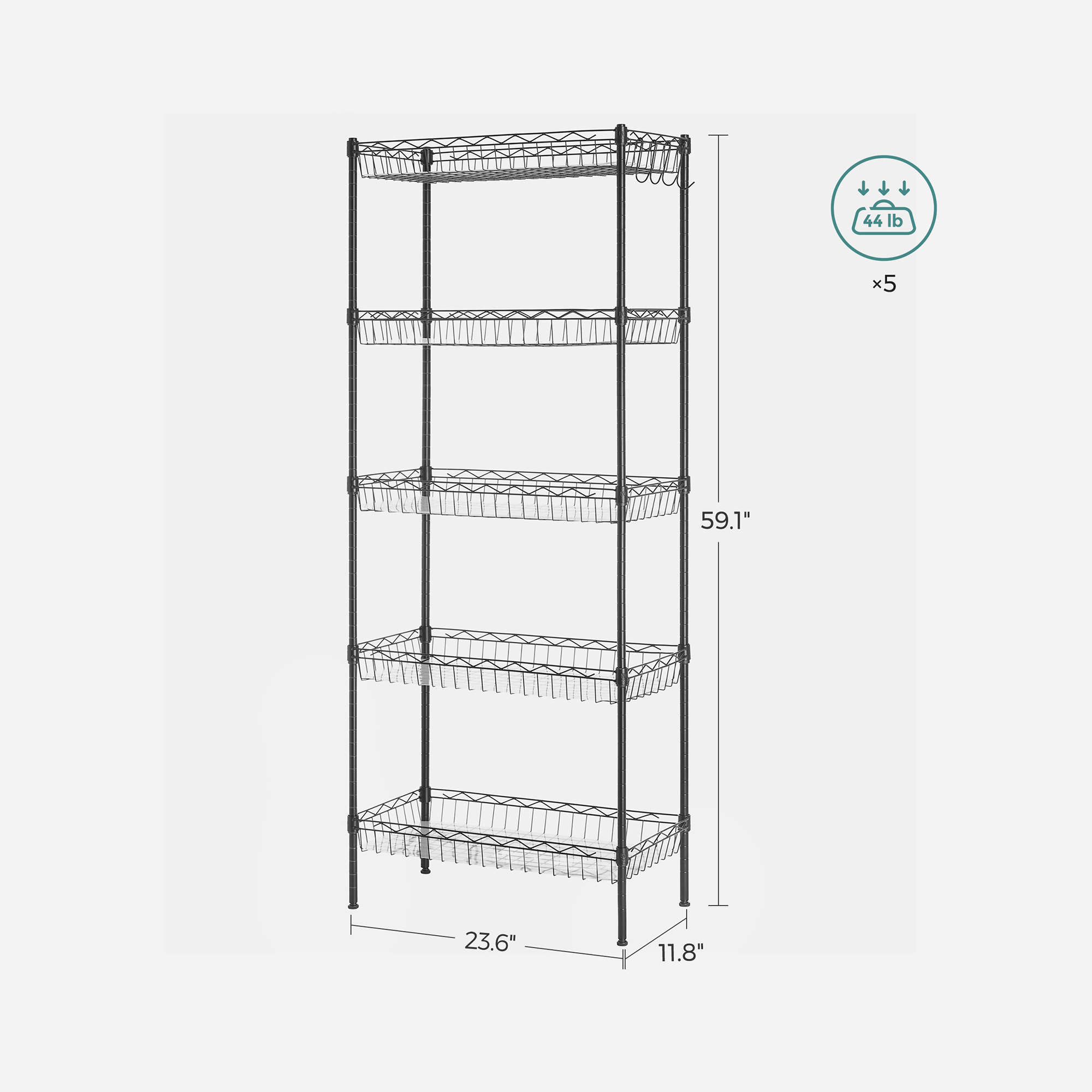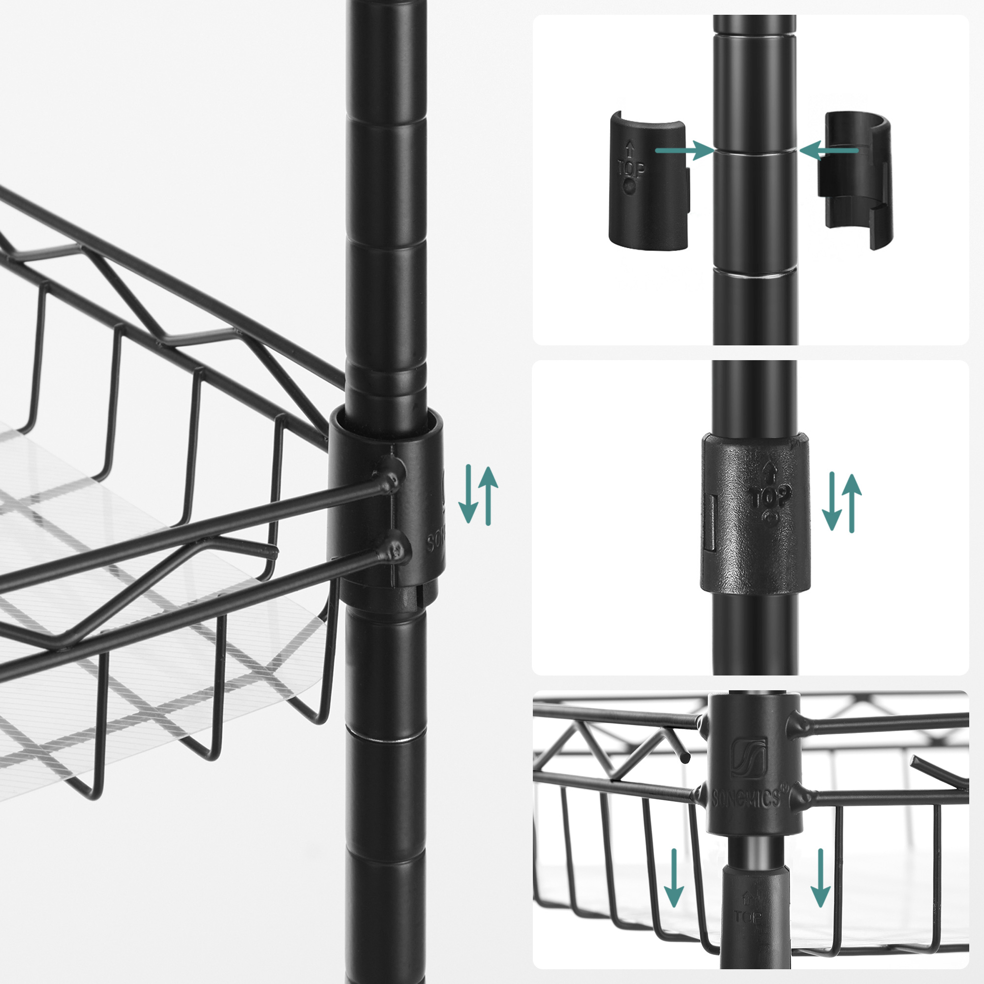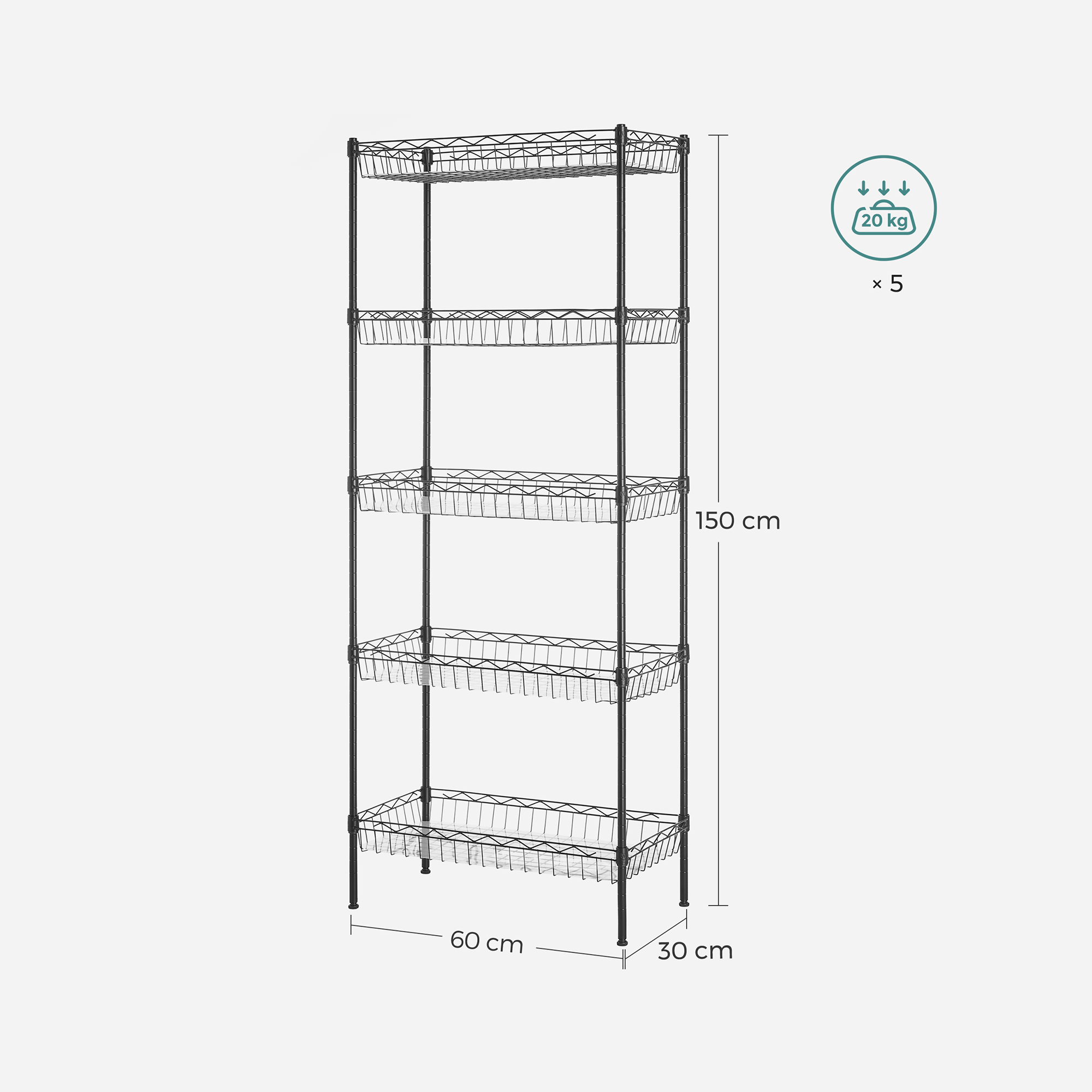 Produktdetaljer: Farve: Sort Materiale: St?l St?rrelse: 60 x 30 x 150 cm (L x B x H) V?gt: 5,4 kg Maks. statisk belastning pr. hylde: 20 kg Leveringsomfang: 1 x opbevaringsreol 5 x PP-plade 4 x krog 1 x vippesikring 1 x vejledning SONGMICS Bem?rkninger:Ved montering af plastklipsene skal TOP-pilen altid pege opad. Kontroller alle klips efter montering for at sikre, at de ikke kan bev?ges. S?rg for, at fastg?relsesklipsene er fastgjort i samme h?jde p? de 4 r?r, s? hylderne er i vandret position. Den maksimale statiske belastning pr. hylde er 20 kg. Denne maksimale v?gt m? ikke overskrides. Fastg?r produktet til v?ggen med v?gbeskyttelsen for at sikre sikker brug.