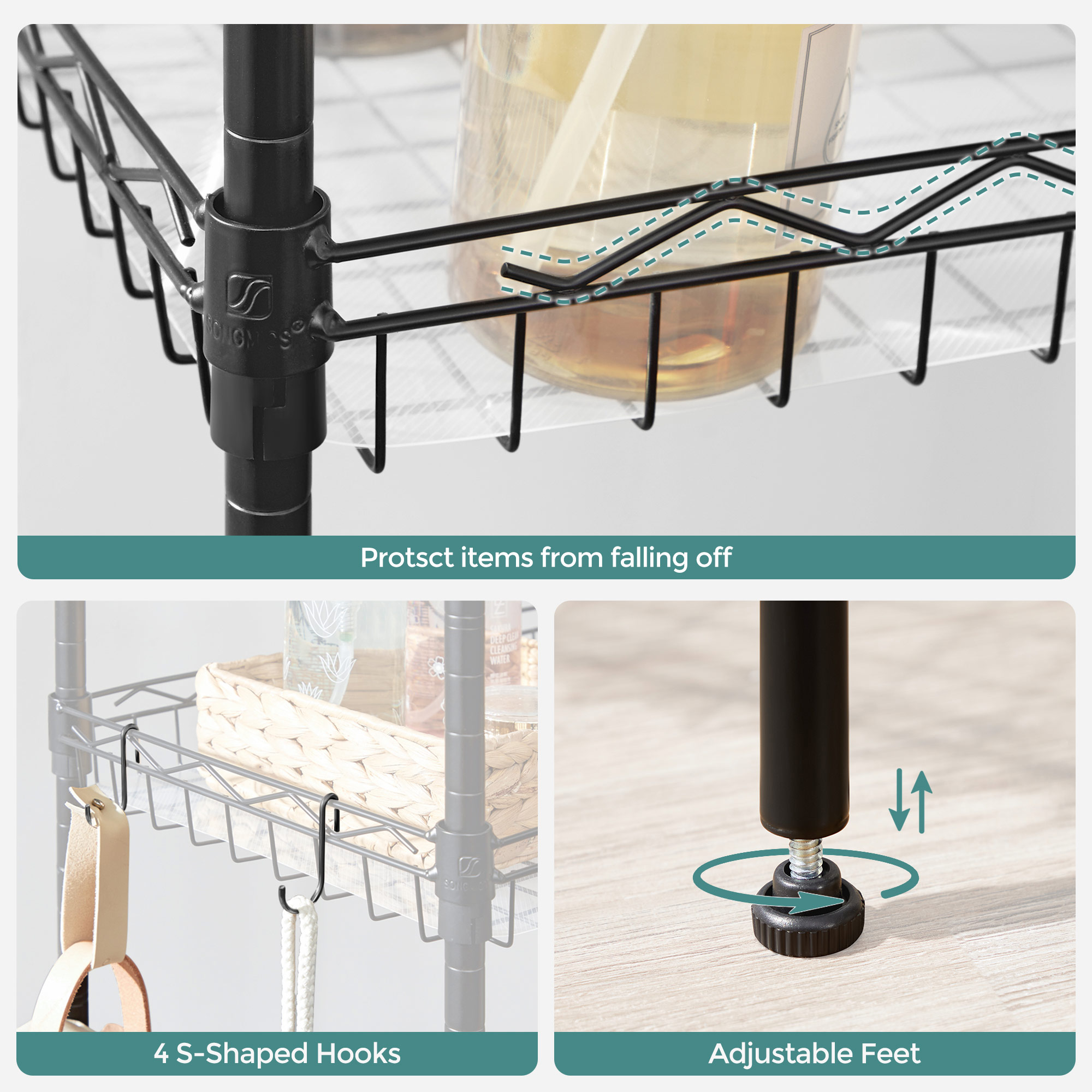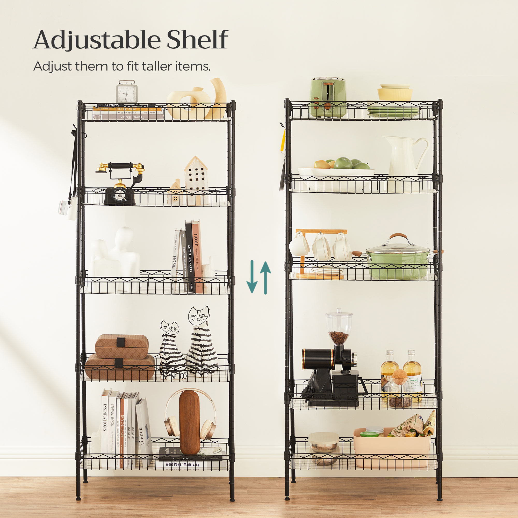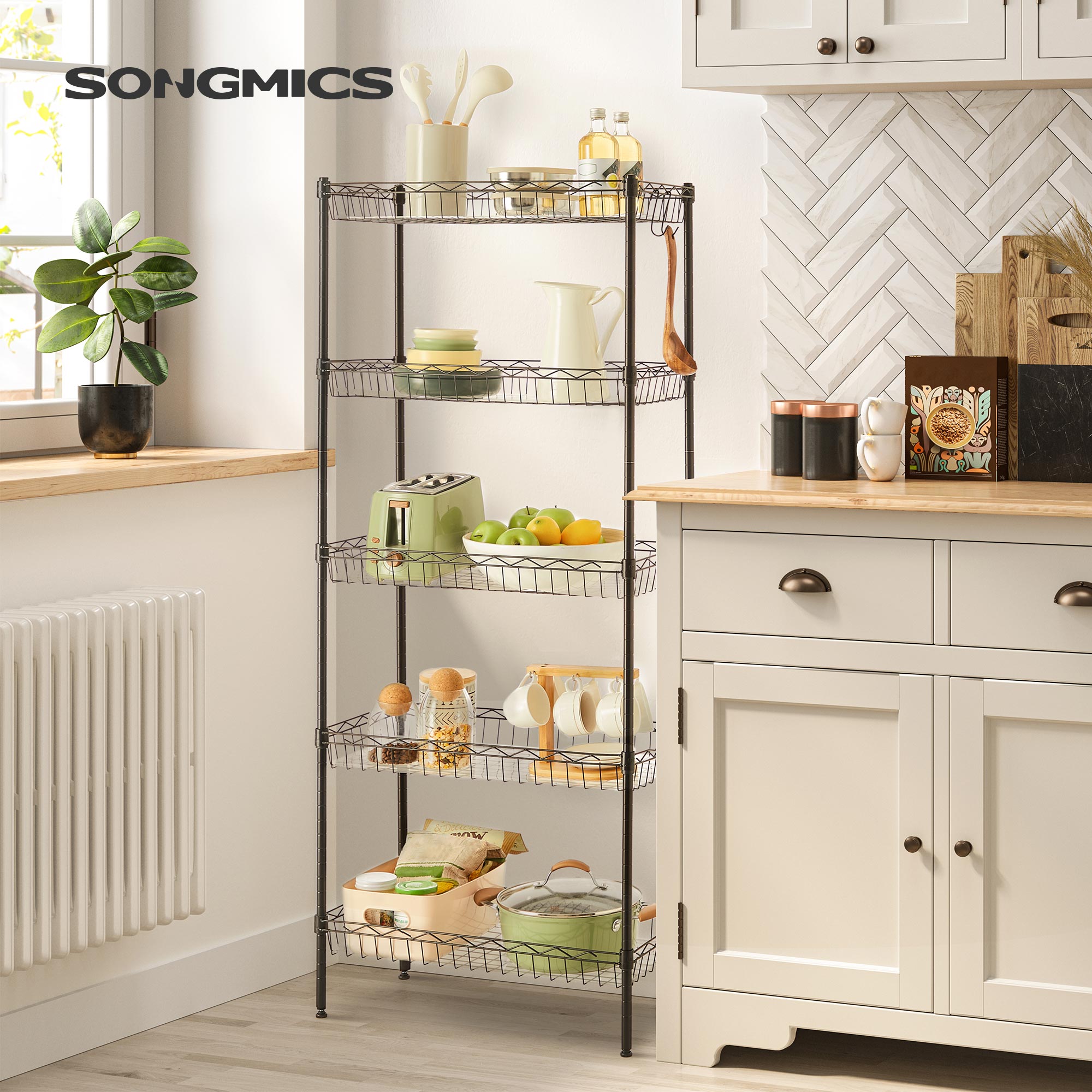 Produktdetaljer: Farve: Sort Materiale: St?l St?rrelse: 60 x 30 x 150 cm (L x B x H) V?gt: 5,4 kg Maks. statisk belastning pr. hylde: 20 kg Leveringsomfang: 1 x opbevaringsreol 5 x PP-plade 4 x krog 1 x vippesikring 1 x vejledning SONGMICS Bem?rkninger:Ved montering af plastklipsene skal TOP-pilen altid pege opad. Kontroller alle klips efter montering for at sikre, at de ikke kan bev?ges. S?rg for, at fastg?relsesklipsene er fastgjort i samme h?jde p? de 4 r?r, s? hylderne er i vandret position. Den maksimale statiske belastning pr. hylde er 20 kg. Denne maksimale v?gt m? ikke overskrides. Fastg?r produktet til v?ggen med v?gbeskyttelsen for at sikre sikker brug.