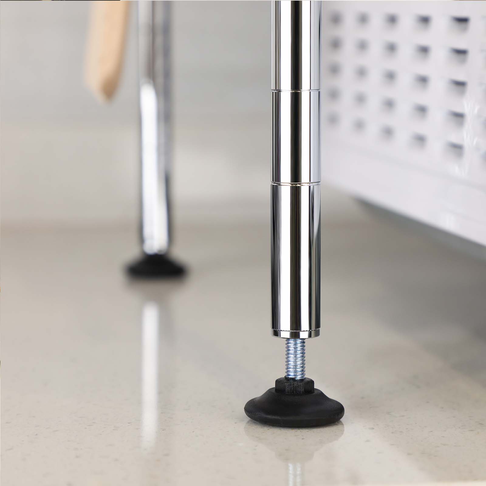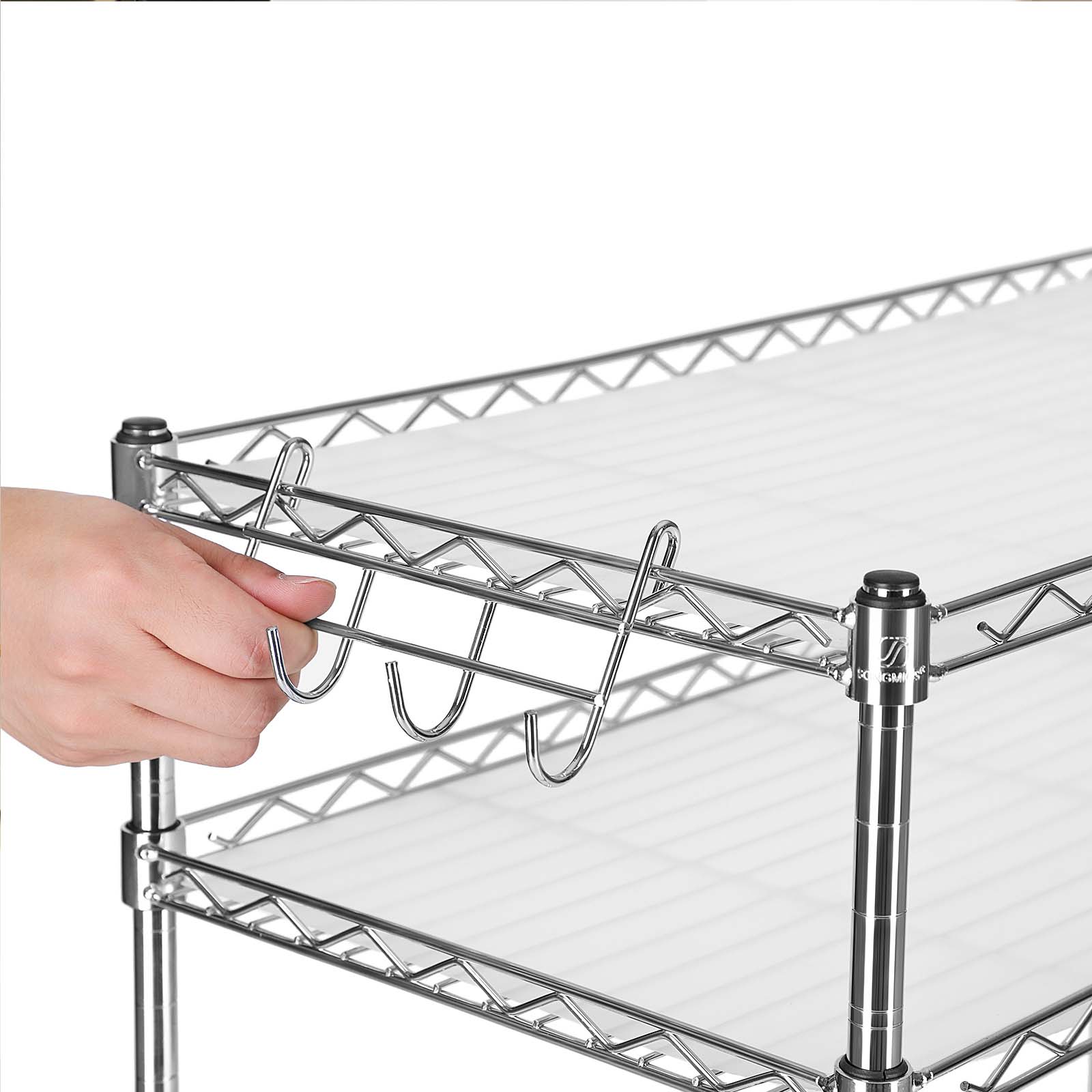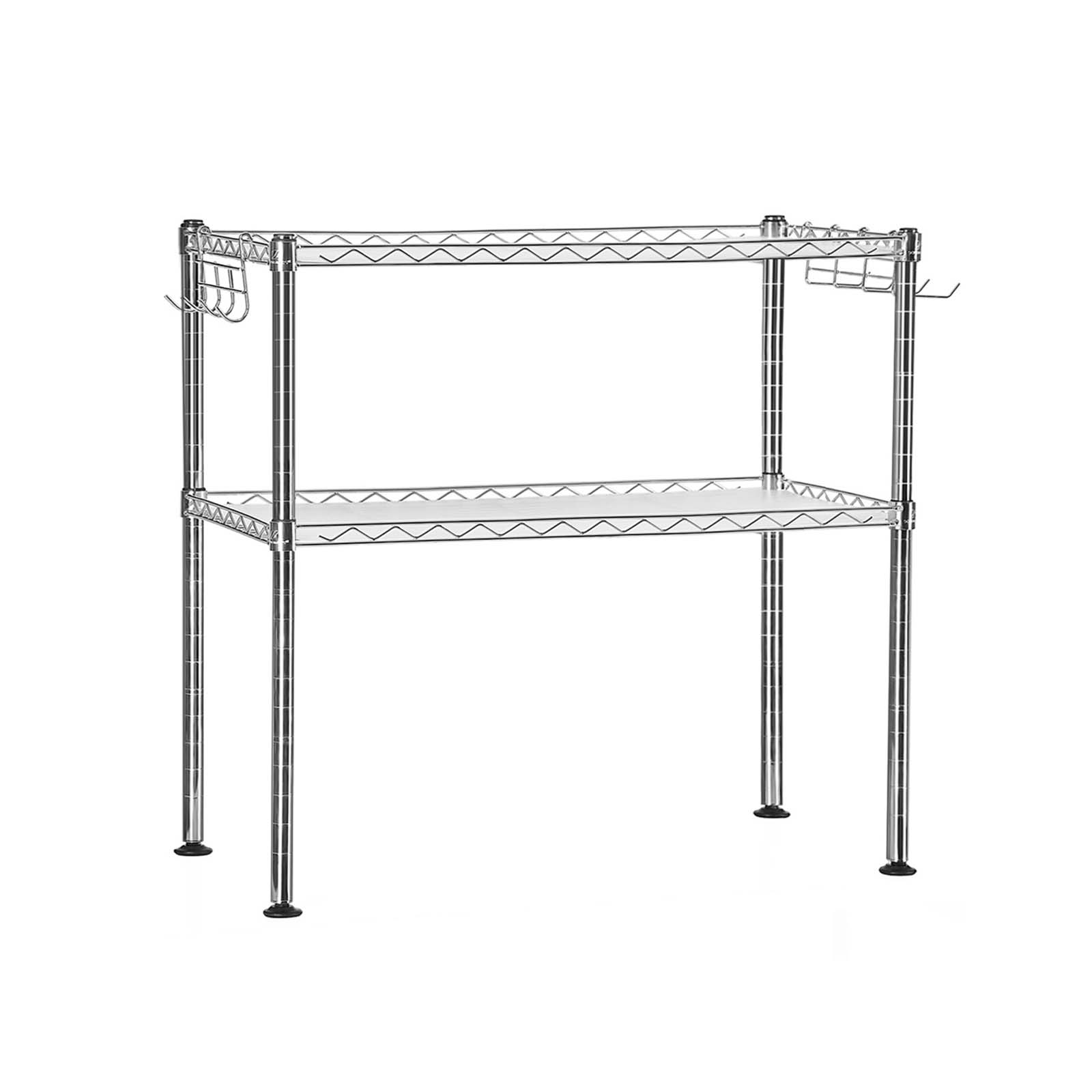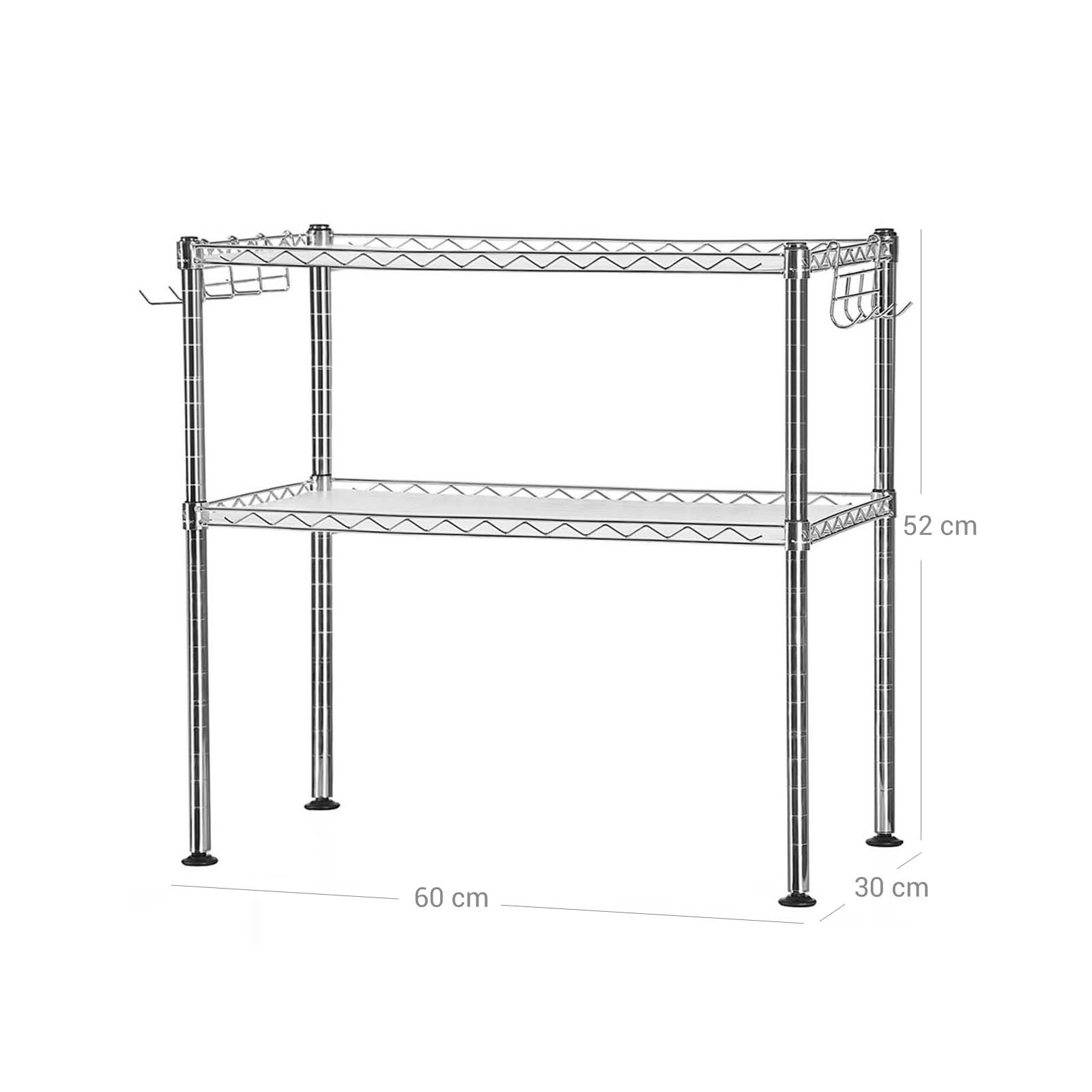 Denne lille hylde er s?rligt velegnet, n?r der er brug for ekstra hyldeplads eller opbevaringsmuligheder i sm? k?kkener. For eksempel kan en mikrob?lgeovn placeres p? hylden. Endelig ligger der ikke l?ngere noget direkte p? mikrob?lgeovnen, og der er ogs? plads til et par ting fra bordpladen p? hylden, s? der igen er mere plads. Dette lille k?kkenhylde kan ogs? bruges til andre form?l, f.eks. til opbevaring af b?ger, mapper, cd’er osv. Bem?rkninger:- Monter kroge efter monteringsvejledningen. – S?rg for, at st?rrelsen er tilstr?kkelig til dit apparat, n?r du k?ber det. Produktdetaljer: – M?l: 60 x 52 x 35 cm (B x H x D) – Farve: s?lvfarvet – Materiale: forkromet jernr?r + PP-plast – Maks. belastbarhed pr. hylde: 2,6 kg – Bruttov?gt: 3,2 kg – Emballagem?l: 62 x 32 x 6,3 cm Leveringsomfang: – 1 x k?kkenreol med 2 hylder – 1 x vejledning (DE, EN, FR, IT, ES)