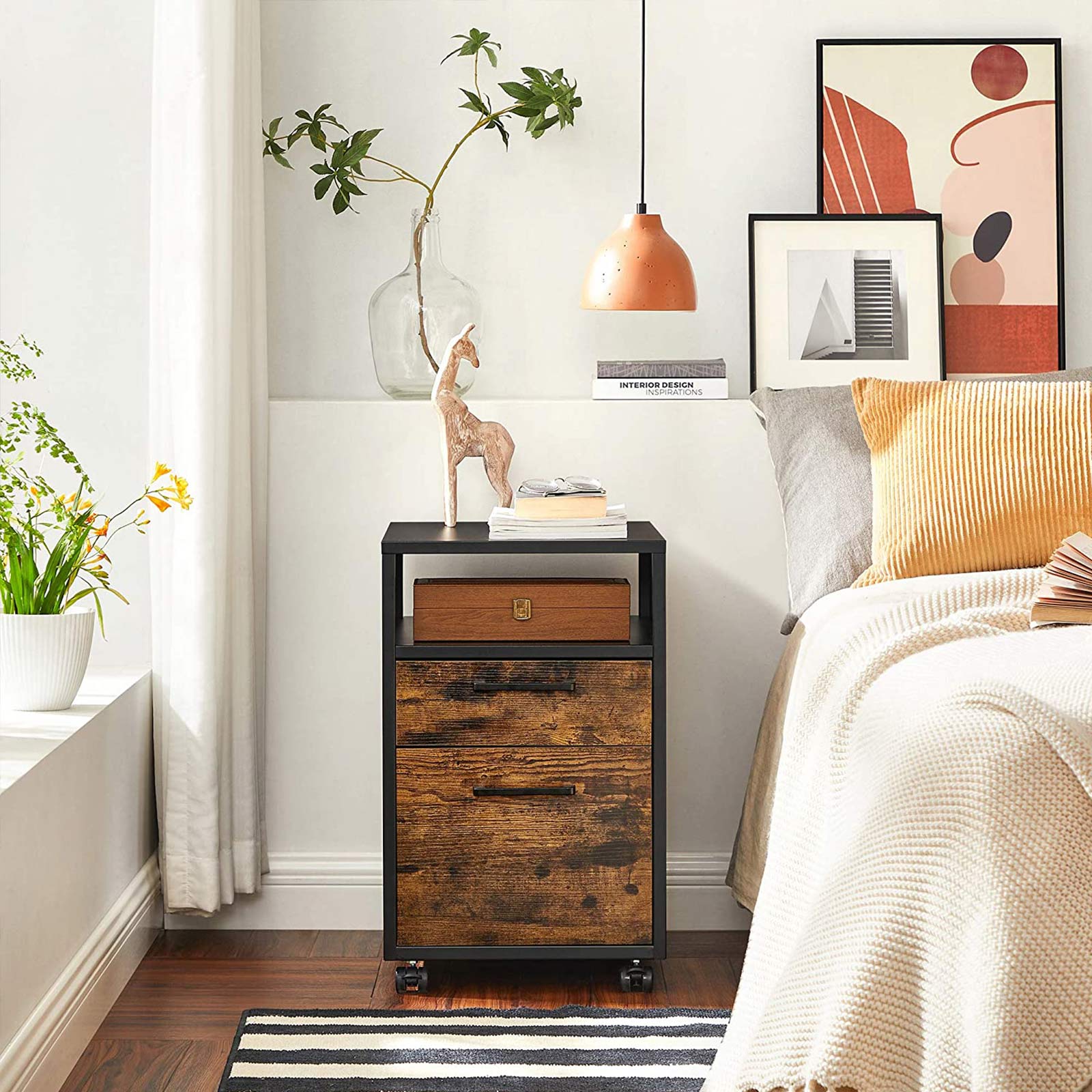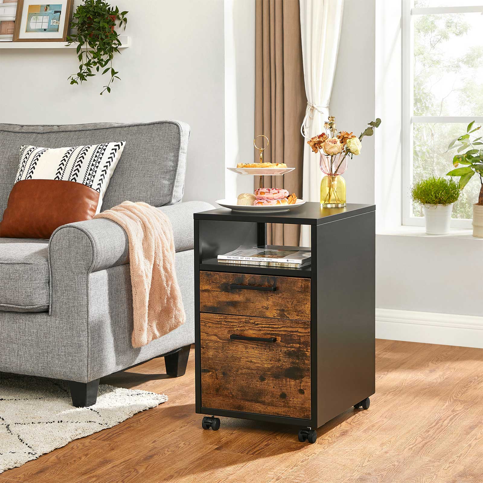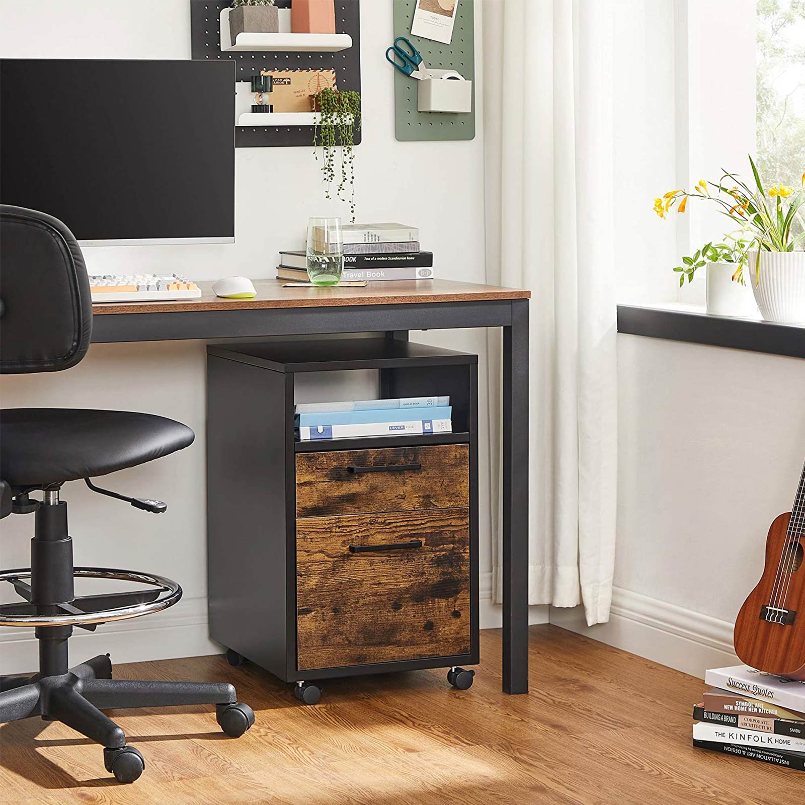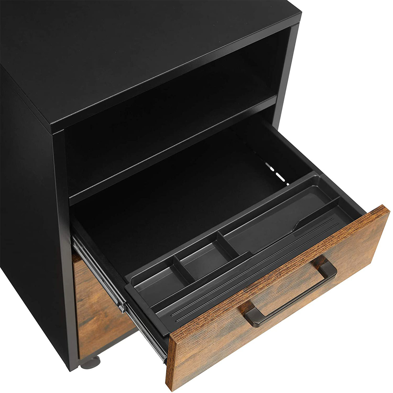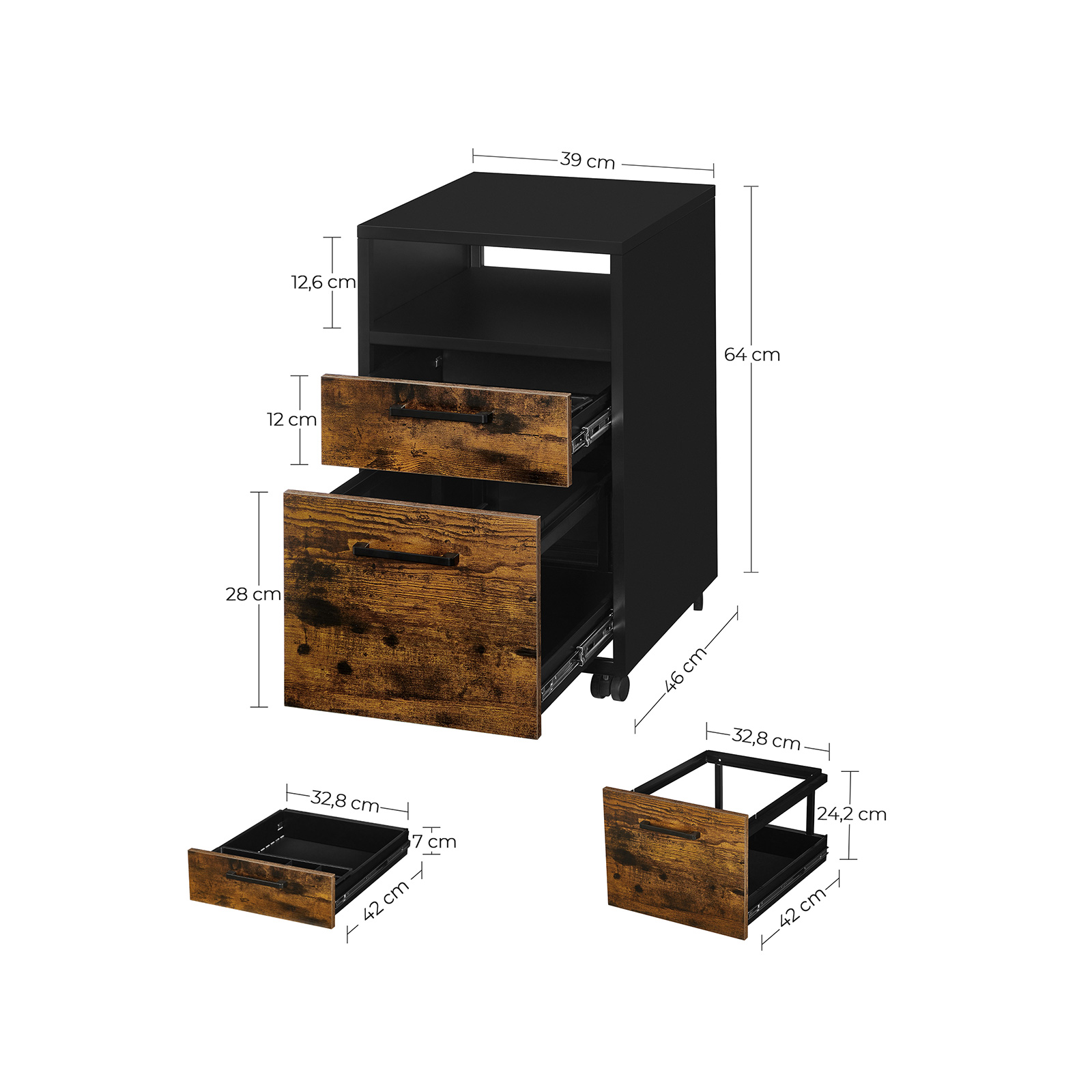 F? den n?dvendige opbevaringsplads: Ligger dine papirer spredt ud over dit skrivebord? Spild ikke mere tid p? at lede. S?t dette SONGMICS arkivskab op! En hylde ?verst, et ?bent rum, 2 skuffer, en h?ngemappe og en skuffeindsats ? forvandl dit hjemmekontor til et sandt opbevarings- og pr?sentationsvidunder med dette skab. Kan du lide denne stil? De tr?farvede skuffer og det sorte st?lstel udg?r tilsammen et vidunderligt arkivskab, der b?de er trendy og tidl?st. Produktdetaljer: Farve: Vintagebrun-sort Materiale: St?l, sp?nplade St?rrelse: 39 x 46 x 64 cm (L x B x H) V?gt: 16,8 kg Maks. statisk belastning pr. skuffe: 15 kg Maks. statisk belastning af det ?bne rum: 20 kg Maks. statisk belastning af overfladen: 50 kg Leveringsomfang: 1 x arkivskab 1 x skuffeorganizer til kontorartikler 1 x h?ngemappe 1 x tilbeh?rspakke 1 x vejledning SONGMICS Bem?rkninger:Af sikkerhedsm?ssige ?rsager er det forbudt for b?rn at klatre op p? produktet eller lege med det. Dette produkt har ikke en ekstra rulle p? den nederste skuffe, der beskytter mod v?ltning. Af sikkerhedsm?ssige ?rsager m? begge skuffer ikke ?bnes samtidigt.