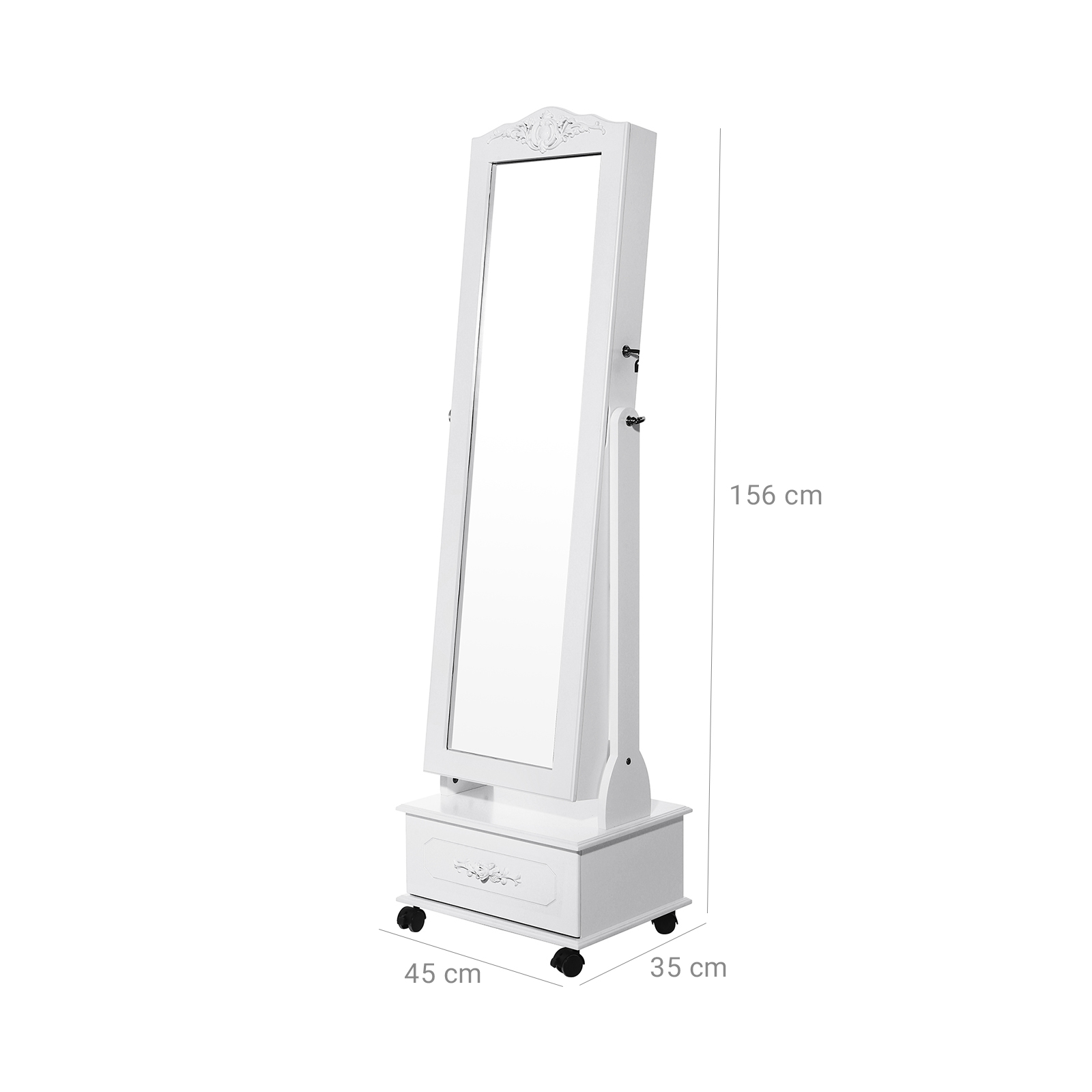 Dette smykkeskab vil forsk?nne dit hjem. Smykkeskabet med stor opbevaringsplads giver dit hjem en stemningsfuld note. Bag det fine garderobespejl er der et stort indvendigt rum, hvor der kan opbevares mange accessories. Det er en ideel gave til din familie eller venner. Bem?rkninger:- Spejlet er skr?beligt, s? behandl det med forsigtighed, og beskyt skabet mod at v?lte for at undg?, at spejlet g?r i stykker. – Batterierne til belysningen, som er AAA LR03, er IKKE inkluderet i leveringen! – Hvis du ikke bruger LED-belysningen i l?ngere tid, skal du tage batterierne ud. Produktdetaljer:- Farve: hvid – Materiale: milj?venlig MDF-plade – M?l: 45 x 156 x 45 cm (B x H x D) – M?l p? skab: 37 x 126 x 9,5 cm (B x H x D) – M?l p? skuffe (indvendig, lille): 15,5 x 4 x 4 (B x H x D) – M?l p? skuffe (udvendig, stor): 35,5 x 12,5 x 28,5 cm (B x H x D) – M?l p? spejl: 27 x 111 cm (B x H)