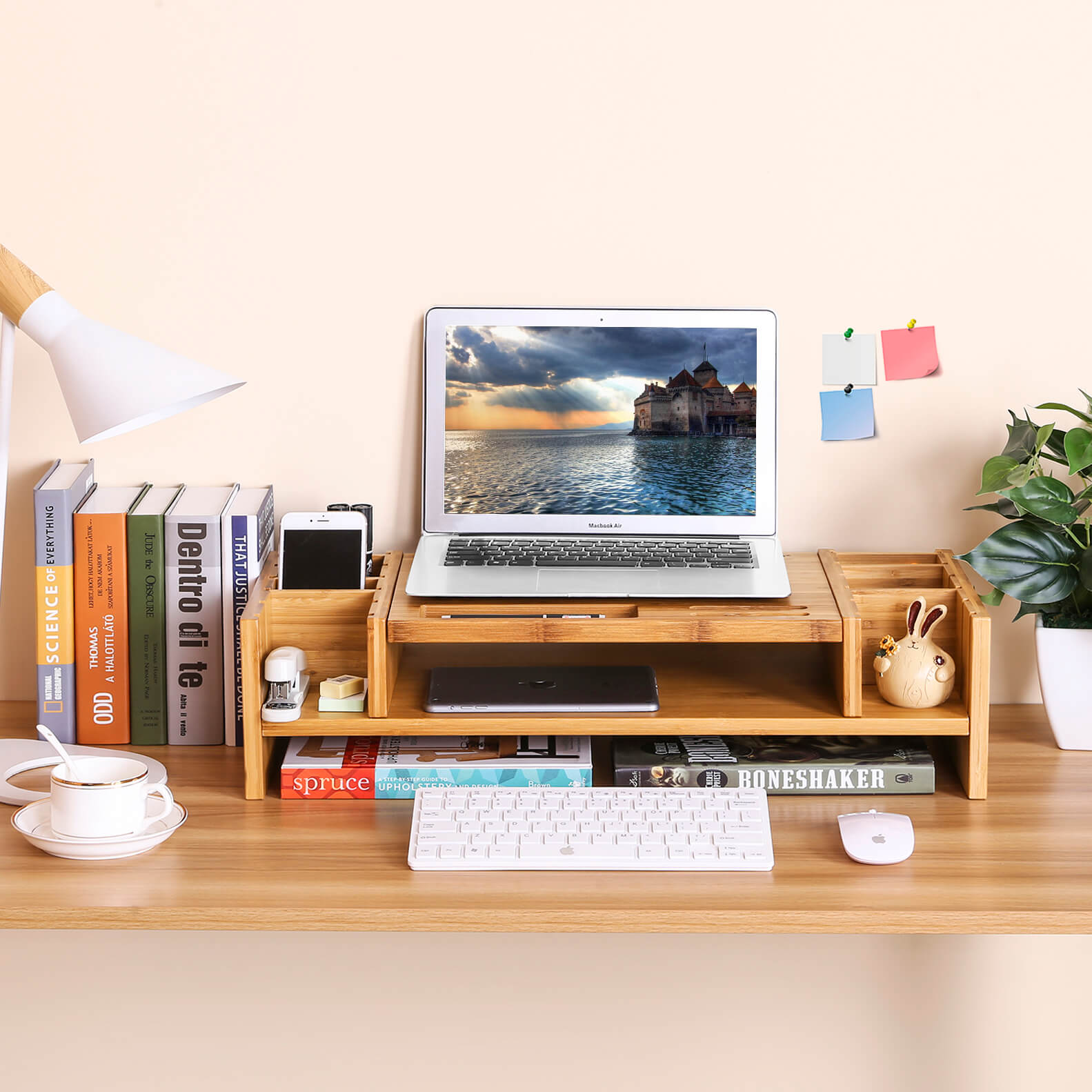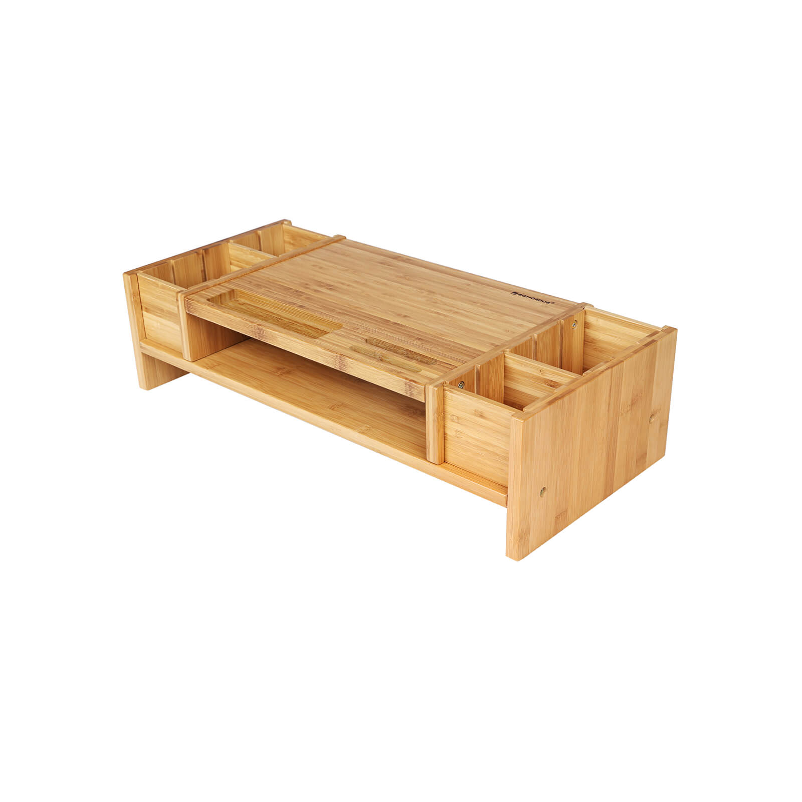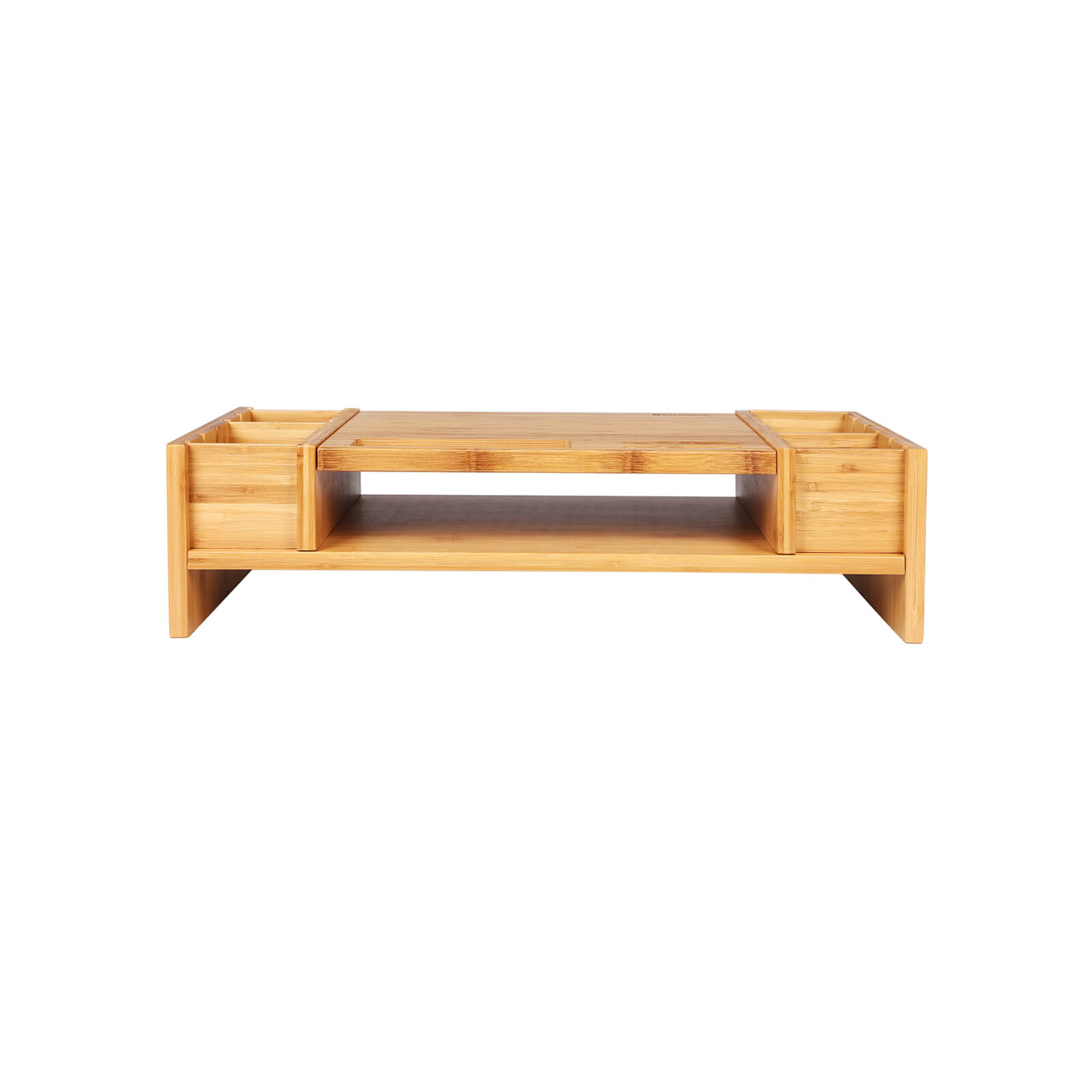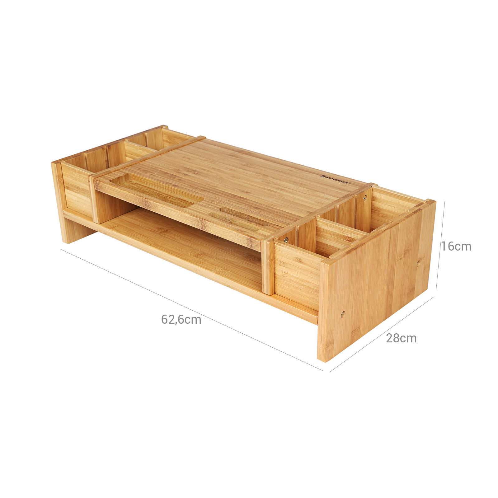 Studer eller arbejd uden at belaste din krop Kropsholdning er det vigtigste punkt, man skal tage h?jde for, n?r man arbejder ved et skrivebord. Den ergonomiske sk?rmh?jder er et af de grundl?ggende redskaber, der giver dig mulighed for at arbejde sikkert og uden bekymringer for dit helbred, effektivt, produktivt og med den n?dvendige komfort ved skrivebordet. Denne forbedrede arbejdsstilling afsp?nder nakke- og rygmusklerne og reducerer sp?ndingerne betydeligt. Dette giver dig mulighed for at v?re mere produktiv og samtidig forblive sund. Sk?n dig selv! Betydelig pladsbesparelse med ?stetisk talent Den smukt bearbejdede monitorholder giver ekstra plads p? dit skrivebord, for under sk?rmen f?r du en ny opbevaringsplads til dine kontorartikler. Flere tilg?ngelige positioner giver dig mulighed for at opbevare dine yndlingsgenstande (tablet, mobiltelefon, glas, kuglepen osv.). I midten kan du placere h?fter, mapper og ringbind. Takket v?re de aftagelige skillev?gge er der 6 forskellige muligheder i siderne, og til sidst finder du nedenunder et opbevaringsrum til din tastatur og mus. Bambus, fremtidens vedvarende ressource Bambus er en ?kologisk ressource fra Asien, da den under de bedste betingelser vokser 1 m om dagen. Bambus er det perfekte alternativ til at bek?mpe den massive skovrydning. Dette p?s?t til skrivebordsmonitoren er ?stetisk. Produktdetaljer: – Farve: natur – Materiale: bambus – Produktm?l: 62,6 x 16 x 28 cm (B x H x D) – V?gt: 4,26 kg – Belastbarhed: 36 kg – Til alle sk?rme eller b?rbare computere Leveringsomfang: – 1 x sk?rmholder – 1 vejledning (DE, EN, FR, ES, IT) – 1 x beslagspose