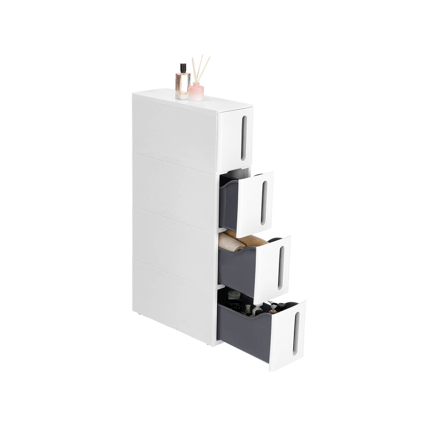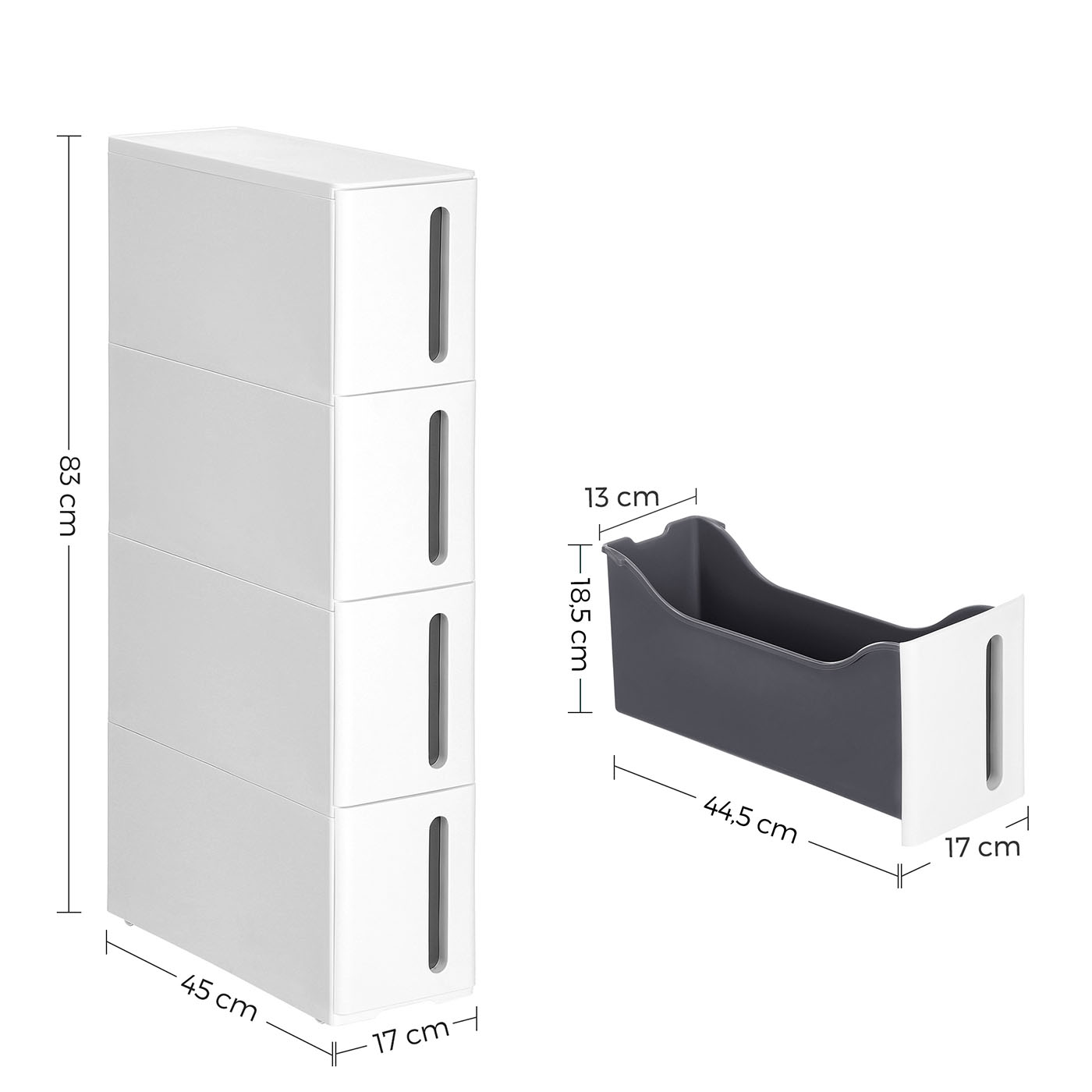 Du ved ikke l?ngere, hvor du skal g?re af dine badev?relses- eller k?kkenredskaber, og dit kontor ligner en bjerg af stablede papirer ? men egentlig har du slet ikke mere plads i disse rum?Det plastiske rullehylde fra SONGMICS passer perfekt i enhver niche takket v?re det smalle 17 cm design og sikrer pladsbesparende opbevaringsplads i stuen, badev?relset, k?kkenet eller kontoret. Stor kapacitet: I 4 dybe skuffer kan du f.eks. opbevare f?devarer, drikkevarer, bageingredienser, badev?relsesartikler, dekorationsartikler, kontorartikler eller andre ting. Udnyt pladsen i din bolig effektivt! Smart og praktisk design: Den smarte stopmekanisme sikrer, at skufferne ikke kan tr?kkes helt ud. Fremstillet af vandt?t PP og kan derfor bruges i badev?relset, k?lderen, vaskerummet eller k?kkenet.Det enkle og klare design af nicherillen g?r, at den passer perfekt ind i dine rum. Produktdetaljer: Farve: Hvid-gr? Materiale: PP-plast (polypropylen) Samlet st?rrelse: 45 x 17 x 83 cm (D x B x H) Indvendig st?rrelse pr. skuffe: 44,5 x 13 x 18,5 cm (D x B x H) V?gt: 4,6 kg Leveringsomfang: 1 x nicheramme med hjul 1 x vejledning SONGICs bem?rkninger:For at undg? skader b?r produktet ikke monteres eller demonteres flere gange.