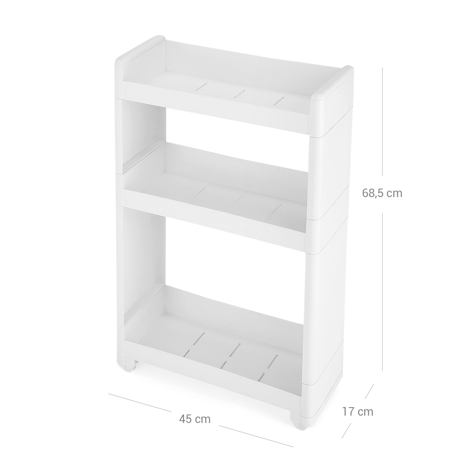 Smal reol til hj?rner og nicher: Med en bredde p? 17 cm passer reolen ind i hj?rner og nicher og tilbyder masser af plads. Med enkle hjul kan den hurtigt k?res frem og tilbage, og med det robuste materiale holder den i flere ?r i k?kkenet, badev?relset, k?lderen eller opbevaringsrummet.Masser af plads i opbevaringsrum: 3 opbevaringsrum med en h?jde p? 33,8 cm og 22,8 cm. S? der er ogs? plads til st?rre f?devarer, b?ger eller badev?relsesudstyr p? reolen. Robust reol p? hjul: De enkle 4 hjul g?r det muligt at skubbe reolen frem og tilbage, s? den er nem at h?ndtere og ikke h?nger fast. Takket v?re PP-plast er det meget robust og let at vedligeholde, da det nemt kan vaskes af med vand.Produktdetaljer: Farve: hvid Materiale: PP-plast Produktm?l: 45 x 17 x 68,5 cm (B x D x H) V?gt: 1,75 kg Belastbarhed: 15 kg Leveringsomfang: 1 x nicheramme 1 x vejledning (DE, EN, IT, FR, ES) SONGMICS Bem?rkninger:Det anbefales at placere denne hylde i en niche af passende st?rrelse, s? den f?r st?rre stabilitet. Du undg?r skader p? hylden og sikrer en fast forbindelse mellem forbindelsesdelene, hvis du IKKE monterer og afmonterer produktet flere gange. Hold hylden v?k fra varmekilder for at undg? skader.