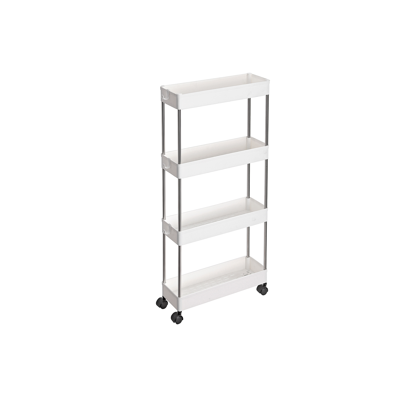 Alt inden for r?kkevidde: Udstyret med 4 h?jkvalitets PP-plasthylder og underst?ttet af robuste jernr?r tilbyder denne rullevogn plads nok til alle de genstande, der endnu ikke har fundet en fast plads i dit hjem. Denne alsidige vogn kan ogs? uden problemer b?re deres v?gt. Desuden passer serveringsvognen takket v?re sin kompakte st?rrelse (40 x 13,5 x 86 cm) perfekt i badev?relset til opbevaring af sk?nhedsprodukter, i k?kkenet til opbevaring af k?kkenredskaber eller p? kontoret til opbevaring af dokumenter.Produktdetaljer: Farve: Hvid Materiale: PP (polypropylen), jernr?r Samlet st?rrelse: 40 x 13,5 x 86 cm (L x B x H) V?gt: 1,3 kg Maks. statisk belastning: 20 kg (5 kg pr. niveau) Leveringsomfang: 1 x rullebord 3 x kroge 1 x vejledning (DE, EN, DE, FR, ES, IT)SONGMICS Bem?rkninger: Monter kun produktet som beskrevet i denne vejledning. Undlad at afmontere det med magt. Hver hylde kan b?re op til 5 kg. Opbevar ikke tungere genstande p? produktet.