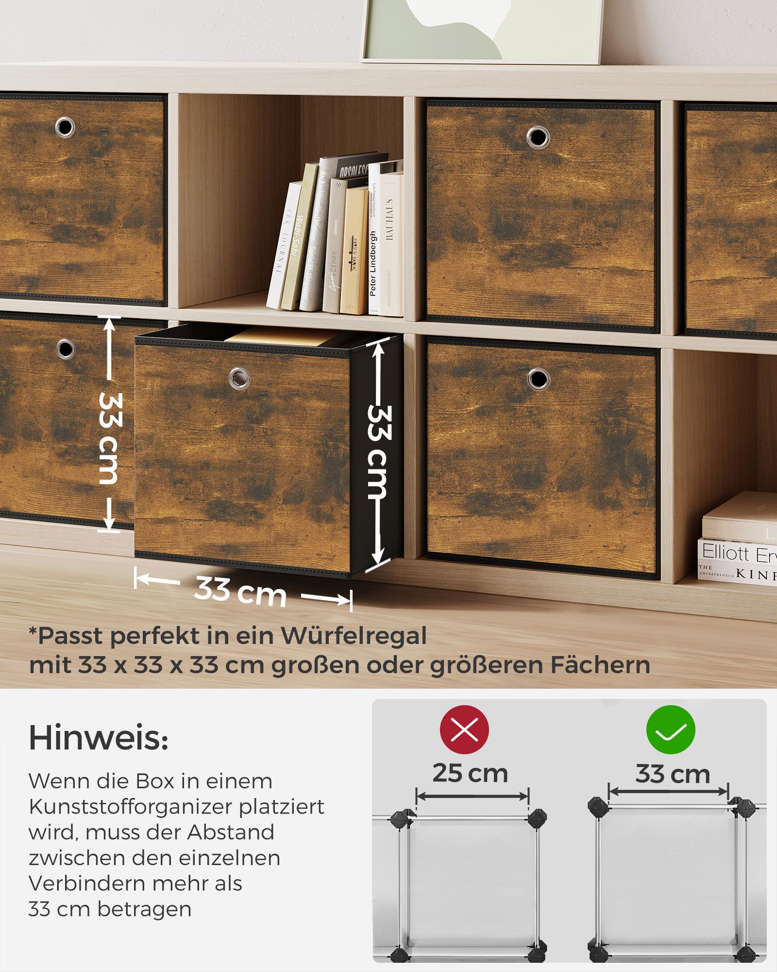 SONGMICS opbevaringsboks, 8-pak, opbevaringsbokse, foldbar boks, 33 x 33 x 33 cm, stofboks, til terningereol, organizer til t?j, til sovev?relse og stue, vintagebrun-sort RFB833B01