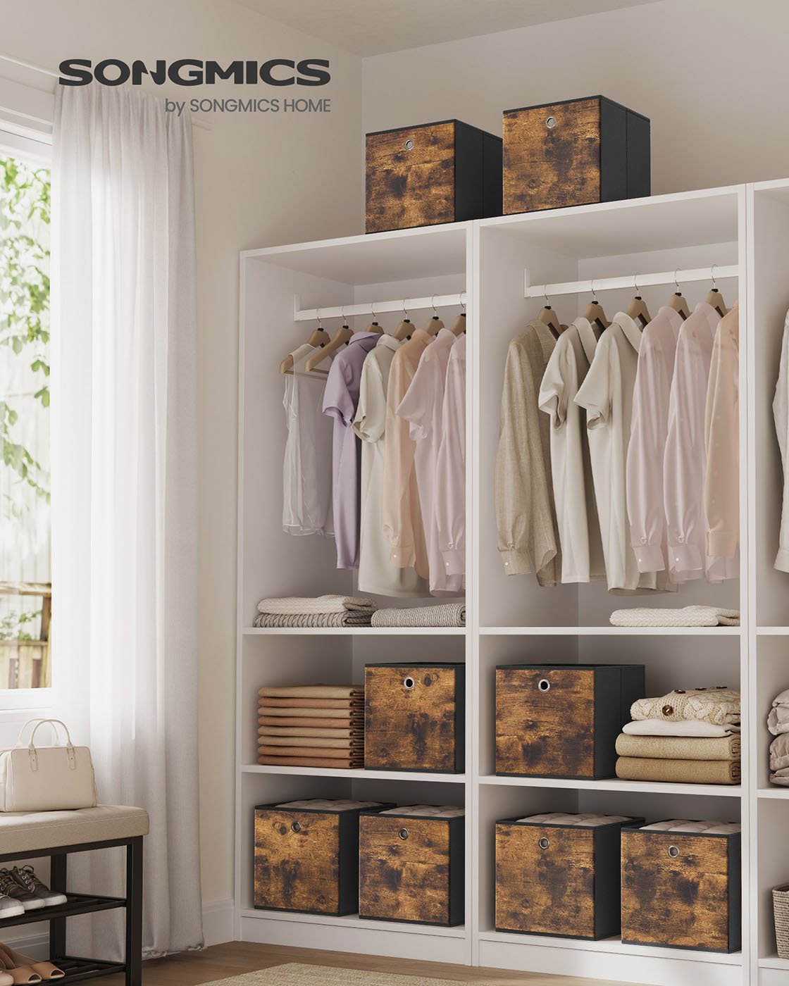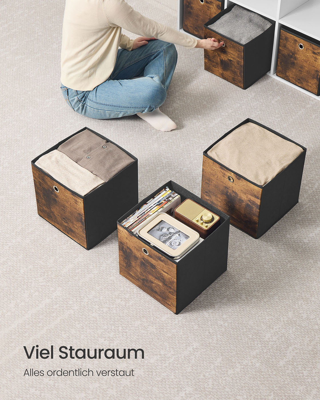 SONGMICS opbevaringsboks, 8-pak, opbevaringsbokse, foldbar boks, 33 x 33 x 33 cm, stofboks, til terningereol, organizer til t?j, til sovev?relse og stue, vintagebrun-sort RFB833B01
