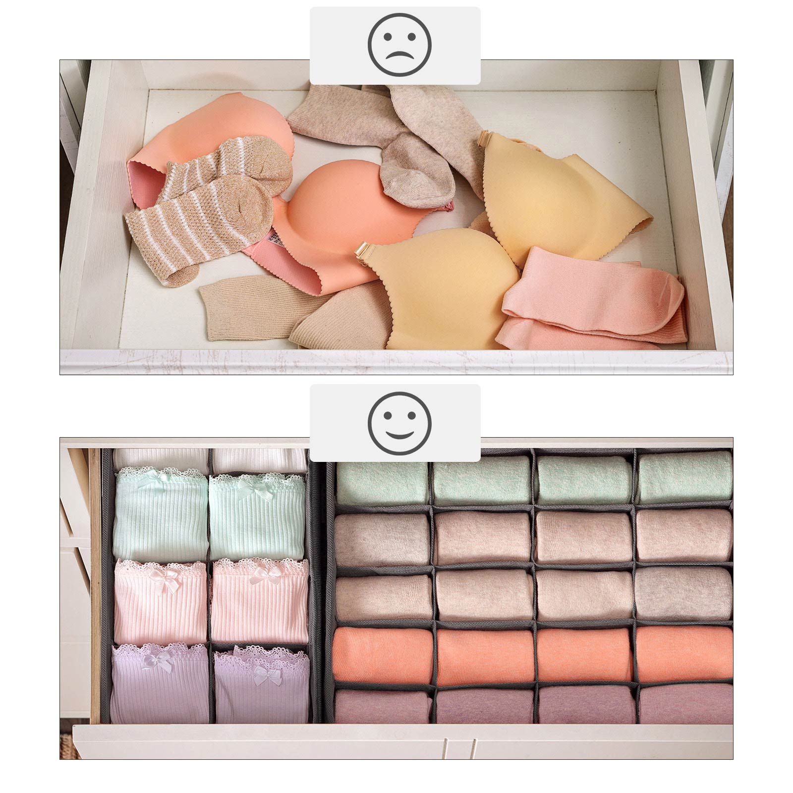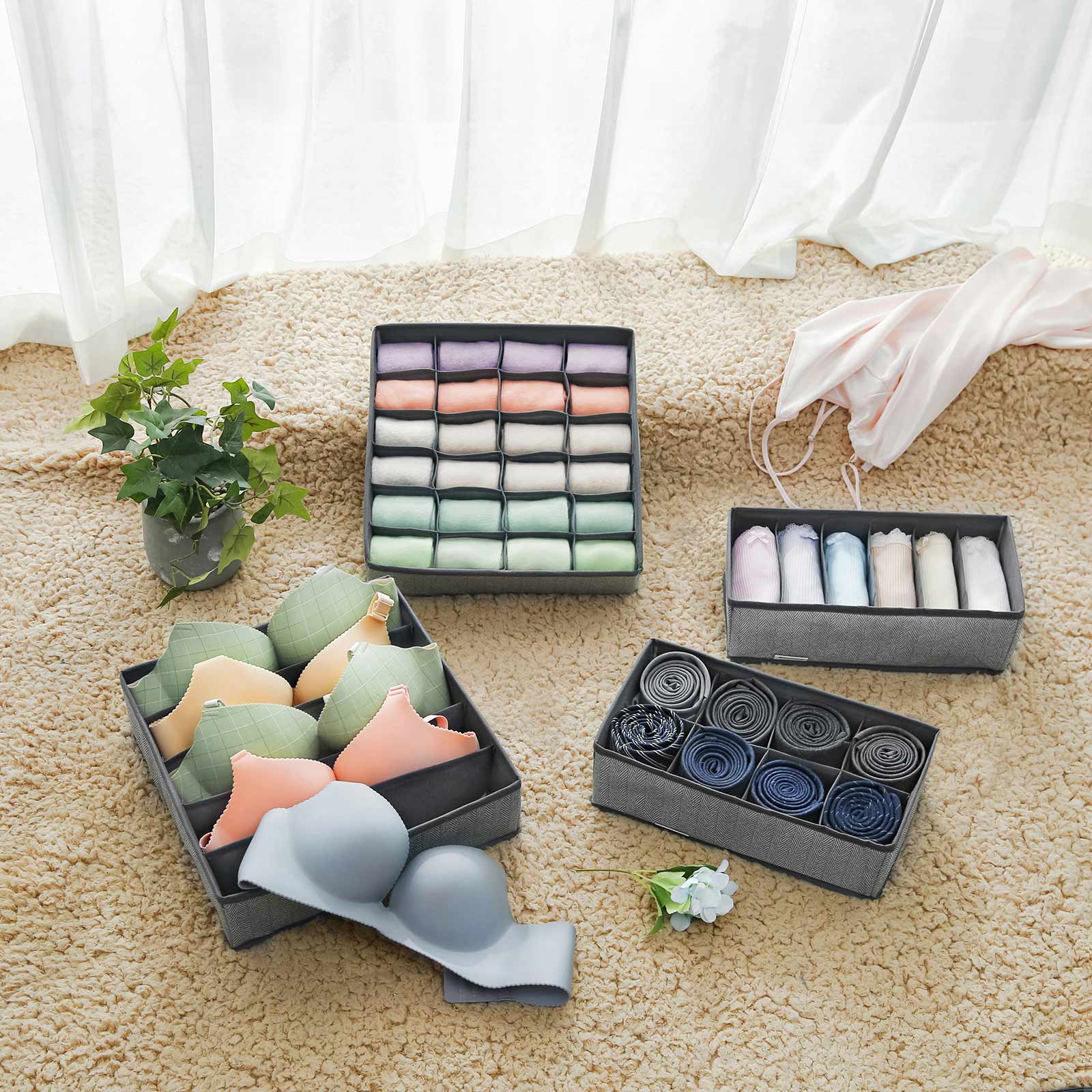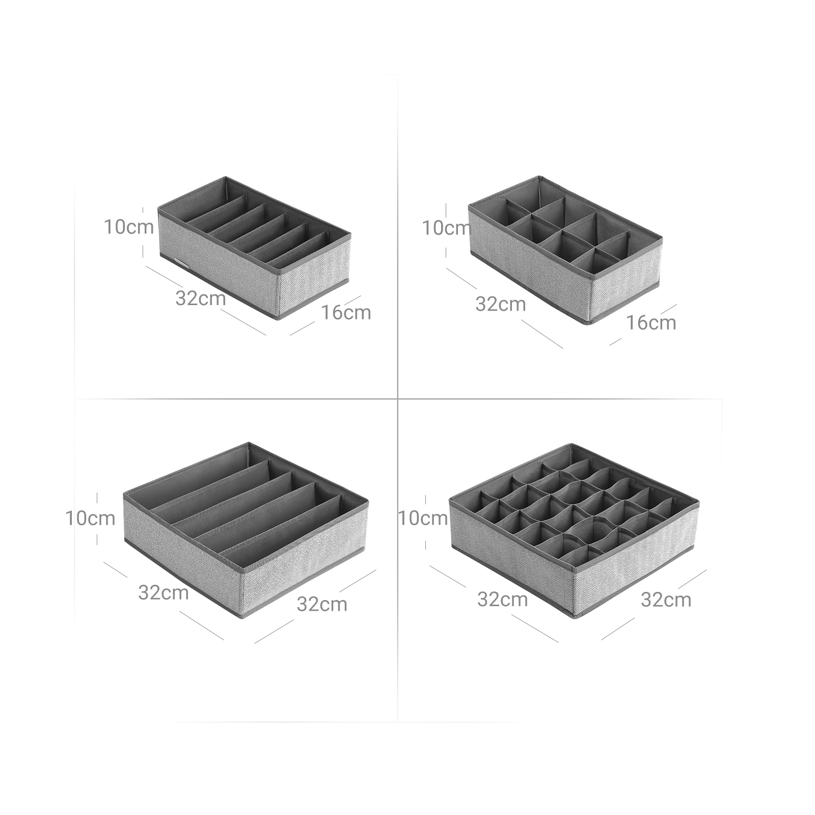 Alt i orden Dette s?t best?r af 4 stofkasser. Hver kasse er opdelt i flere rum, s? du kan opbevare forskellige bekl?dningsgenstande som undert?j, t?rkl?der, slips og sokker adskilt fra hinanden. Disse kasser passer perfekt i dine skuffer og udnytter pladsen optimalt. Ikke kun til dit undert?j Lad din fantasi l?be frit! Med disse 4 opbevaringsbokse kan du f.eks. opbevare makeup eller smykker p?nt p? toiletbordet. Orden skaber lykke! Produktdetaljer: – Farve: Gr? – Materiale: Pap, 80 g/m? fleece i linnedlook, PE-plade – St?rrelse: Lille boks: 32 x 16 x 10 cm (L x B x H) Stor kasse: 32 x 32 x 10 cm (L x B x H) – Samlet v?gt: 0,7 kg Leveringsomfang: – 2 x stor opbevaringskasse (32 x 32 x 10 cm) – 2 x lille opbevaringskasse (32 x 16 x 10 cm) SONGMICS Bem?rkninger:- T?r overfladen af med en fugtig klud til daglig reng?ring, og lad produktet luftt?rre; vask det IKKE under rindende vand.- Produktet kan have en svag lugt, n?r det pakkes ud. I s? fald skal det placeres et godt ventileret sted i nogle timer.