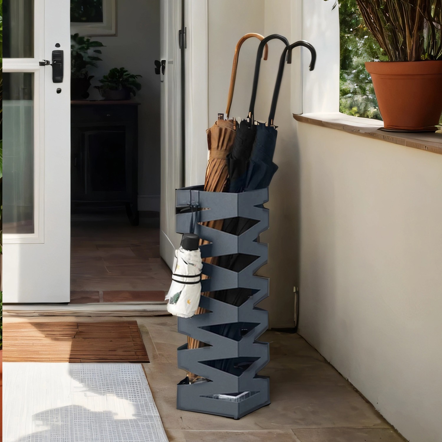 SONGMICS paraplystativ, firkantet, paraplystativ af metal, med vandopsamlingsbakke og 4 kroge