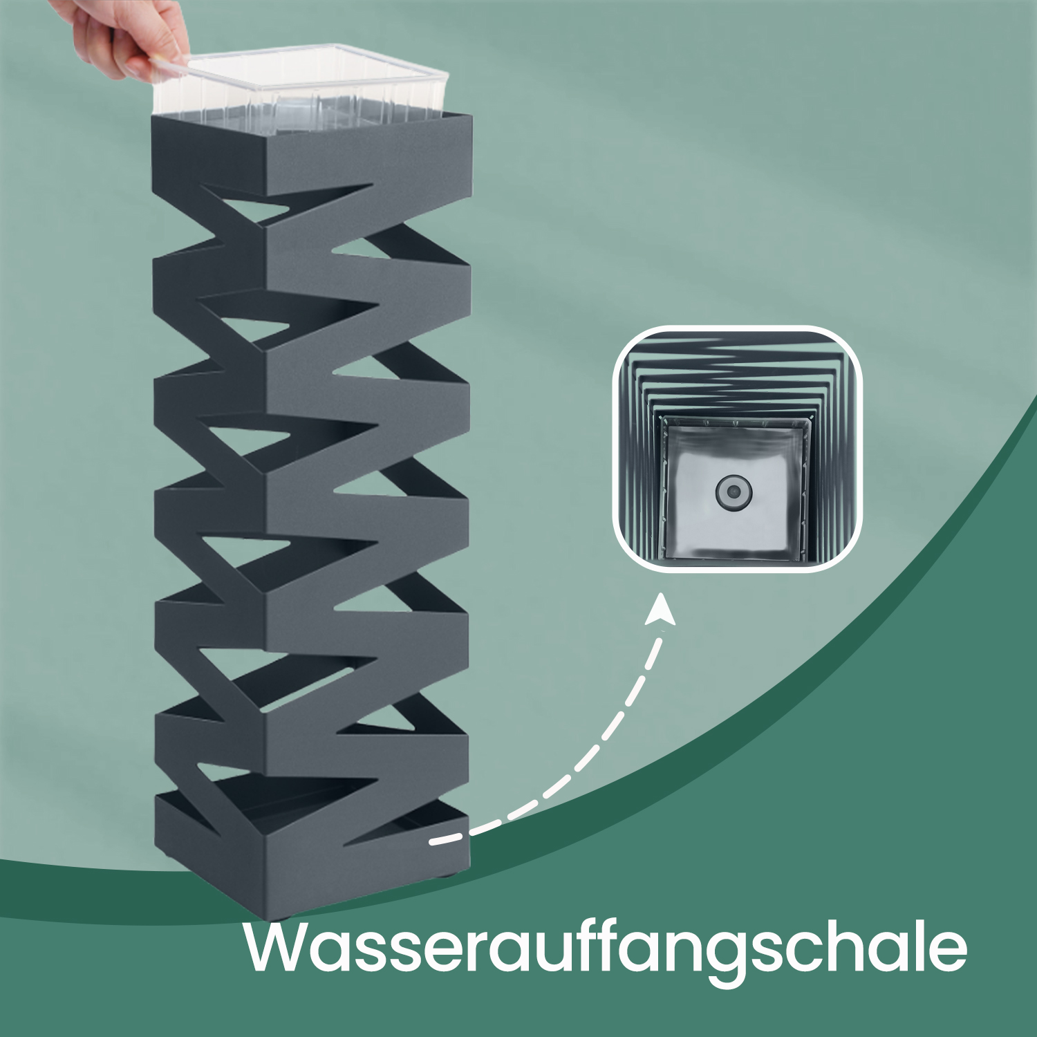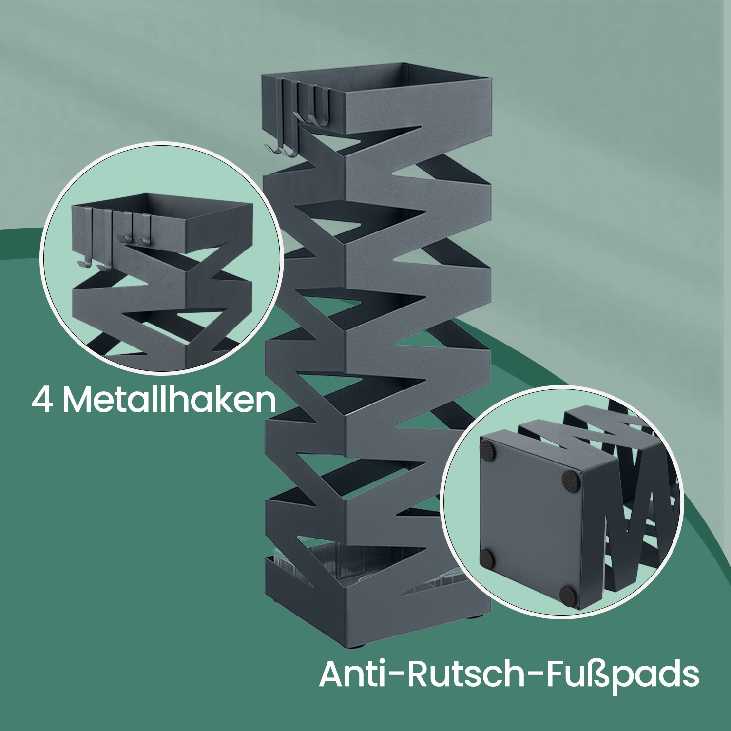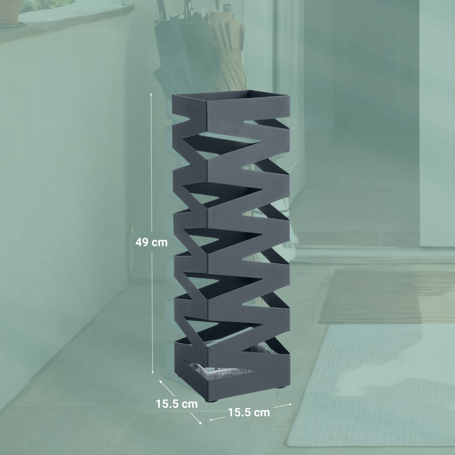 Paraplystativ, firkantet, paraplystativ af metal, med vandopsamlingsbakke og 4 kroge, 15,5 x 15,5 x 49 cm, antracit
