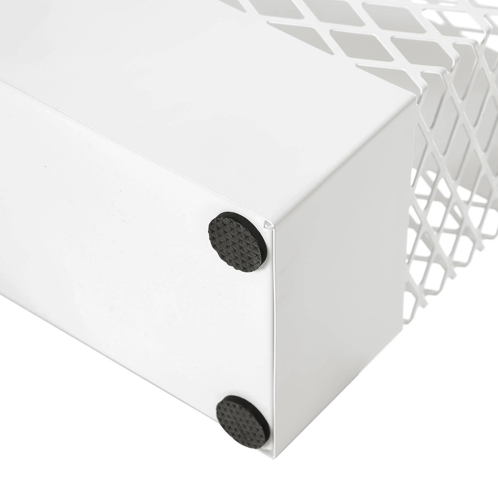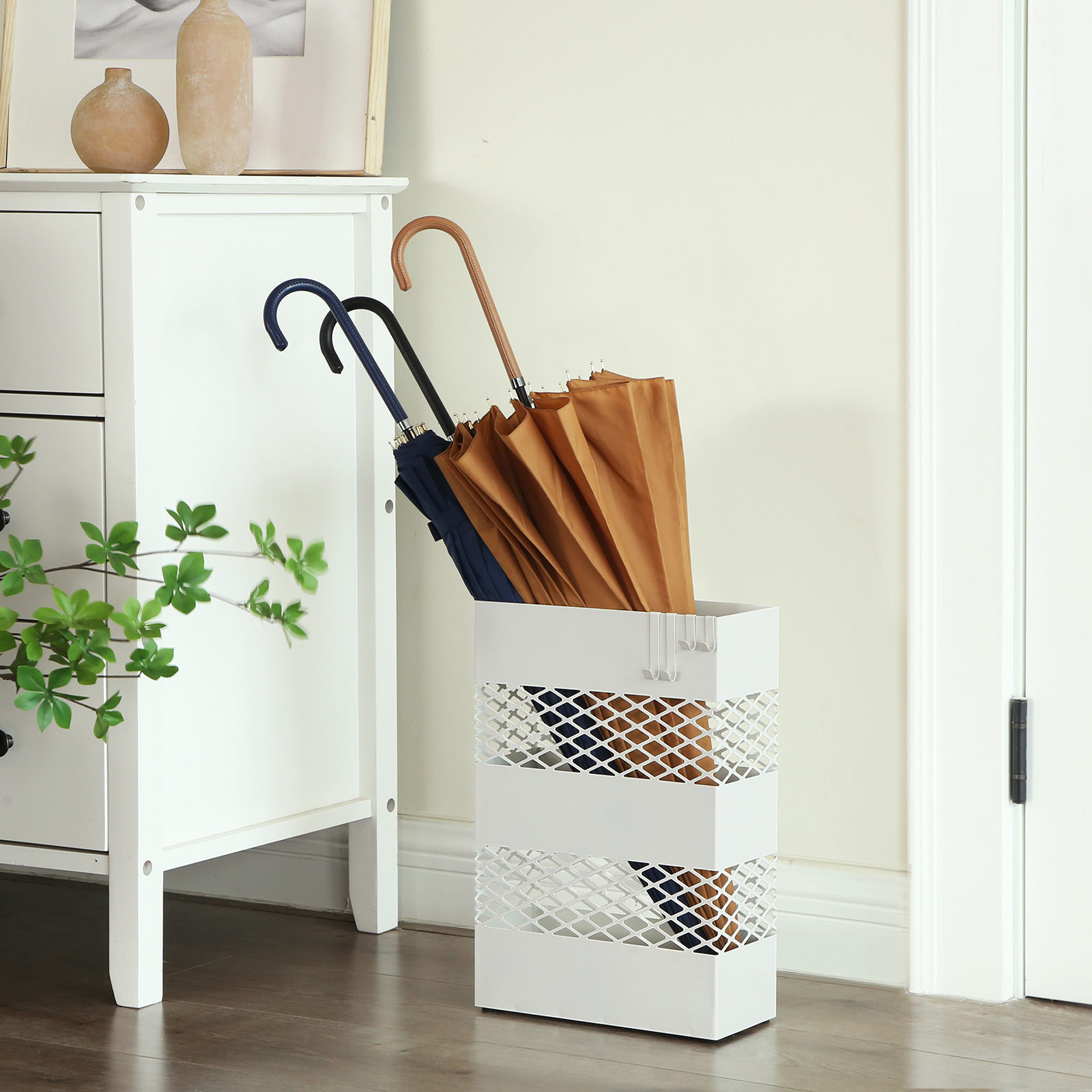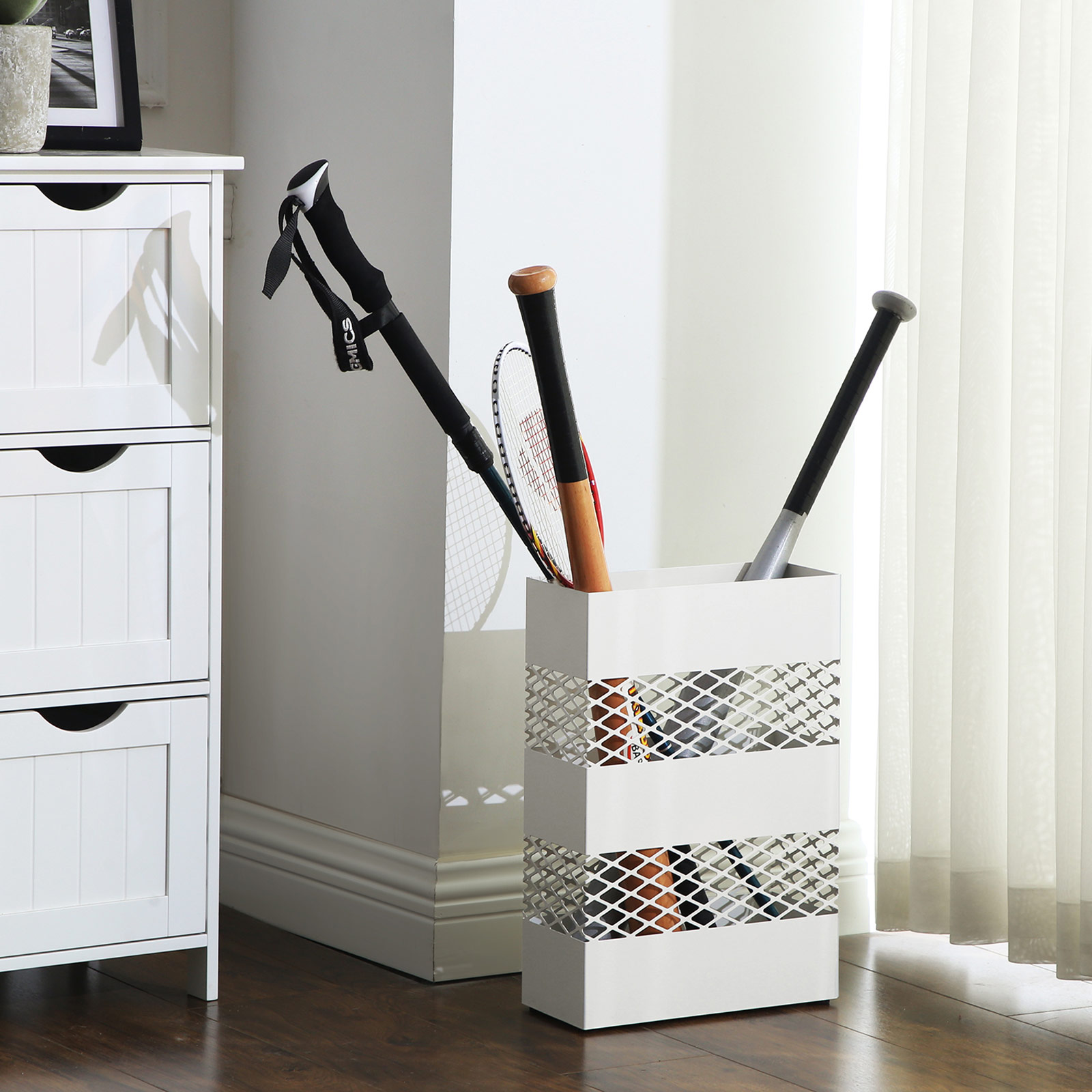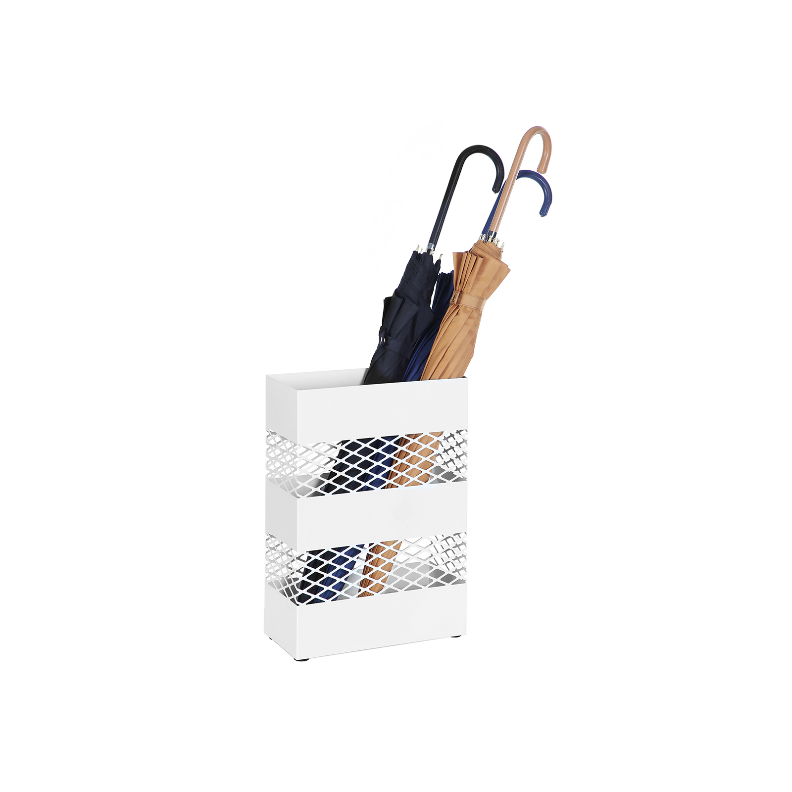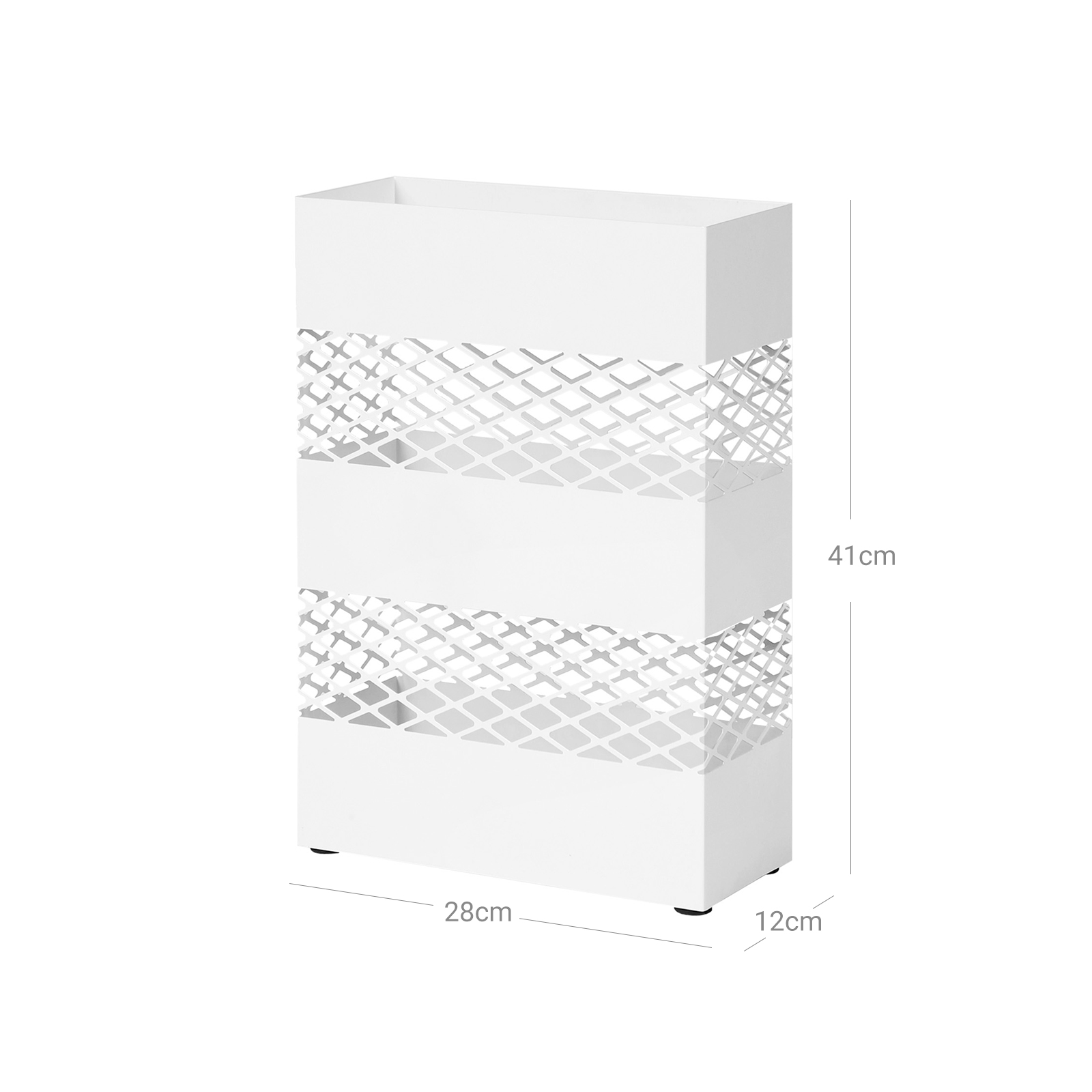 Ingen rod, ingen stress: S?t din paraply i denne stilfulde paraplystativ fra SONGMICS, n?r du kommer hjem gennemv?det og drivv?d efter regnvejr ? s? forbliver dit gulv t?rt, og du undg?r v?dt rod. Lev milj?venligt! Denne paraplystativ er udstyret med en plastikbakke, der opsamler drypvand fra paraplyer. S? undg?r du vandpytter p? gulvet! Desuden kan sk?len nemt tages ud og t?mmes. Brug det opsamlede regnvand til at vande dine potteplanter og del naturens gave med dem. Produktdetaljer: Farve: Hvid Materiale: St?l med lakering St?rrelse: 28 x 12 x 41 cm (L x B x H) V?gt: 2 kg Leveringsomfang: 1 x paraplystativ 1 x vandopsamlingssk?l