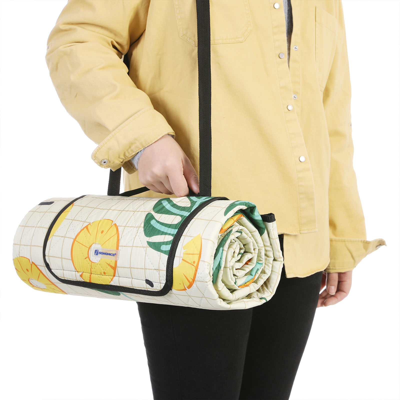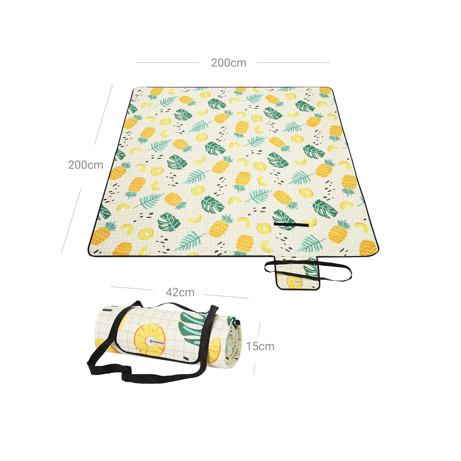 Nyd naturens sk?nhed Uanset om du forbereder dig p? en for?rspicnic, camping om sommeren, en musikfestival eller bare en solbadning i naturen, er dette t?ppe dit ideelle tilbeh?r til en dag i parken, p? stranden, i haven eller ved swimmingpoolen. H?j kvalitet Med en bl?d overflade af polyester, en aluminiumsbel?gning og et skumlag i midten er dette picnic-t?ppe b?de behageligt og vandt?t. Fold det blot sammen til en kompakt st?rrelse og tag det med p? rejsen. Produktdetaljer: – Farve: Ananas-m?nster – Materiale: Polyesteroverflade, skumpolstring, aluminiumsbel?gning – St?rrelse sammenfoldet: 42 x 17 x 17 cm (L x B x H) – St?rrelse udfoldet: 200 x 200 cm (L x B) – V?gt: 1 kg Leveringsomfang: – 1 x picnic-t?ppe SONGMICS Bem?rkninger: – P? grund af forskellige lysforhold eller sk?rme med forskellig opl?sning kan der forekomme mindre farveafvigelser i forhold til de produkter, der vises p? billederne. – Placer ikke dette produkt p? skarpe eller spidse genstande s?som sten eller grene for at undg? skader eller beskadigelse. – Vask ikke produktet for ofte i vaskemaskinen, da dette kan p?virke levetiden negativt.