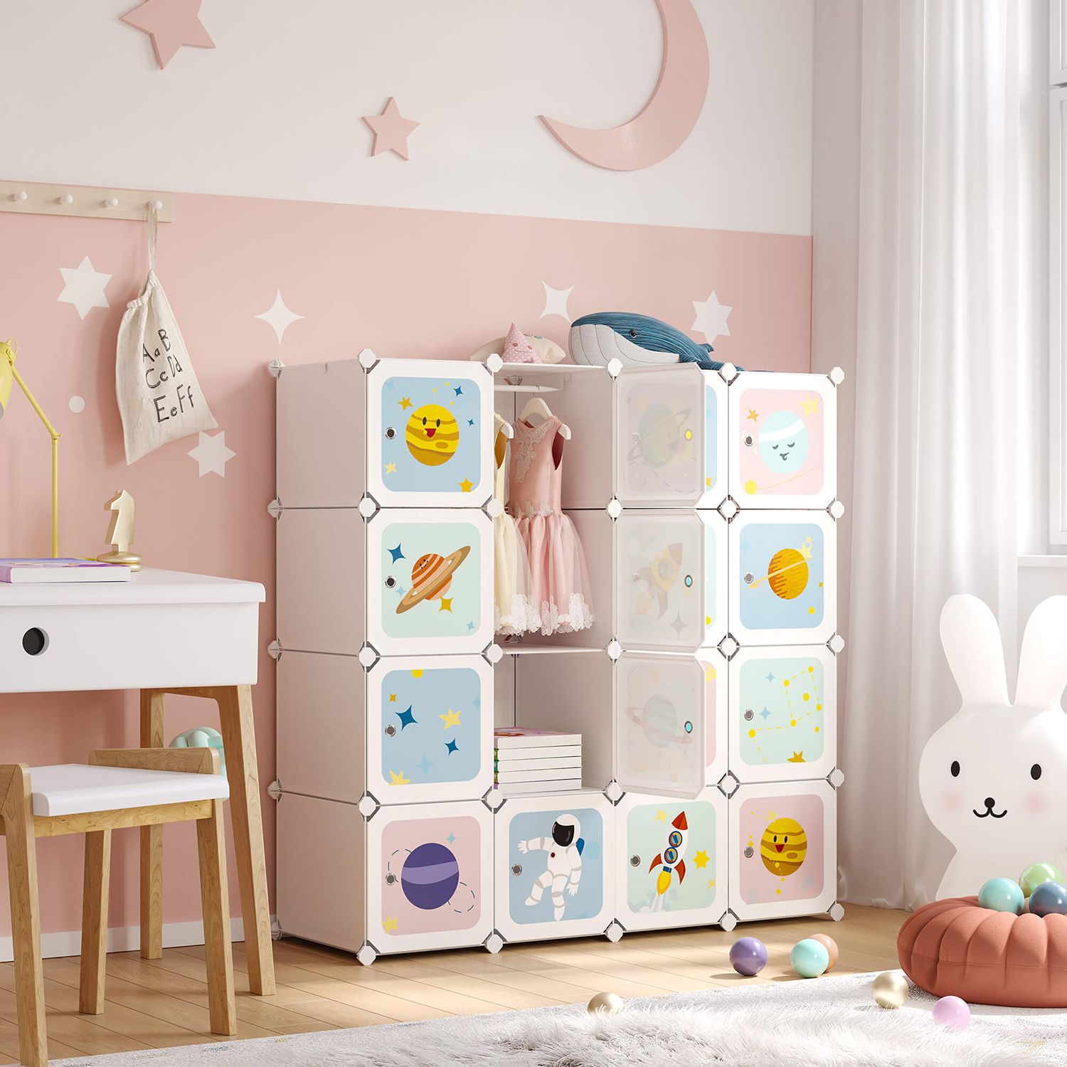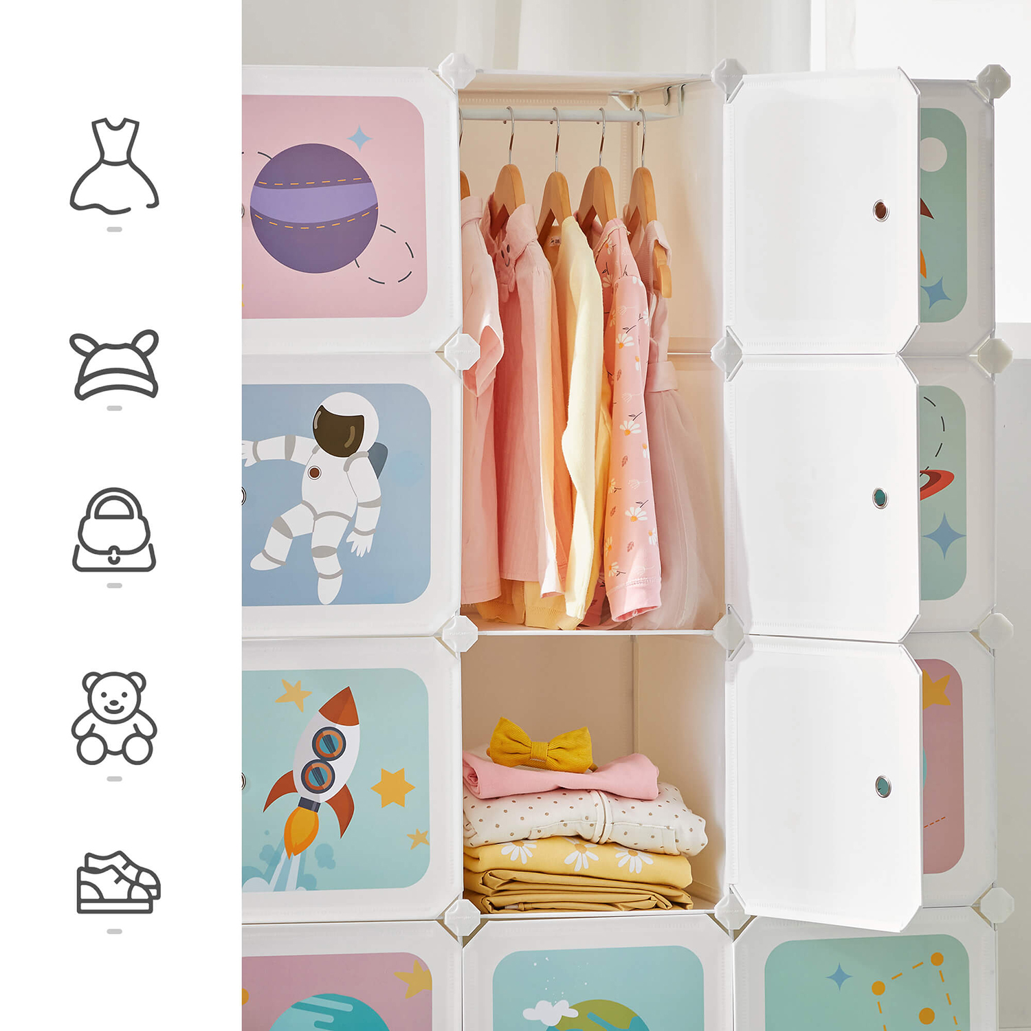 En positiv indflydelse p? b?rn Utraditionelle m?nstre, friske farver og s?de terninger ? hvis dine b?rn er interesserede i rummet eller gerne l?rer gennem leg, vil dette kl?deskab helt sikkert v?kke begejstring og inspirere b?rnene til at bruge terningerne og rydde deres ting op selv. V?relset vil str?le i ny glans! Oplev flere muligheder Dette kl?deskab har 4 t?jst?nger til sm? b?jler og separate kuber til opbevaring af leget?j, v?rkt?j og sko. Det sammenkoblede design giver dig mulighed for at sammens?tte et m?bel efter dine ?nsker, s? det passer til ethvert hj?rne i forskellige rum, s?som sovev?relset, legerummet, gangen eller et helt andet sted. Produktdetaljer:- Farve: Hvid – Materiale: PP-plastplade, metalramme, ABS-plastforbindelsesstykke – St?rrelse: 123 x 41 x 123 cm (L x B x H) – St?rrelse pr. kube: 30 x 40 x 30 cm (L x B x H) – V?gt: 11 kg – Maks. statisk belastning pr. terning: 10 kg – Maks. statisk belastning i alt: 80 kg Leveringsomfang: – 40 x plastplade (40 x 30 cm) – 16 x plastplade (30 x 30 cm)- 16 x d?r (30 x 30 cm) – 4 x oph?ngsstang – 52 x ABS-plastforbindelsesstykke – 1 x hammer – 1 x v?ltebeskyttelse – 1 x vejledning (DE, EN, FR, IT, ES) SONGMICS Bem?rkninger: – Fastg?r produktet til v?ggen ved hj?lp af den medf?lgende v?ltebeskyttelse.- Ikke egnet til b?rn under 3 ?r. B?rn over 3 ?r m? kun bruge produktet under opsyn af voksne. – Alle plastplader skal trykkes helt ned under monteringen. Kontroller efter f?rdigg?relsen af hver r?kke, at tr?drammerne er trykket helt ned i forbindelsesstykket for at ?ge produktets stabilitet.