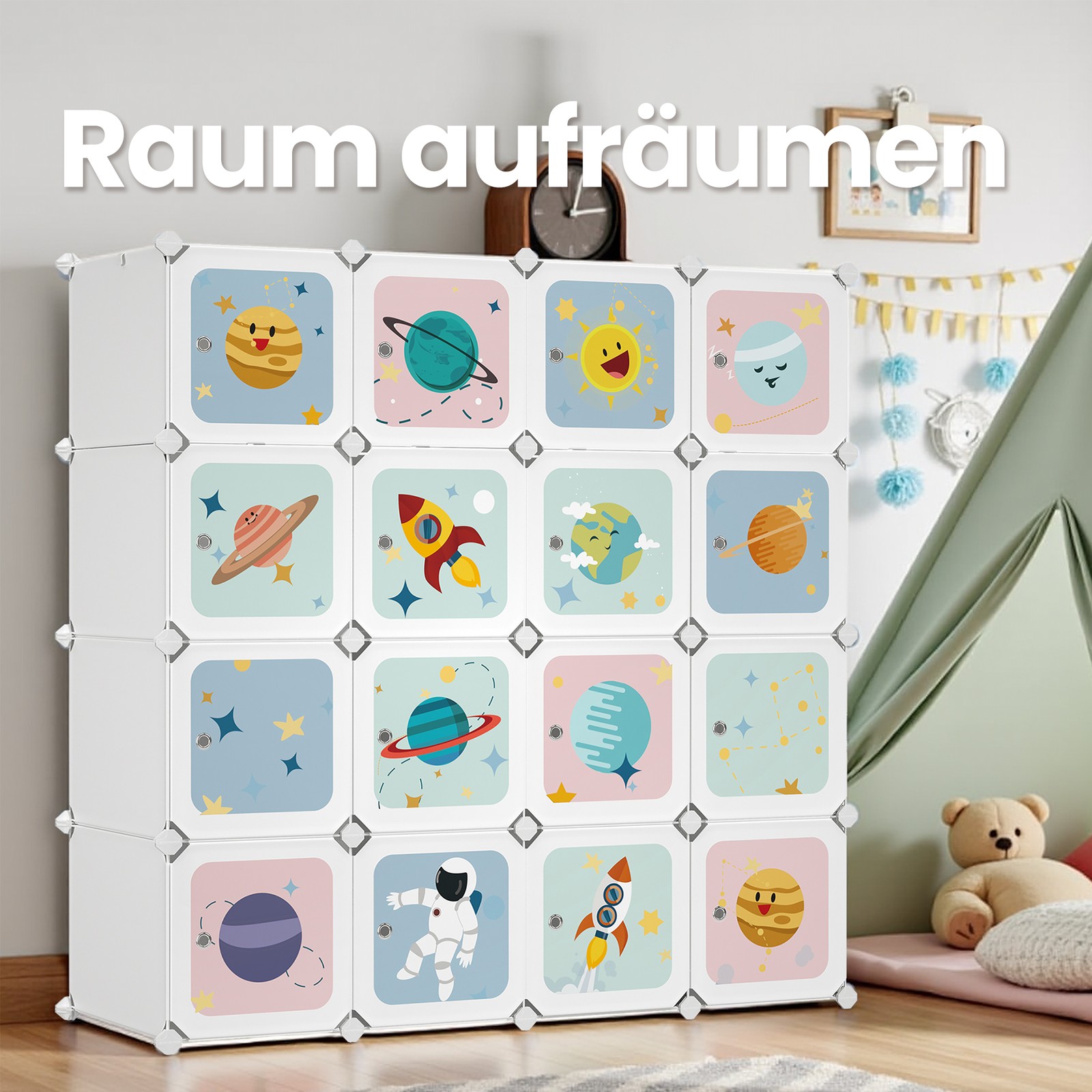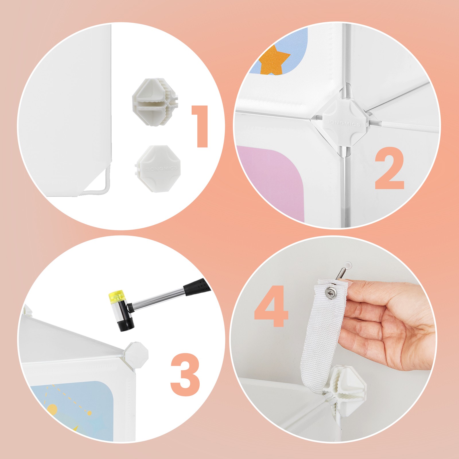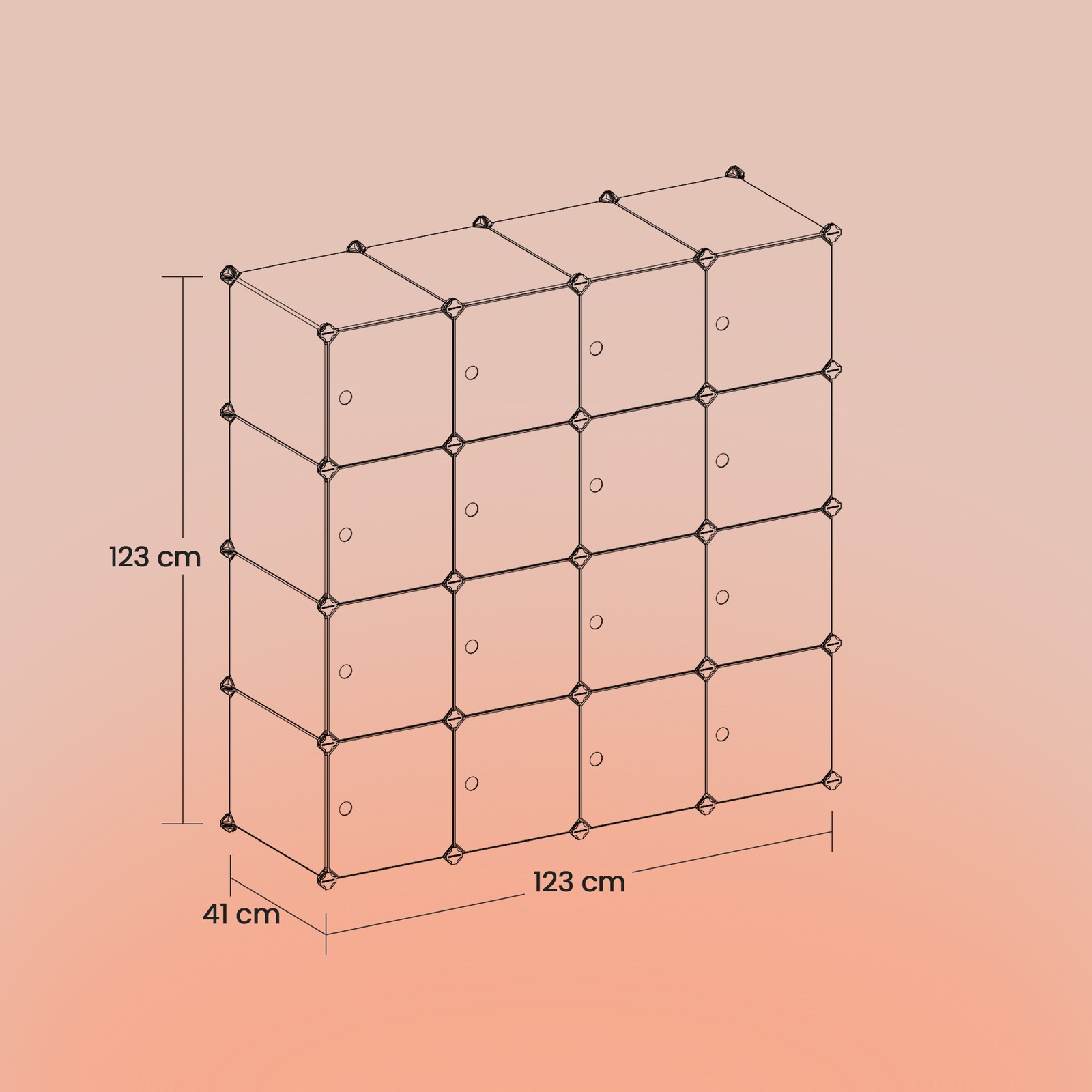 En positiv indflydelse p? b?rn Utraditionelle m?nstre, friske farver og s?de terninger ? hvis dine b?rn er interesserede i rummet eller gerne l?rer gennem leg, vil dette kl?deskab helt sikkert v?kke begejstring og inspirere b?rnene til at bruge terningerne og rydde deres ting op selv. V?relset vil str?le i ny glans! Oplev flere muligheder Dette kl?deskab har 4 t?jst?nger til sm? b?jler og separate terninger til opbevaring af leget?j, v?rkt?j og sko. Det sammenkoblede design giver dig mulighed for at sammens?tte et m?bel efter dine ?nsker, s? det passer til ethvert hj?rne i forskellige rum, s?som sovev?relset, legerummet, gangen eller et helt andet sted. Produktdetaljer:- Farve: Hvid – Materiale: PP-plastplade, metalramme, ABS-plastforbindelsesstykke – St?rrelse: 123 x 41 x 123 cm (L x B x H) – St?rrelse pr. kube: 30 x 40 x 30 cm (L x B x H) – V?gt: 11 kg – Maks. statisk belastning pr. terning: 10 kg – Maks. statisk belastning i alt: 80 kg Leveringsomfang: – 40 x plastplade (40 x 30 cm) – 16 x plastplade (30 x 30 cm)- 16 x d?r (30 x 30 cm) – 4 x oph?ngsstang – 52 x ABS-plastforbindelsesstykke – 1 x hammer – 1 x v?ltebeskyttelse – 1 x vejledning (DE, EN, FR, IT, ES) SONGMICS Bem?rkninger: – Fastg?r produktet til v?ggen ved hj?lp af den medf?lgende v?ltebeskyttelse.- Ikke egnet til b?rn under 3 ?r. B?rn over 3 ?r m? kun bruge produktet under opsyn af voksne. – Alle plastplader skal trykkes helt ned under monteringen. Kontroller efter f?rdigg?relsen af hver r?kke, at tr?drammerne er trykket helt ned i forbindelsesstykket for at ?ge produktets stabilitet.