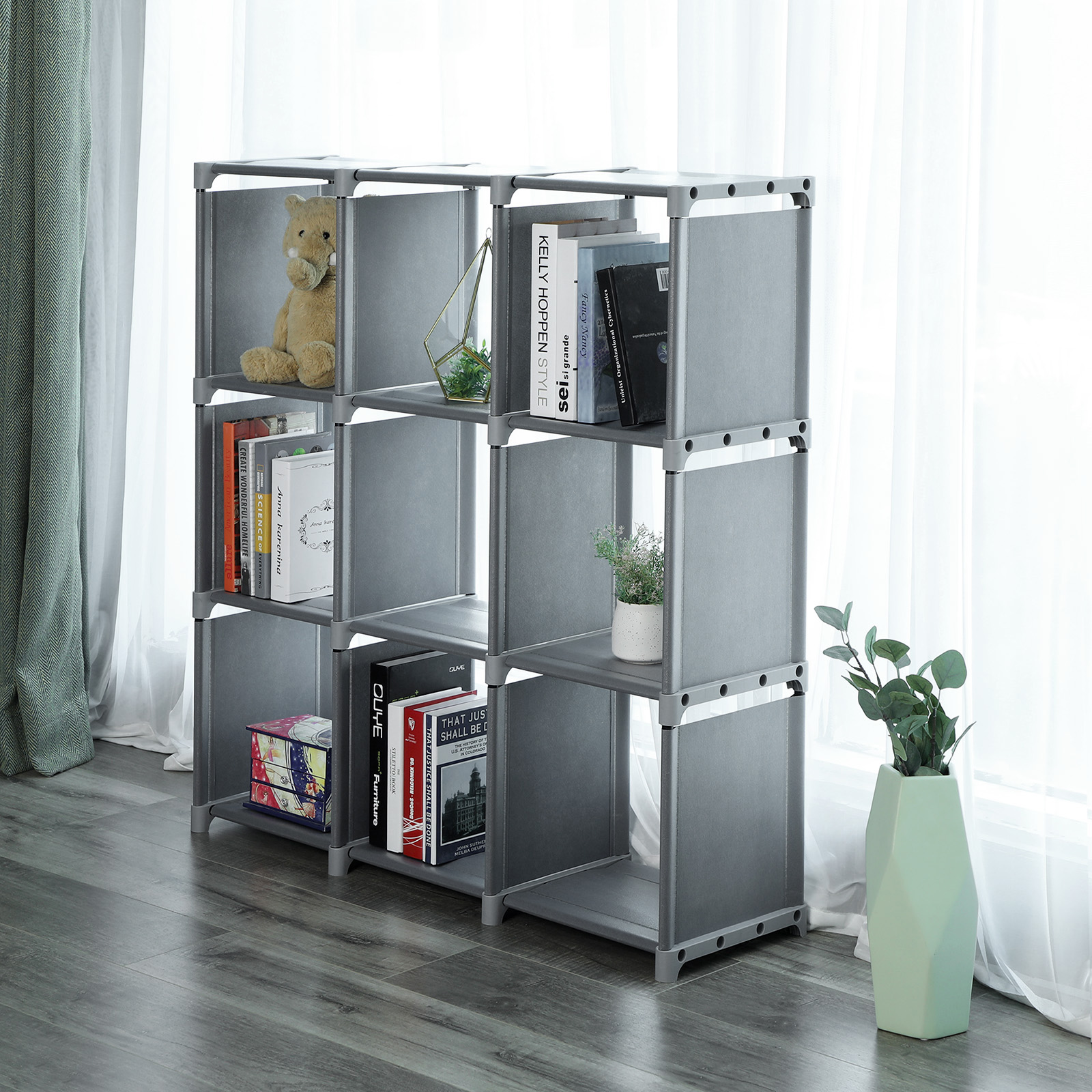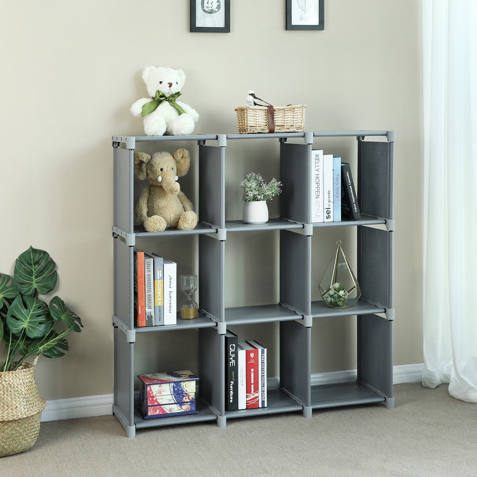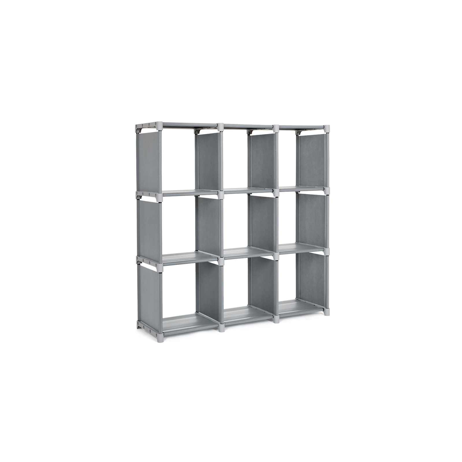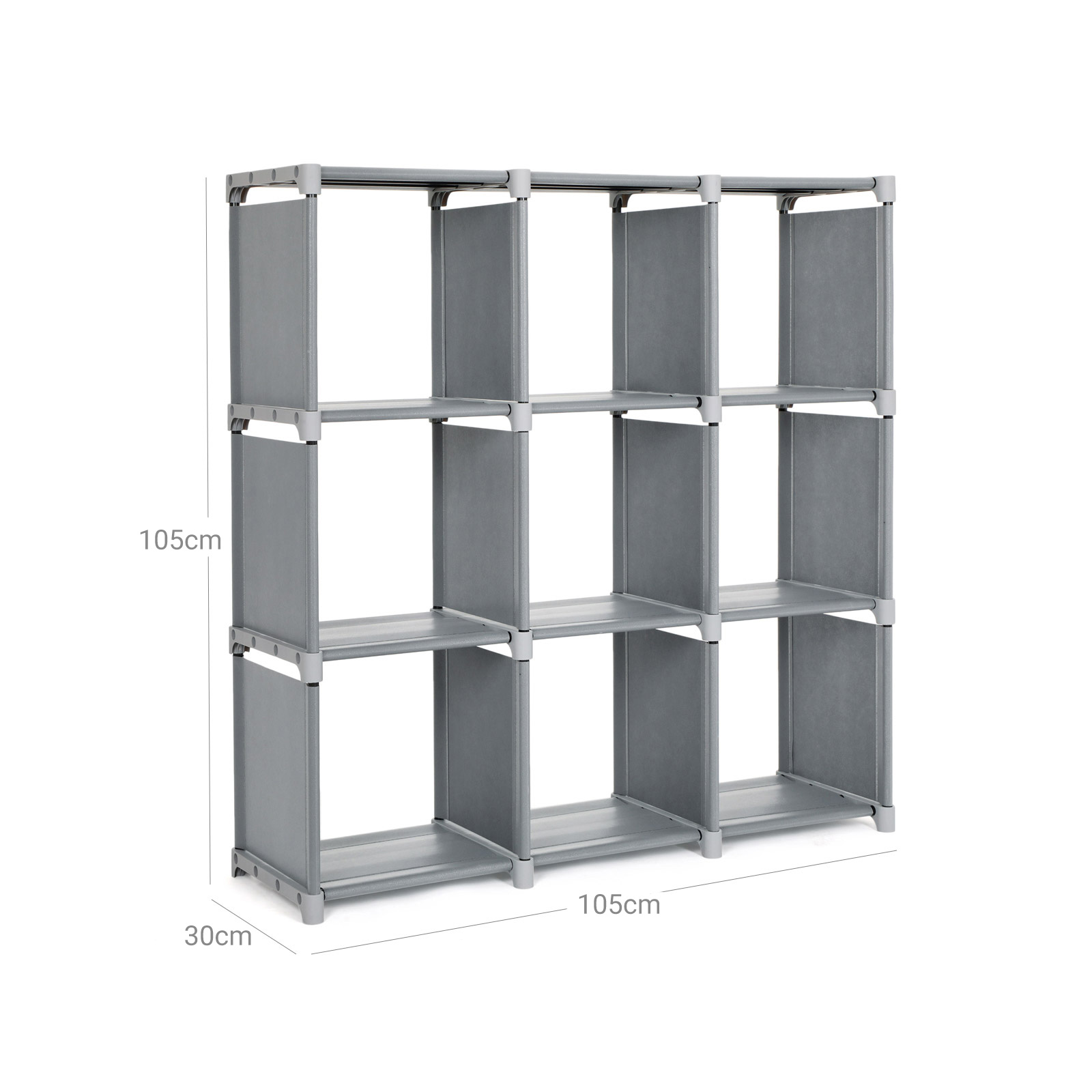 To-vejs plastdele for nem og individuel monteringVandafvisende og st?vfri, nem at reng?reHvert rum holdes nede af 4 st?lr?r, stabilt og med god b?reevneProduktdetaljer:Farve: gr? Materiale: 100 g/m2 fleece-stof, jernr?r, plastikkoblinger M?l: 105 x 105 x 30 cm (B x H x D) Indvendige m?l for hvert rum: 32 x 32 x 30 cm (B x H x D) Maks. belastning af hele reolen: 80 kg Maks. belastning af hvert rum: 8 kg V?gt: 3,7 kg Leveringsomfang: 1 x opbevaringsreol 1 x hammer 1 x vejledning (DE, EN, FR, ES, IT) SONGMICS Bem?rkninger:Fastg?r produktet til en v?g med den medf?lgende vippesikring.