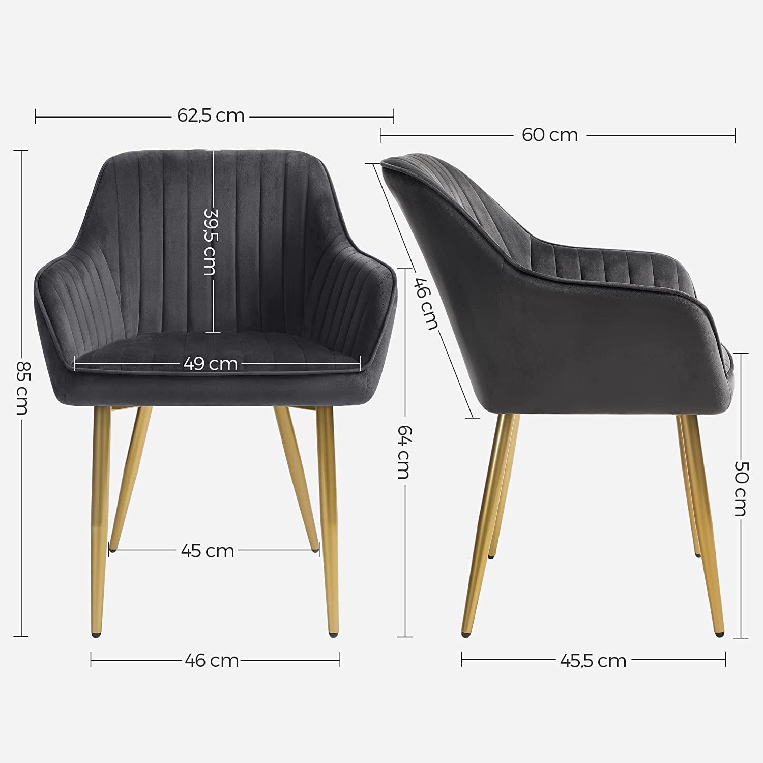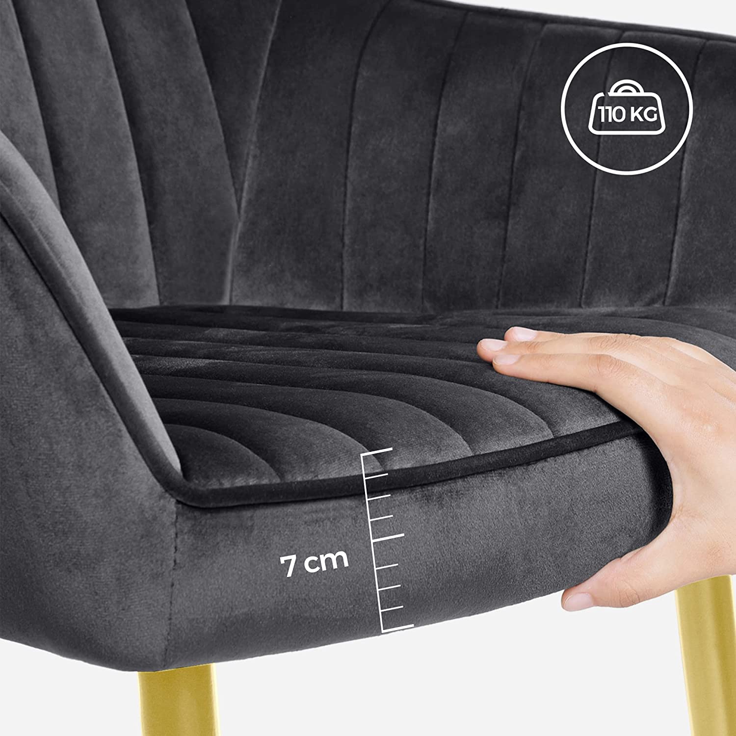 Hvad er de vigtigste fordele ved din nye stol? Komfort? Ja! Det ergonomiske design, den 7 cm tykke polstrede s?de og det bl?de velourbetr?k sikrer st?rre komfort. Stabilitet? Naturligvis! De stabile metalben og de justerbare f?dder sikrer sikkerhed. Let at montere? Du skal bare stramme 5 skruer, og s? er du f?rdig! Og det er ikke alt: Med sit smukke udseende passer denne stol ind i ethvert rum! Produktdetaljer: Farve: Gr?-guldfarvet Materiale: Metalben, tr?plade, velourbetr?k, skumpolstring St?rrelse: 62,5 x 60 x 85 cm (L x B x H) S?deh?jde: 50 cm S?debredde: 49 cm S?dedybde: 44,5 cm Rygl?nsh?jde: 39,5 cm Arml?nsh?jde (fra gulvet): 64 cm Tykkelsen af s?depolstringen: 7 cm V?gt: 6,5 kg Maks. statisk belastning: 110 kg Leveringsomfang: 1 x stol 1 x tilbeh?rspakke 1 x vejledning SONGICs bem?rkninger: St? ikke p? stolen og brug den ikke som stige eller trappe.T?r straks stolen af med en t?r klud, hvis den bliver v?d. Stil stolen p? et plant underlag. En gulvm?tte under stolen kan beskytte dit parketgulv.