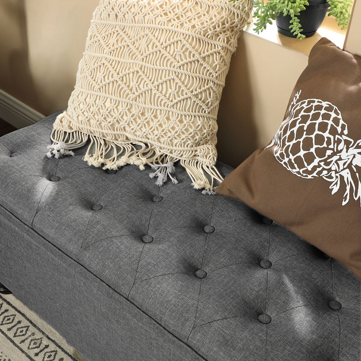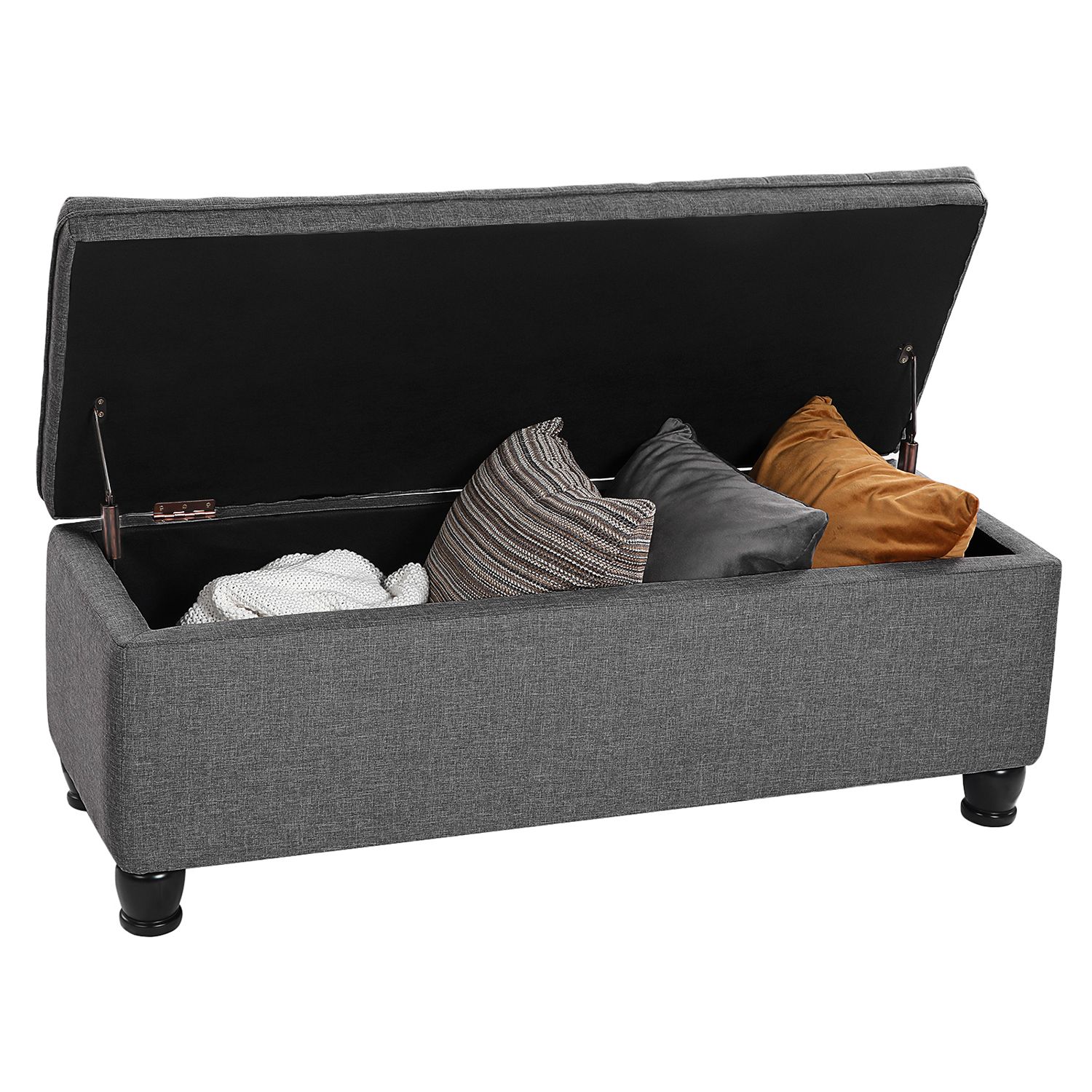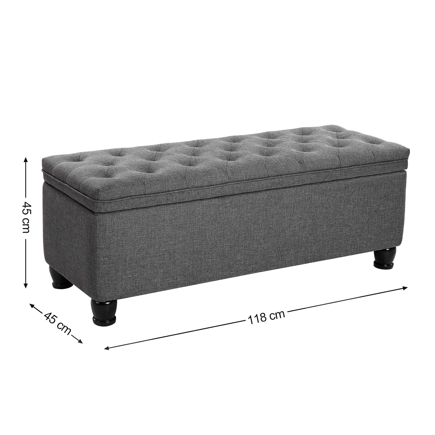 SONGMICS skammel med opbevaringsplads, klapbar b?nk, fodskammel med knapquiltning, 45 x 118 x 45 cm, h?ngsler, f?dder i massivt tr?, betr?k i imiteret h?r, belastbarhed op til 150 kg, lysegr? LOM070G02