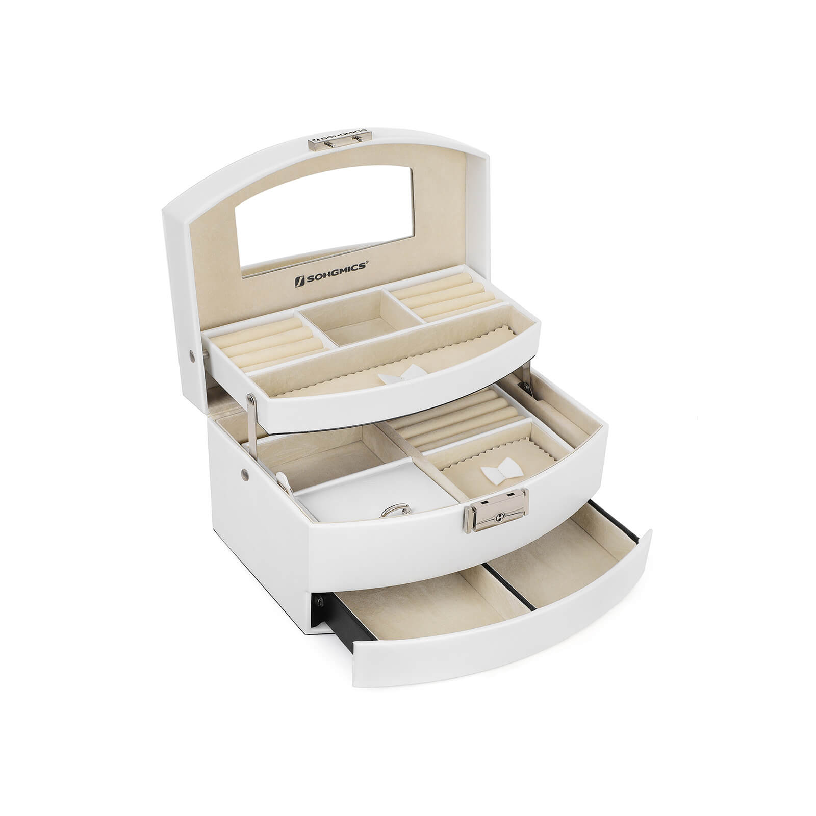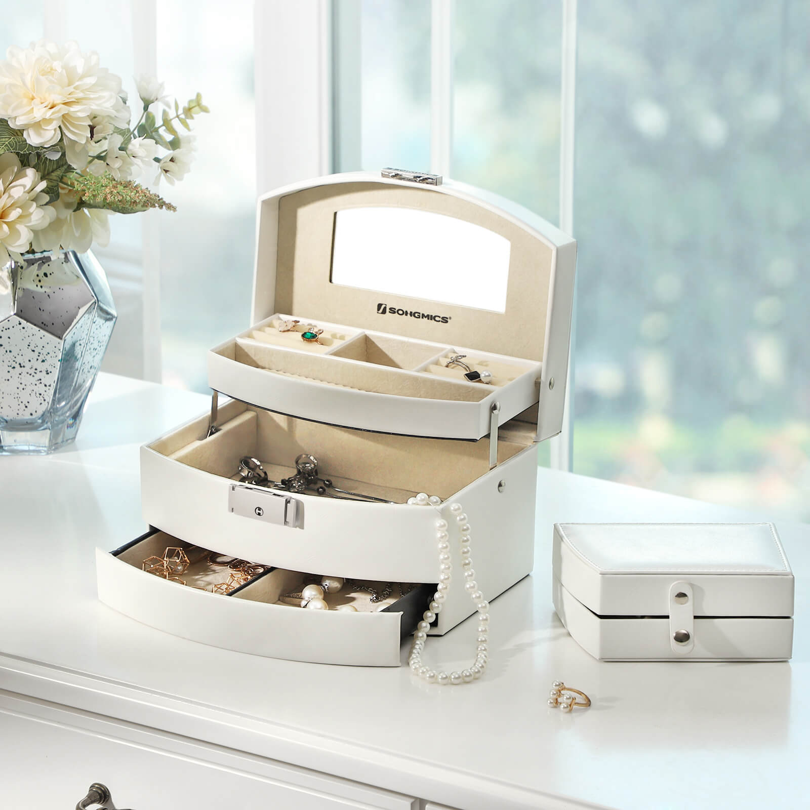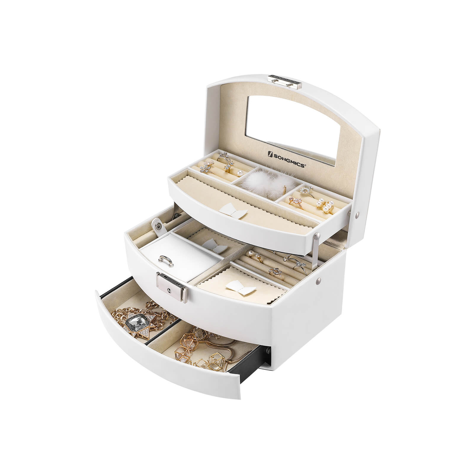 SONGMICS smykkeskrin med 3 niveauer, smykkeskrin, afl?selig smykkeopbevaring med spejl, med udtagelig rejse?ske, til ringe, armb?nd, ?reringe, halsk?der, gave, hvid JBC213W
