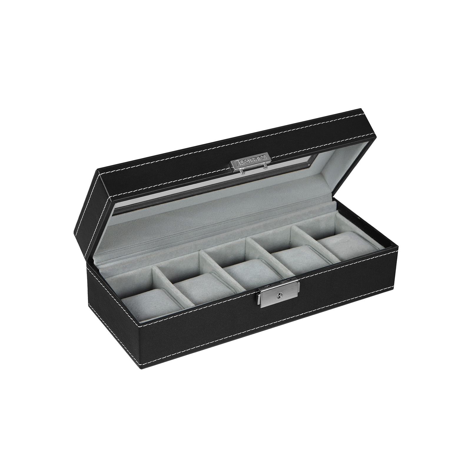 Produktbeskrivelse: Urkassen med gennemsigtig glasplade er meget velegnet til opbevaring af dine armb?ndsure. Det klare glasvindue er meget praktisk, da det giver dig et direkte overblik over, hvilke ure der ligger i kassen. Takket v?re skillev?gge og polstrede urpuder kan urene opbevares p?nt. Urpuderne har en meget behagelig overflade og giver urene et godt hold. Hvis du tager urpuderne ud, bliver etuiet til en lille opbevaringsboks eller et smykkeskrin, der er meget velegnet til opbevaring af knapper, ?reringe, ringe, k?der og andre smykker. Moderne og tiltalende udseende, gennemt?nkt design, perfekt som gave til dine venner og familie, uanset om det er til kvinder eller m?nd. St?rrelse – Produktm?l: 26,5 x 11 x 8,5 cm – Rumst?rrelse: 4,5 x 9 cm – 5 puder (hver 4,5 x 7,5 x 4 cm) Opbevaring og pleje:- Opbevar venligst urkassen i et ventileret rum ved temperaturer mellem 10 og 40 ? og undg? at lade kassen ligge i solen eller i rum med h?j luftfugtighed i l?ngere tid.- Pletter p? overfladen kan t?rres af med en let fugtet klud. Undg? at der tr?nger vand ind i urkassen. – V?sker skal straks fjernes med h?nden eller en bl?d klud, hvorefter overfladen skal t?rre ved k?lige temperaturer. – Brug regelm?ssigt specielle plejemidler til kunstl?der for at bevare glansen i lang tid.- B?j eller tryk ikke p? ?sken, n?r den er i brug eller ikke er i brug. – Opbevar ikke ur?sken sammen med kemikalier. Leveringsomfang: – 1 x ur?ske – Uden ure og smykker