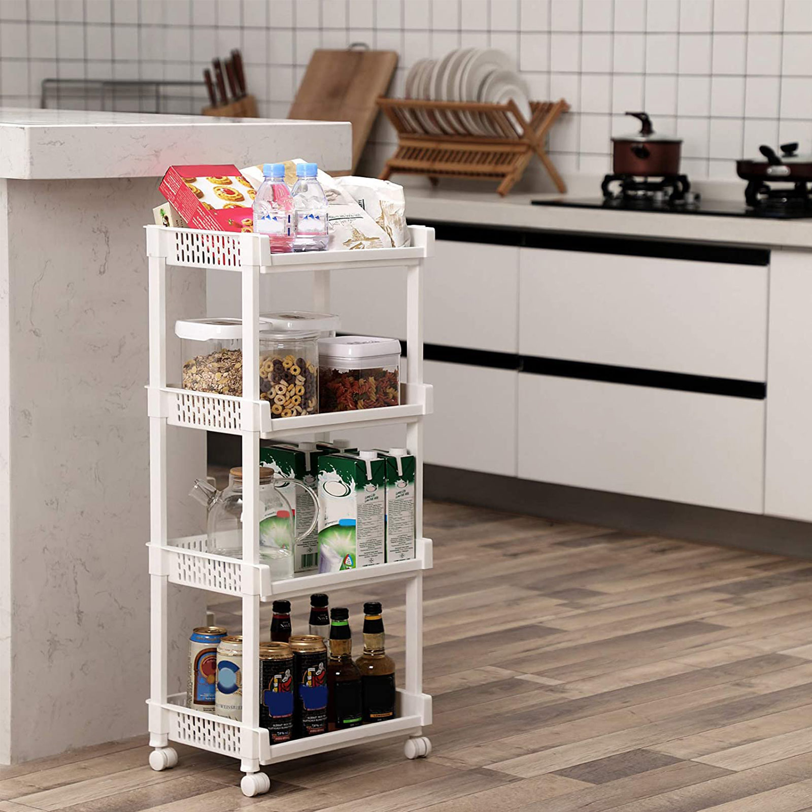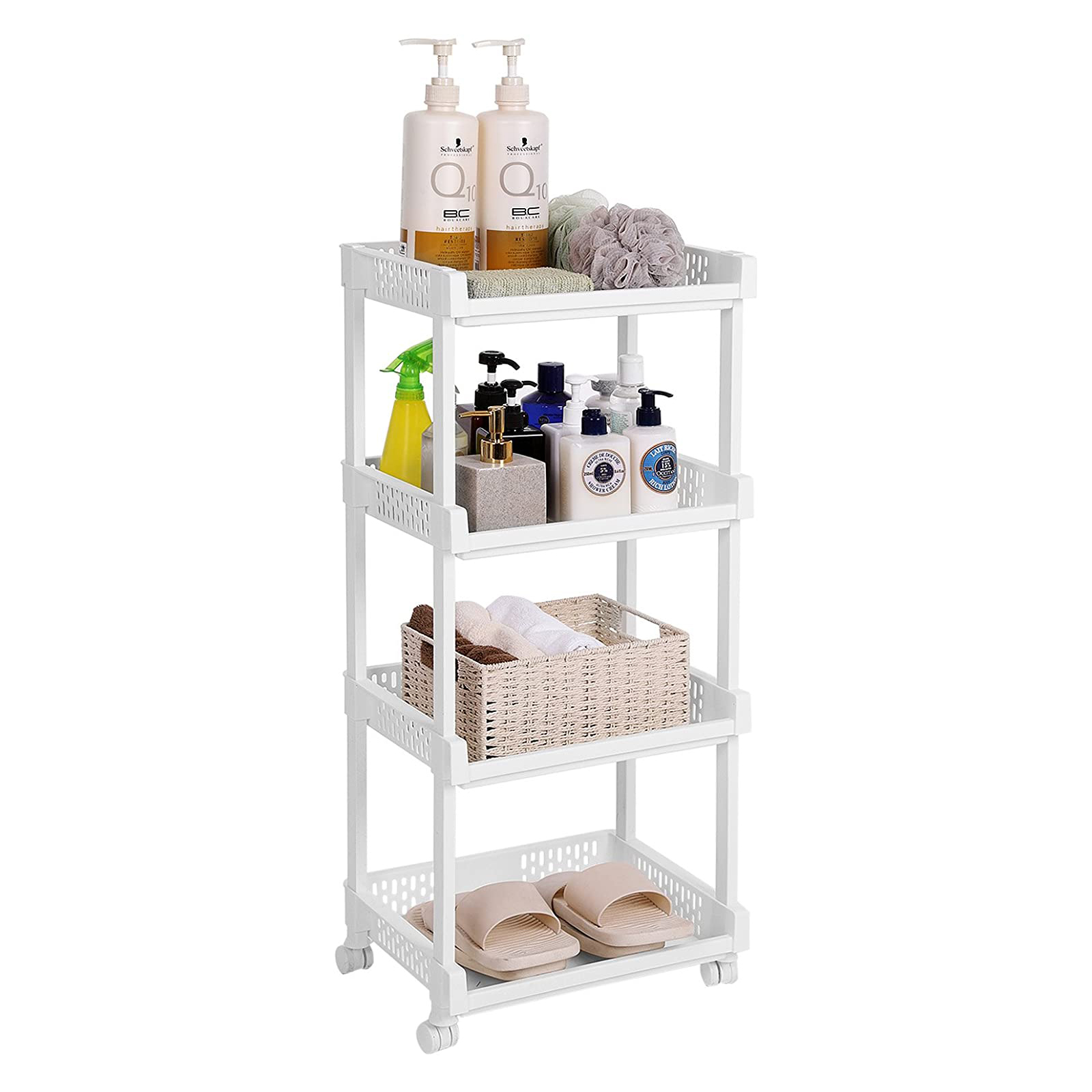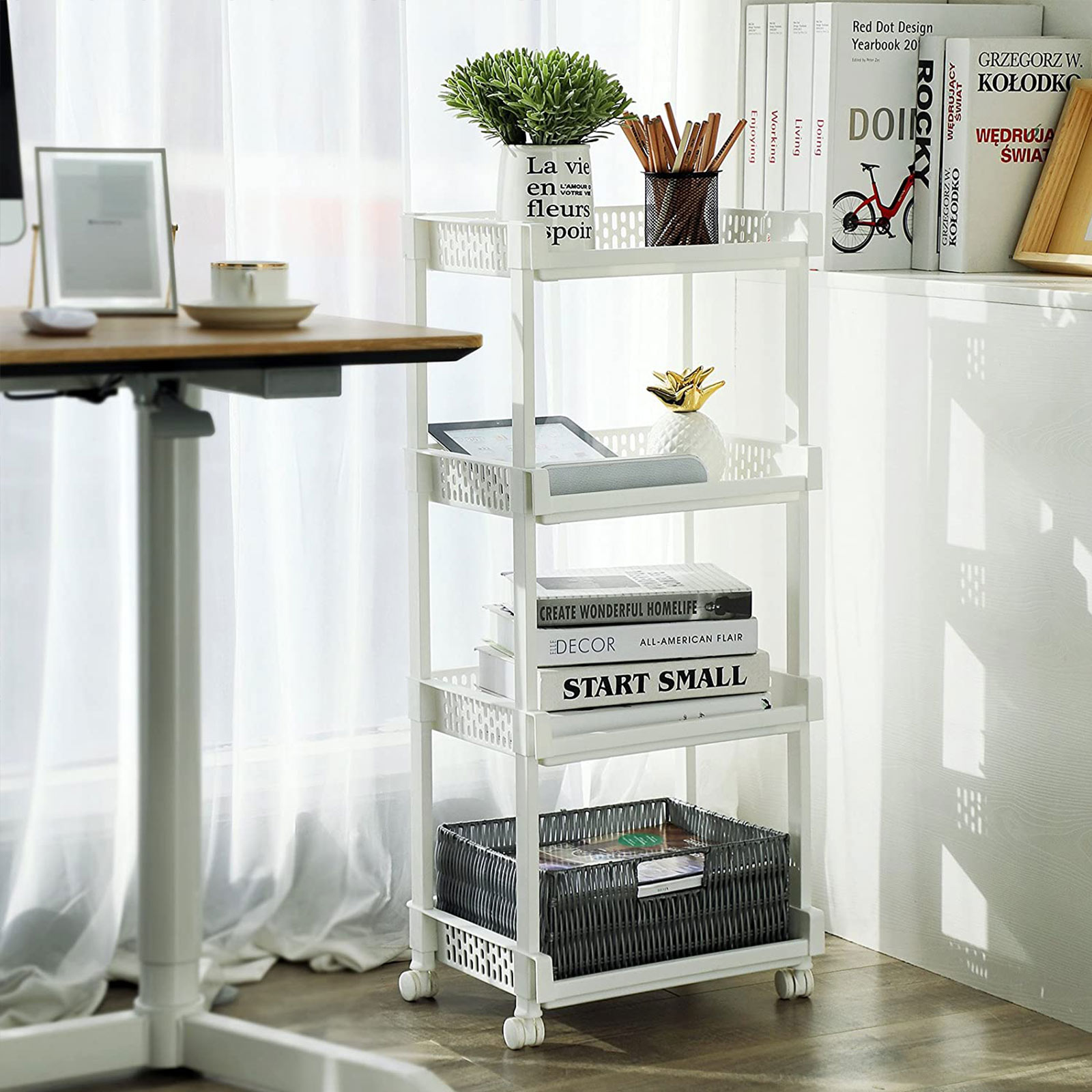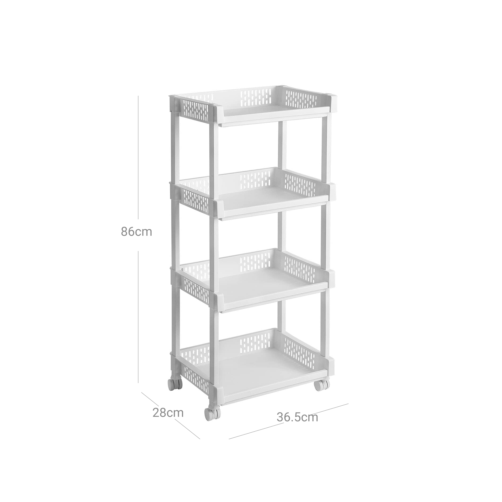 Masser af opbevaringsplads, der ikke tager meget plads: Med m?lene 36,5 x 28 x 86 cm har rullebordet 4 hylder, der er godt fordelt p? hylden. S?ledes kan forskellige k?kkenredskaber, f?devarer, kosmetik, leget?j eller opbevaring p? kontoret finde deres plads. Slidser i siderne af hylderne giver reolen et legesygt design. Robust og b?rnevenlig: Reolen er fremstillet af hvid PP-plast og er b?rnevenlig, men alligevel meget stabil og robust. Den kan nemt skubbes og tr?kkes p? sine 4 universalhjul. Det har en b?reevne p? 20 kg. Let at reng?re og samle: En illustreret vejledning forklarer tydeligt, hvordan reolen samles. De enkelte dele s?ttes blot sammen, hvilket kan g?res uden v?rkt?j og p? f? minutter. Ved flytning eller n?r reolen ikke er i brug, kan den lige s? hurtigt skilles ad igen. Produktdetaljer: Farve: hvid Materiale: PP-plast Produktm?l: 36,5 x 28 x 86 cm (B x H x D)V?gt: 1,7 kgB?reevne: 20 kgLeveringsomfang:1 x rullebord1 x vejledning (DE, EN, FR, ES, IT)SONGMICS Bem?rkninger:For at samlingerne holder godt sammen og reolen ikke beskadiges, b?r du IKKE samle og skille produktet ad flere gange.Beskyt produktet mod varmekilder for at undg? beskadigelse.