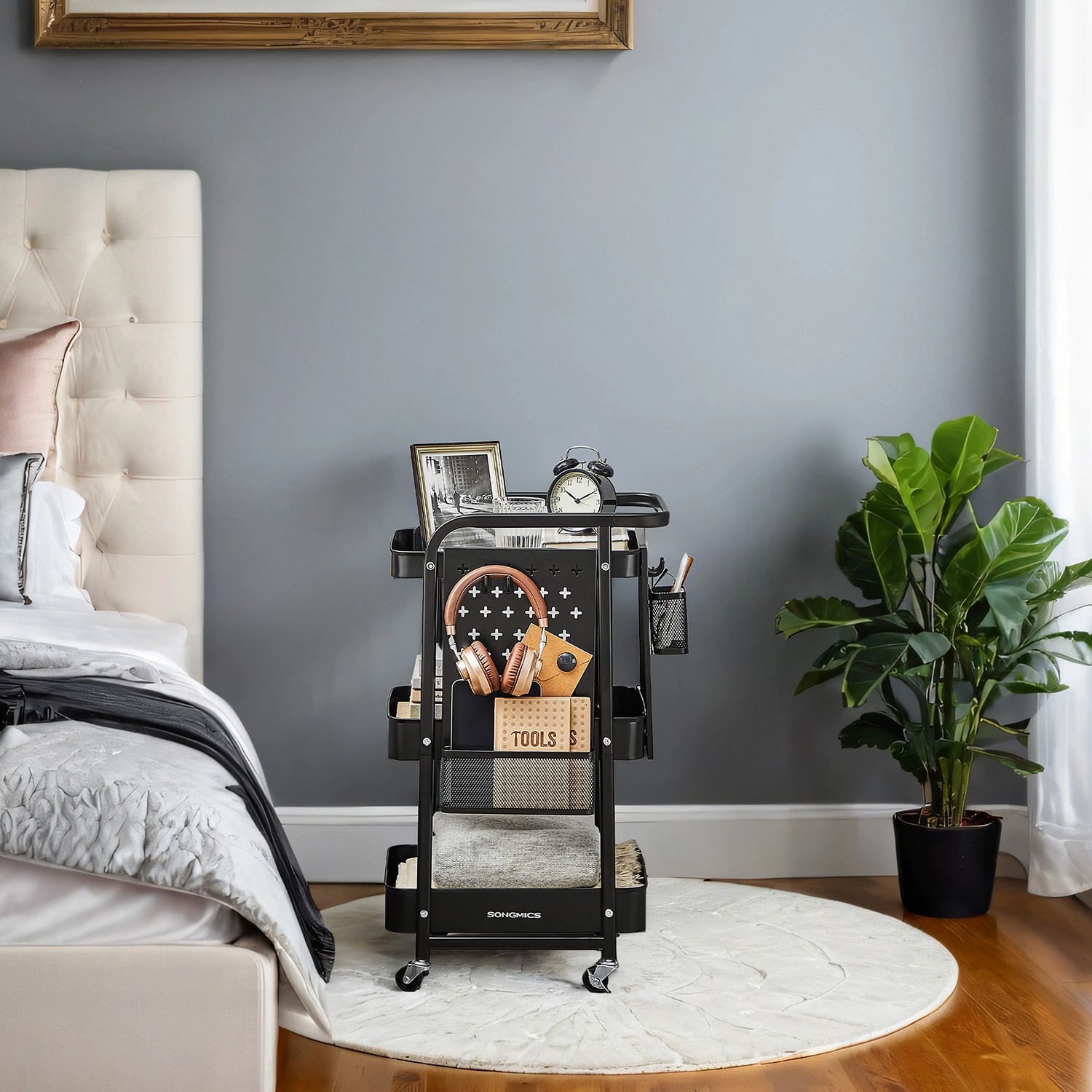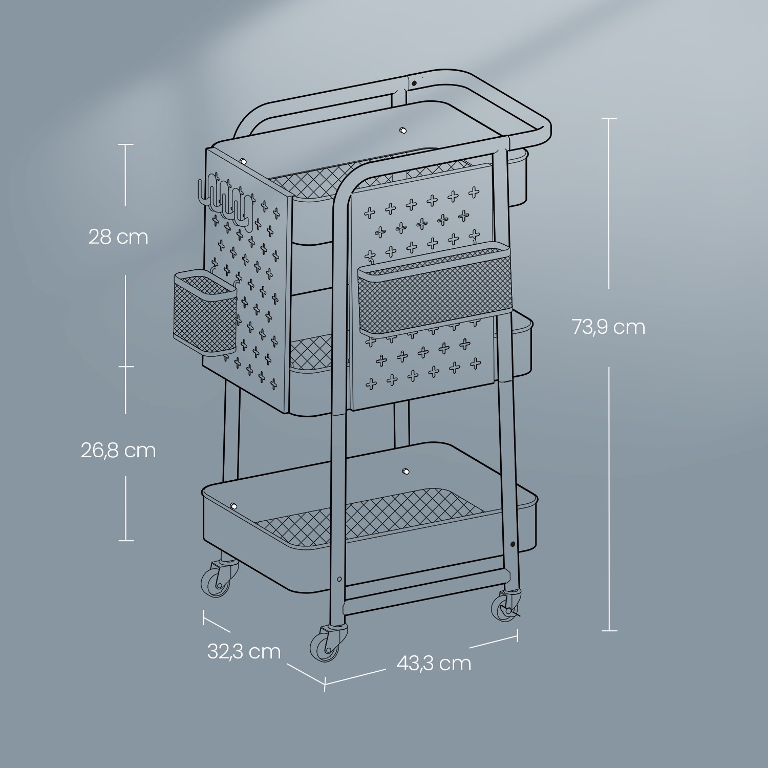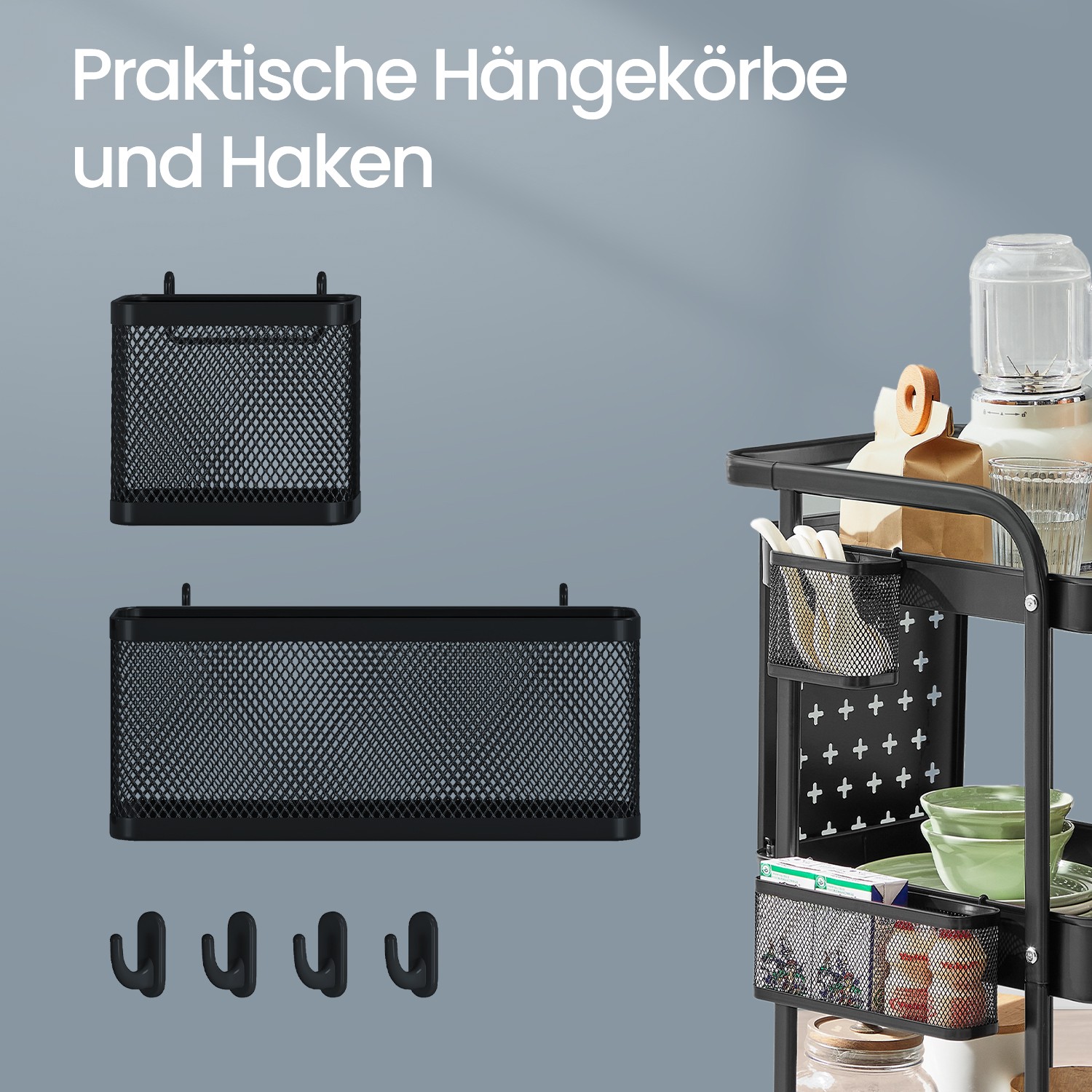 SONGMICS rullebord, k?kkenvogn, 3 metalgitterhylder, serveringsvogn, 2 aftagelige hulplader, 2 h?ngekurve, 4 kroge, til kontor, k?kken, stue, badev?relse, bl?ksort LRC037B01