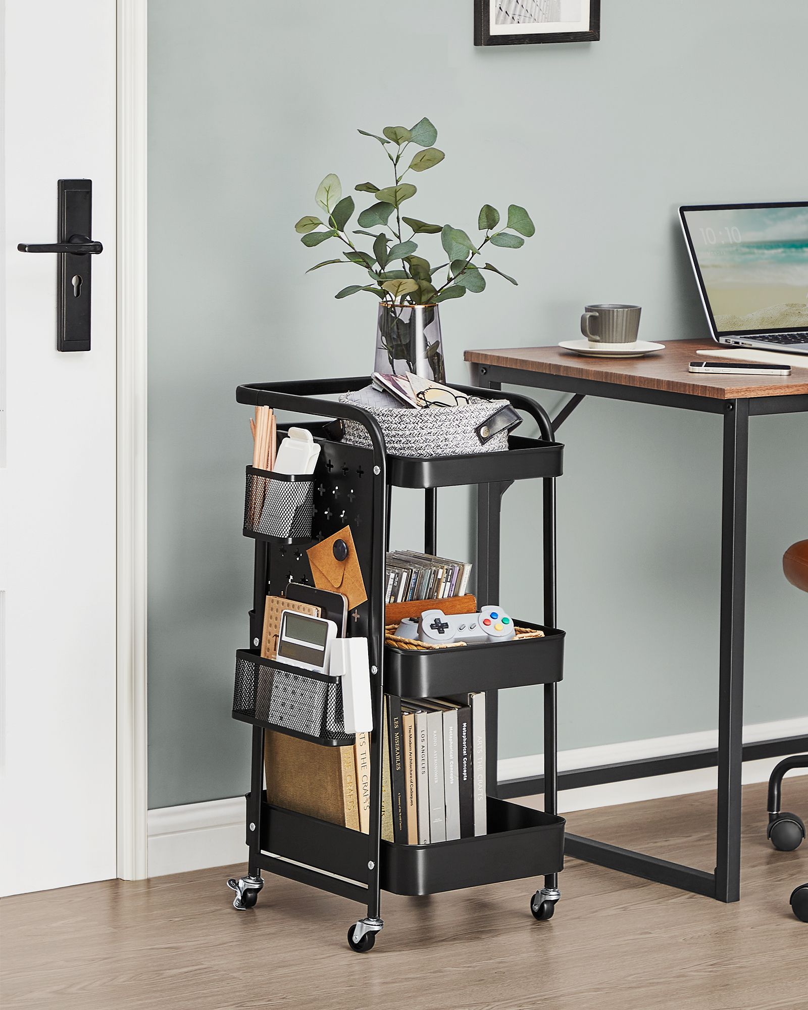 SONGMICS rullebord, k?kkenvogn, 3 metalgitterhylder, serveringsvogn, 2 aftagelige hulplader, 2 h?ngekurve, 4 kroge, til kontor, k?kken, stue, badev?relse, bl?ksort LRC037B01