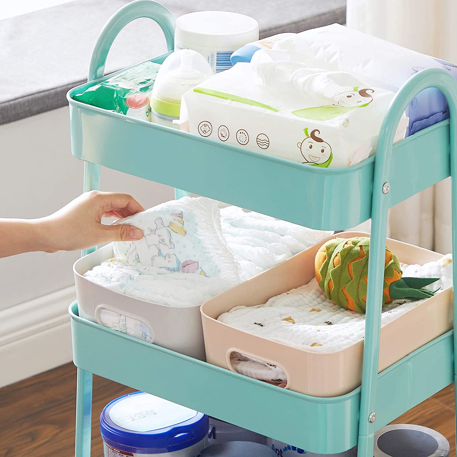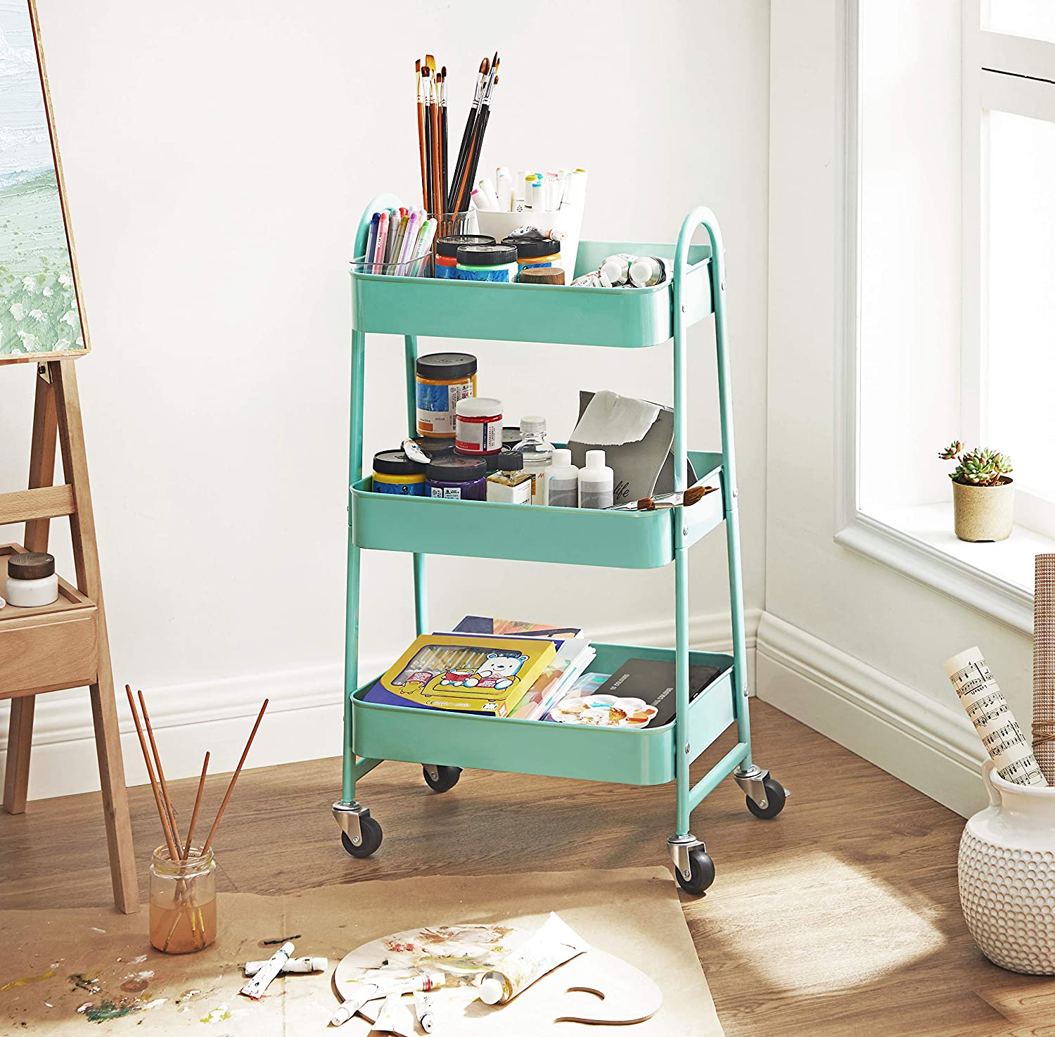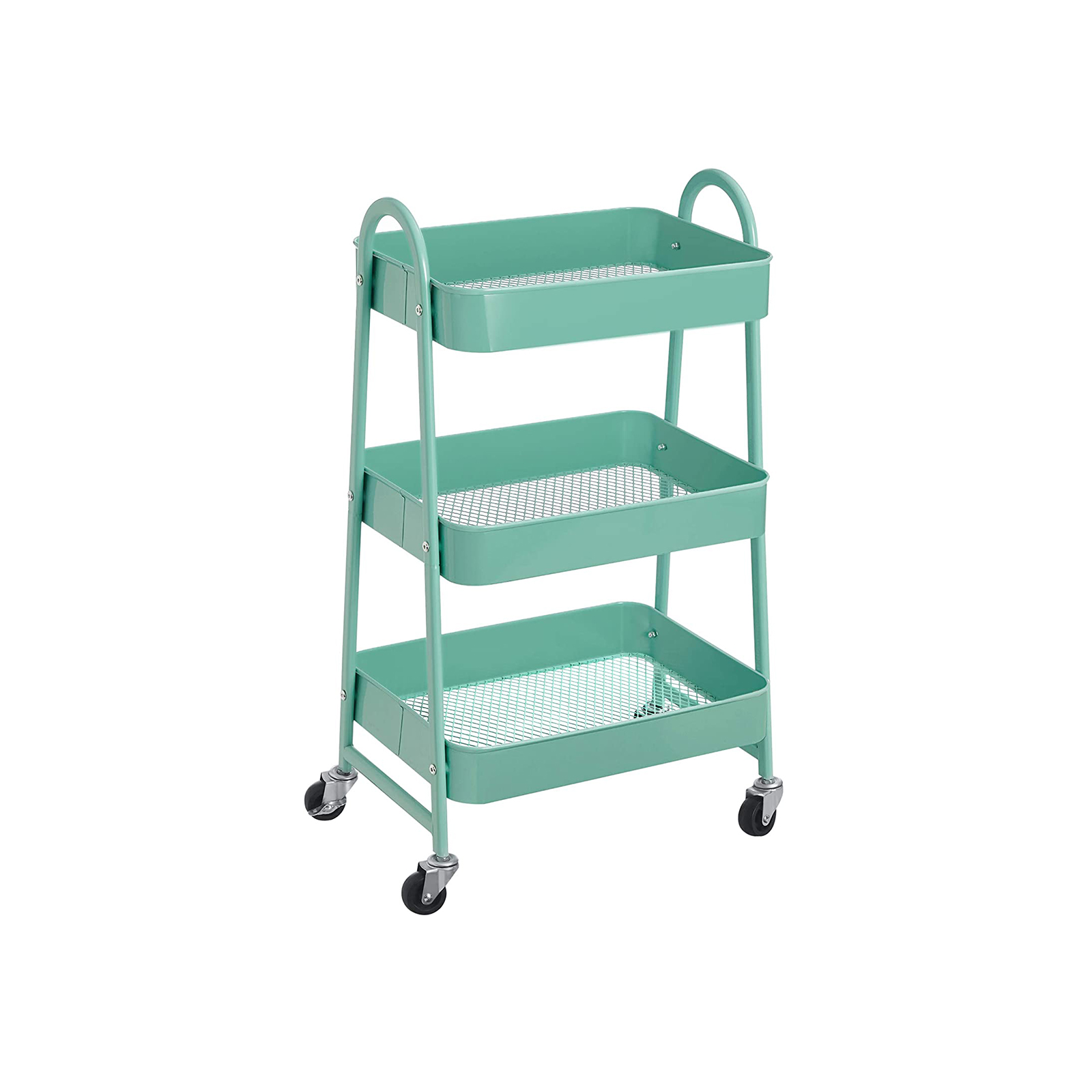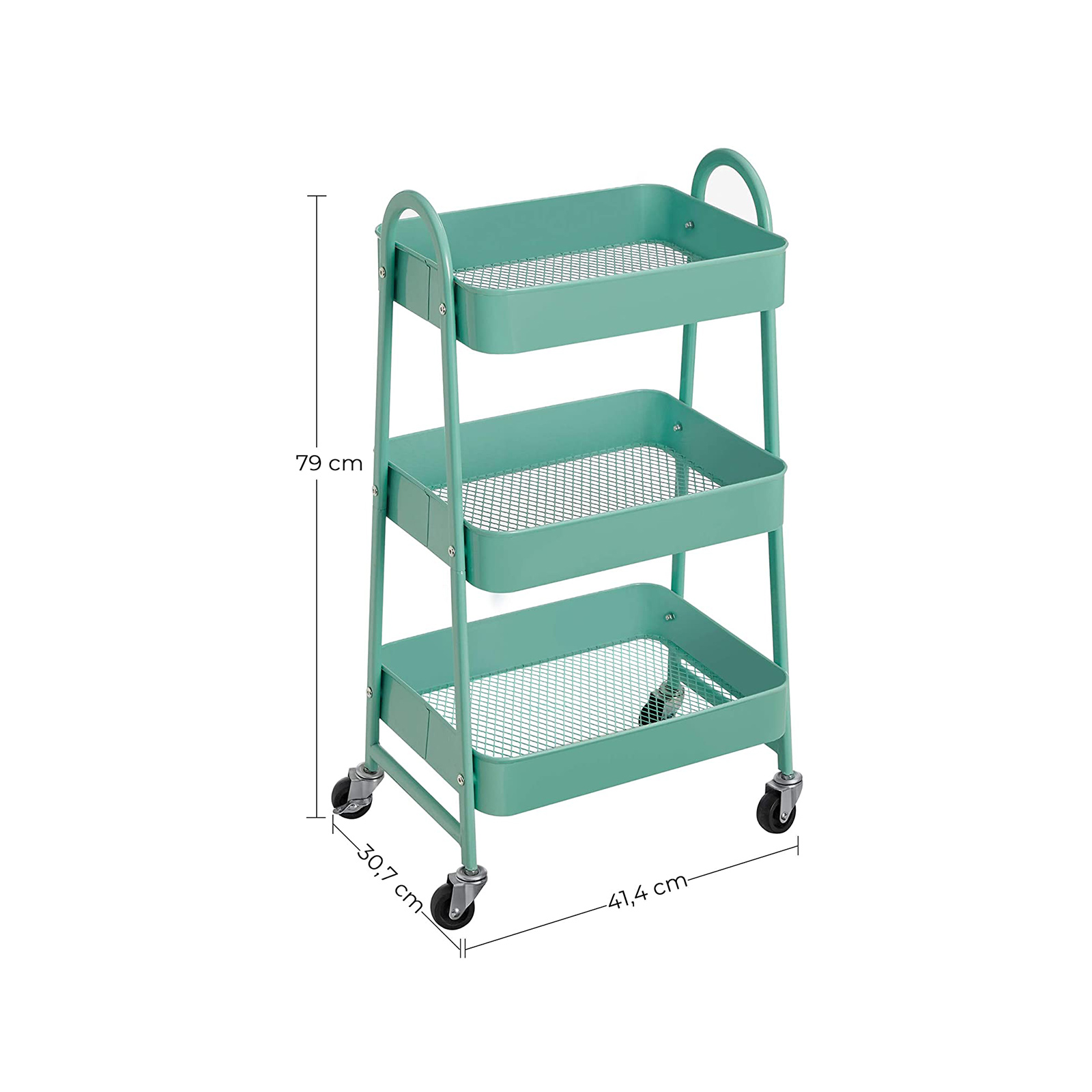 Robust st?lstel, 3 hylder og 4 hjul i h?j kvalitet (2 af dem kan l?ses) ? rul dette reol fra SONGMICS hen til det sted, hvor du har brug for mere opbevaringsplads. I vaskerummet: Skub dette reol ind i vaskerummet for at opbevare vaskemiddel, skyllemiddel, reng?ringsmidler osv. p? en ordentlig m?de. I morgen er det vasket?jsdag! Men bare rolig, alle redskaber er allerede i vognen og venter p? at blive brugt! I k?kkenet: Krydderier i det ?verste hylde, frugt i det midterste og gr?ntsager i det nederste ? alt har sin egen plads! Endelig kan du rydde kaoset v?k fra dine arbejdsflader og bruge dem fornuftigt igen. P? kontoret: Du kan opbevare dine kontorartikler i dette reol og skabe orden p? skrivebordet. For at kunne arbejde produktivt er en ordentlig arbejdsplads A og O! Hvis dit kontor tr?nger til lidt gr?nt, kan du placere nogle sm? sukkulenter i det ?verste hylde p? dette reol. T?nk ud af boksen! Der er uendelige anvendelsesmuligheder for denne rullebord! Rulle f?dselsdagsgaver som en overraskelse? Opbevare b?ger? Eller pr?sentere sm? planter… Hvad ellers? Forskellige genstande passer i denne serveringsvogn. Produktdetaljer: Farve: Mintgr?n Materiale: St?l St?rrelse: 41,4 x 30,7 x 79 cm (L x B x H) V?gt: 4,2 kg Maks. statisk belastning pr. niveau: 10 kg Leveringsomfang: 1 x rullebord 1 x tilbeh?rspakke 1 x vejledning