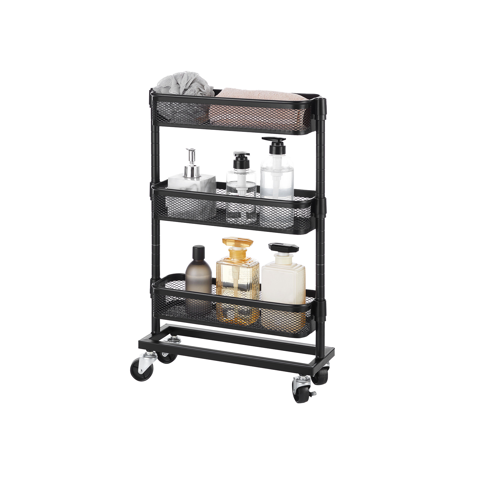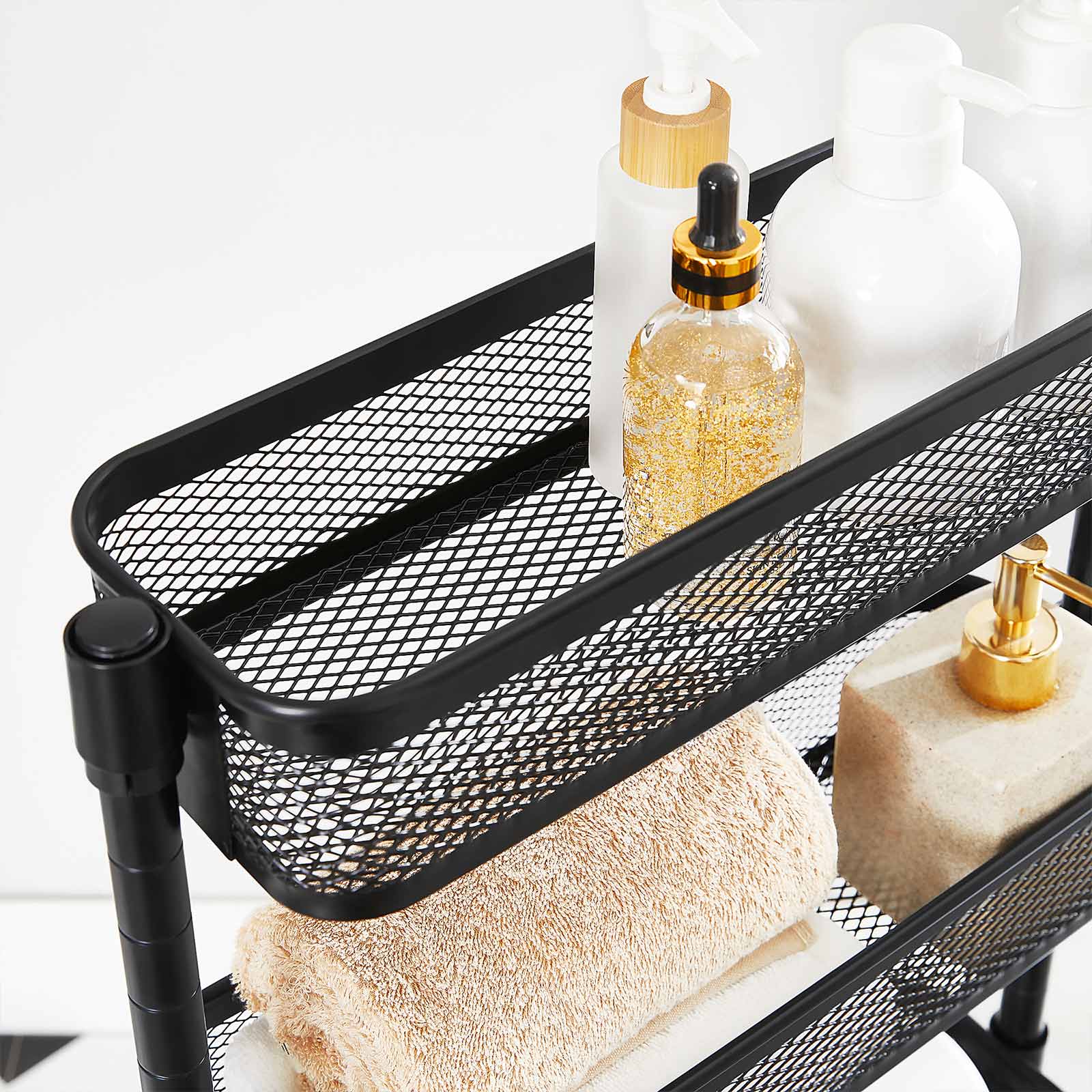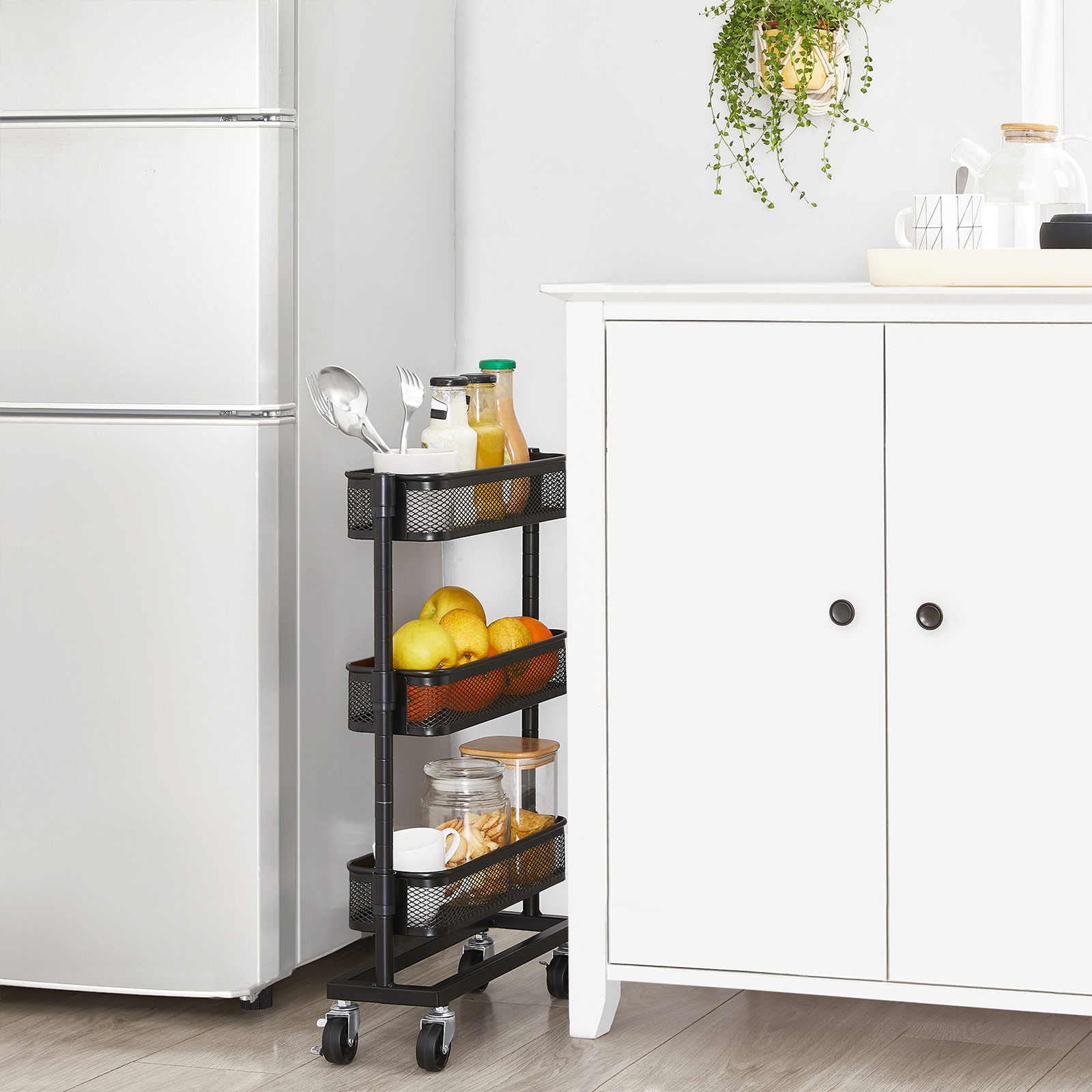 Perfekt ved siden af dit badekar: Fyld dette praktiske badev?relsesreol med shampoo, showergel og en svamp, rul det hen til dit badekar og hop i et varmt skumbad!Praktisk ved siden af dit k?kkenbord: Placer krydderier, saucer, madolier og andre ofte anvendte madlavningsingredienser p? dette k?kkenreol og skub det ind i den lille niche ved siden af dit k?kkenbord. S? har du salt, peber og olivenolie lige ved h?nden, n?r du skal lave din ber?mte couscoussalat.Nyttigt ved siden af dit skrivebord: S?t sm? kasser med kontorartikler, din h?ftemaskine og hulapparat p? denne fleksible rullebord og skub det ind ved siden af dit skrivebord. S? har du hurtig adgang til vigtige arbejdsredskaber uden at dit skrivebord synker ned i kaos.Produktdetaljer: Farve: Sort Materiale: St?l St?rrelse: 41 x 13,5 x 62,5 cm (L x B x H) V?gt: 2,7 kg Maks. statisk belastning pr. niveau: 4 kg Leveringsomfang: 1 x rullebord 1 x tilbeh?rspakke 1 x vejledning (DE, EN, FR, IT, ES)