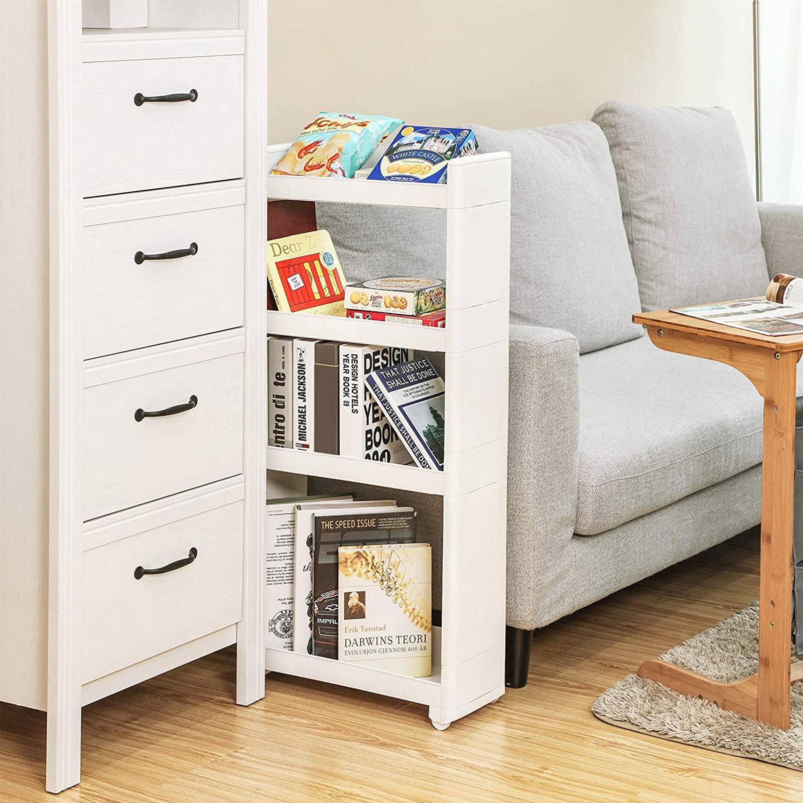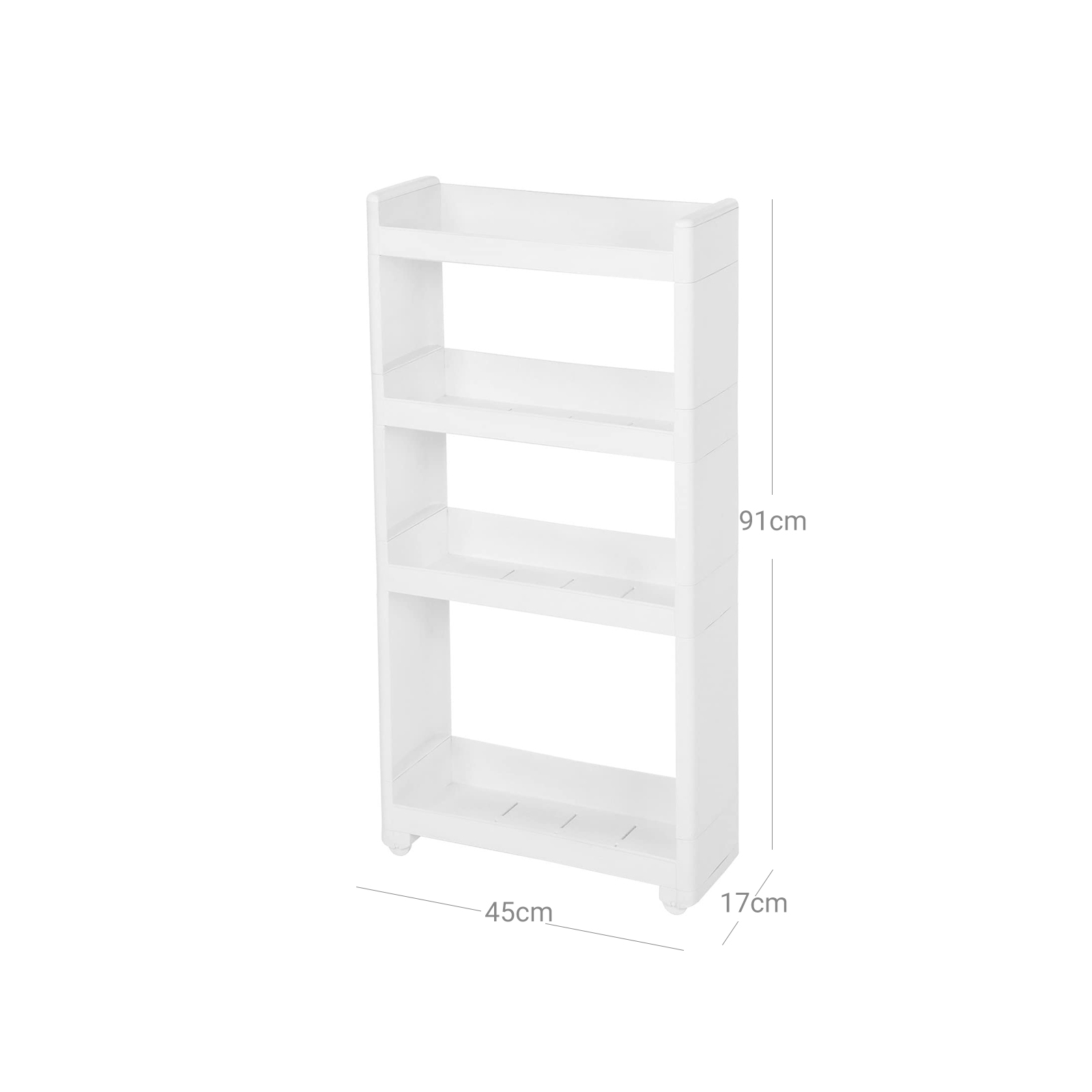 SONGMICS Nichehylde, rullende opbevaringshylde, smal rullebord, 4-etagers plastreol, med hjul, til k?kken og badev?relse, 45 x 91 x 17 cm (B x H x D), hvid KFR10WT