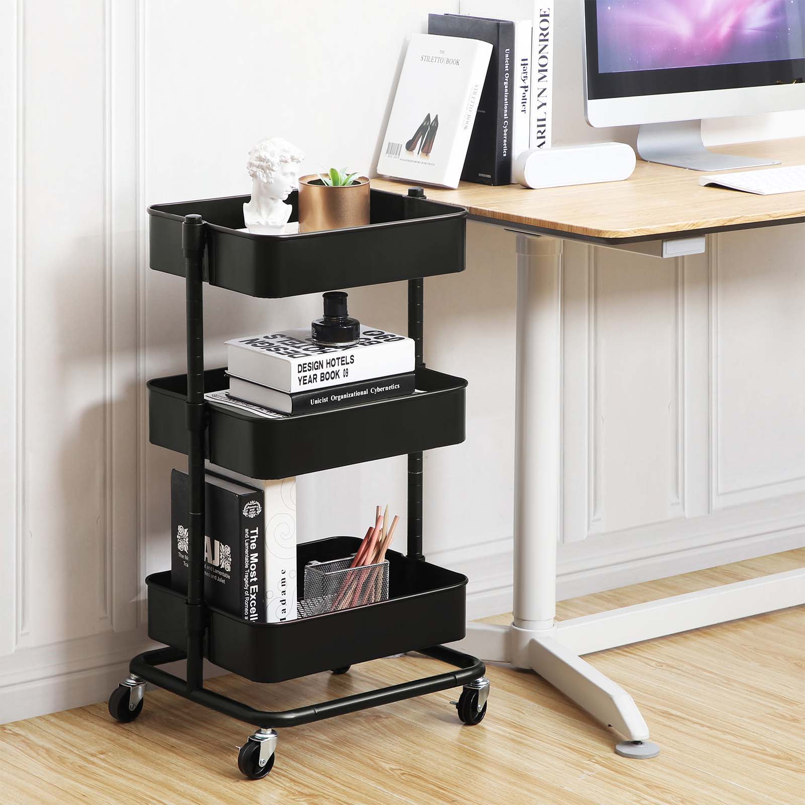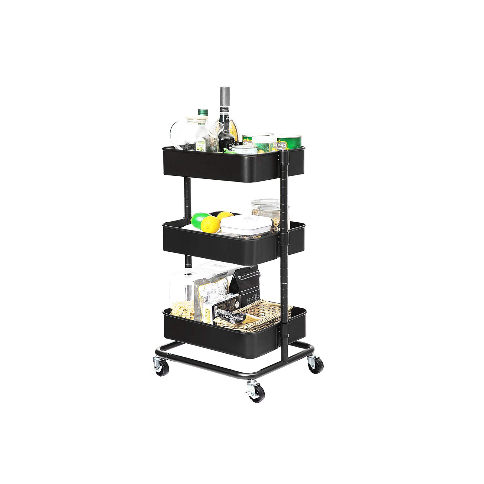 Hvorfor v?lge rullebordet fra SONGMICS? P? grund af den lange levetid: Takket v?re de robuste, pulverlakerede jernr?r og de h?jkvalitative plastforbindelsesstykker er dette reol s?rligt holdbart. P? grund af den nemme adgang: Dette rullebord kan nemt skubbes fra det ene rum til det andet, hvilket letter transporten af sm? genstande. Takket v?re de ?bne hylder kan du ogs? hurtigt f? adgang til disse genstande. P? grund af den ekstra opbevaringsplads: Med 3 h?jdejusterbare hylder (37,5 x 29,5 x 8,5 cm, 38 x 30 x 8,5 cm og 38,5 x 30,5 x 8,5 cm) tilbyder dette reol et rummeligt hjem til ofte anvendte dagligdagsredskaber, dine b?rns leget?j osv. Hvis du har brug for en alsidig, rummelig rullevogn, er denne universalvogn fra SONGMICS lige noget for dig! Produktdetaljer:Farve: Sort Materiale: Jern St?rrelse: 43 x 35 x 73,5 cm (L x B x H) V?gt: 4,7 kg Maks. statisk belastning pr. niveau: 10 kg Leveringsomfang: 1 x rullebord 1 x tilbeh?rspose 1 x vejledning (DE, EN, FR, ES, IT)