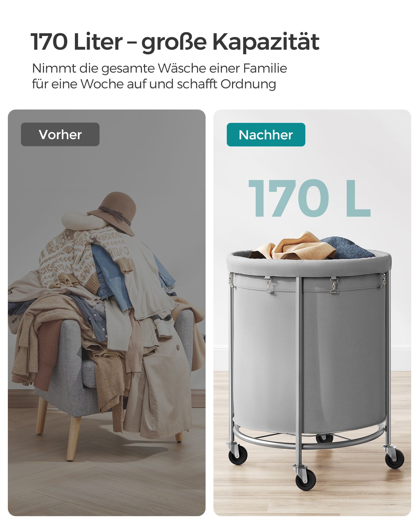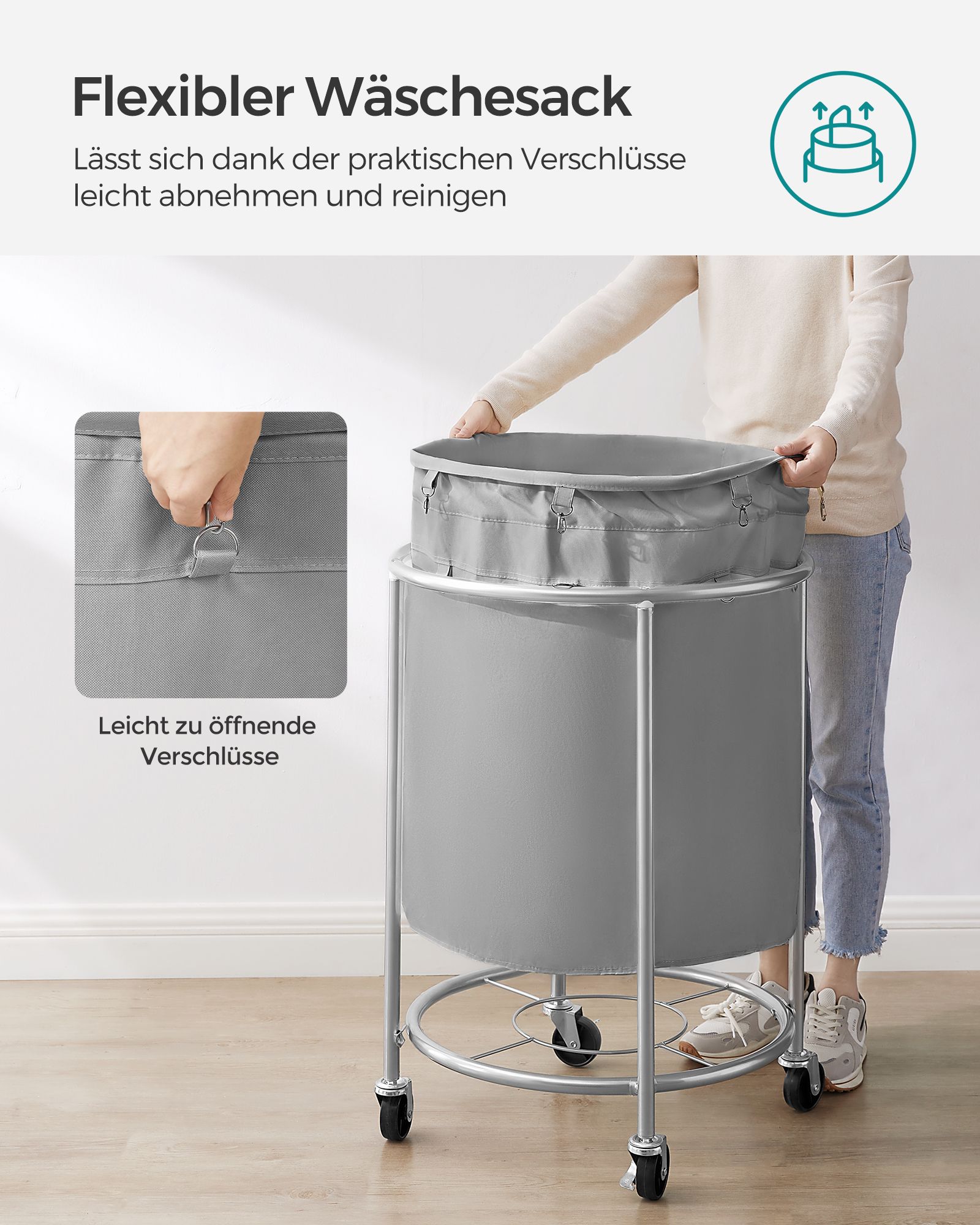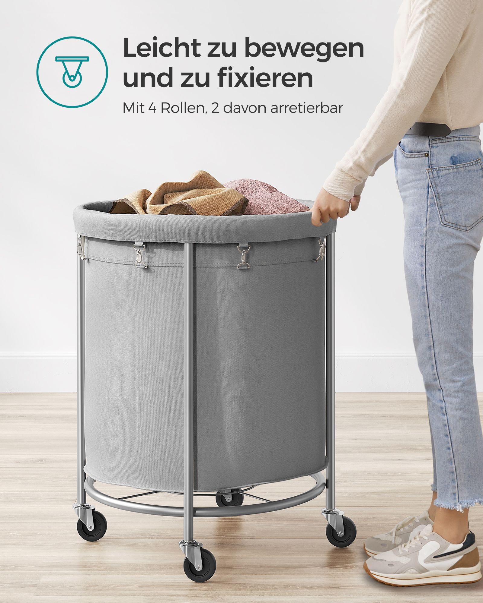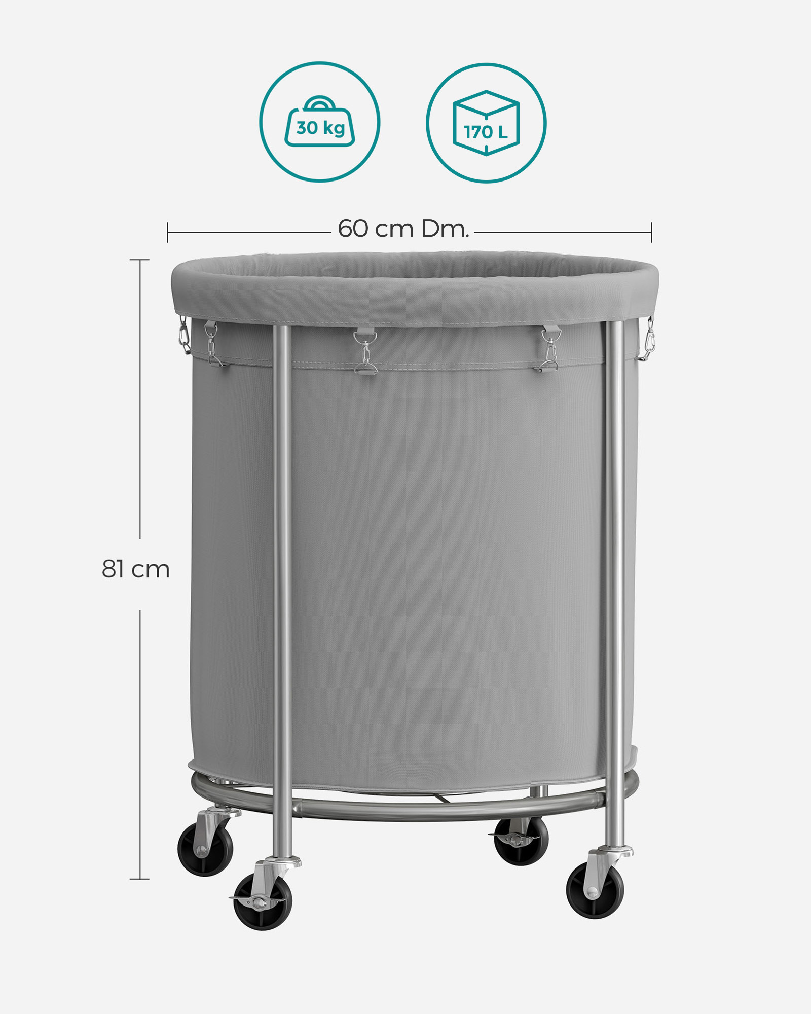 SONGMICS vasket?jssorterer, vasket?jskurv med hjul, 170 liter vasket?jskurv, rund, st?lstel, aftagelig vasket?jspose, 4 hjul, hvoraf 2 med bremser, sort-s?lvfarvet RLS001B01
