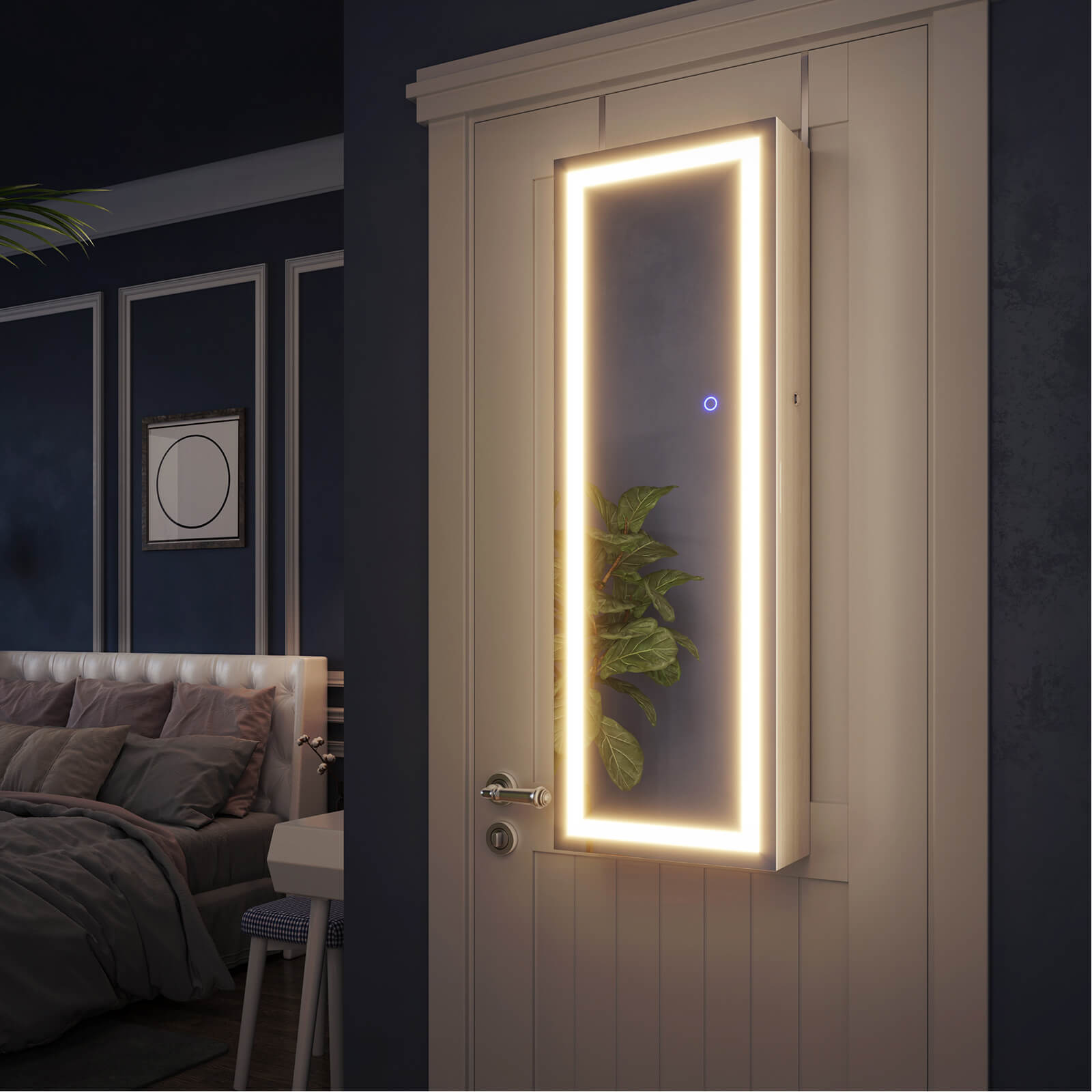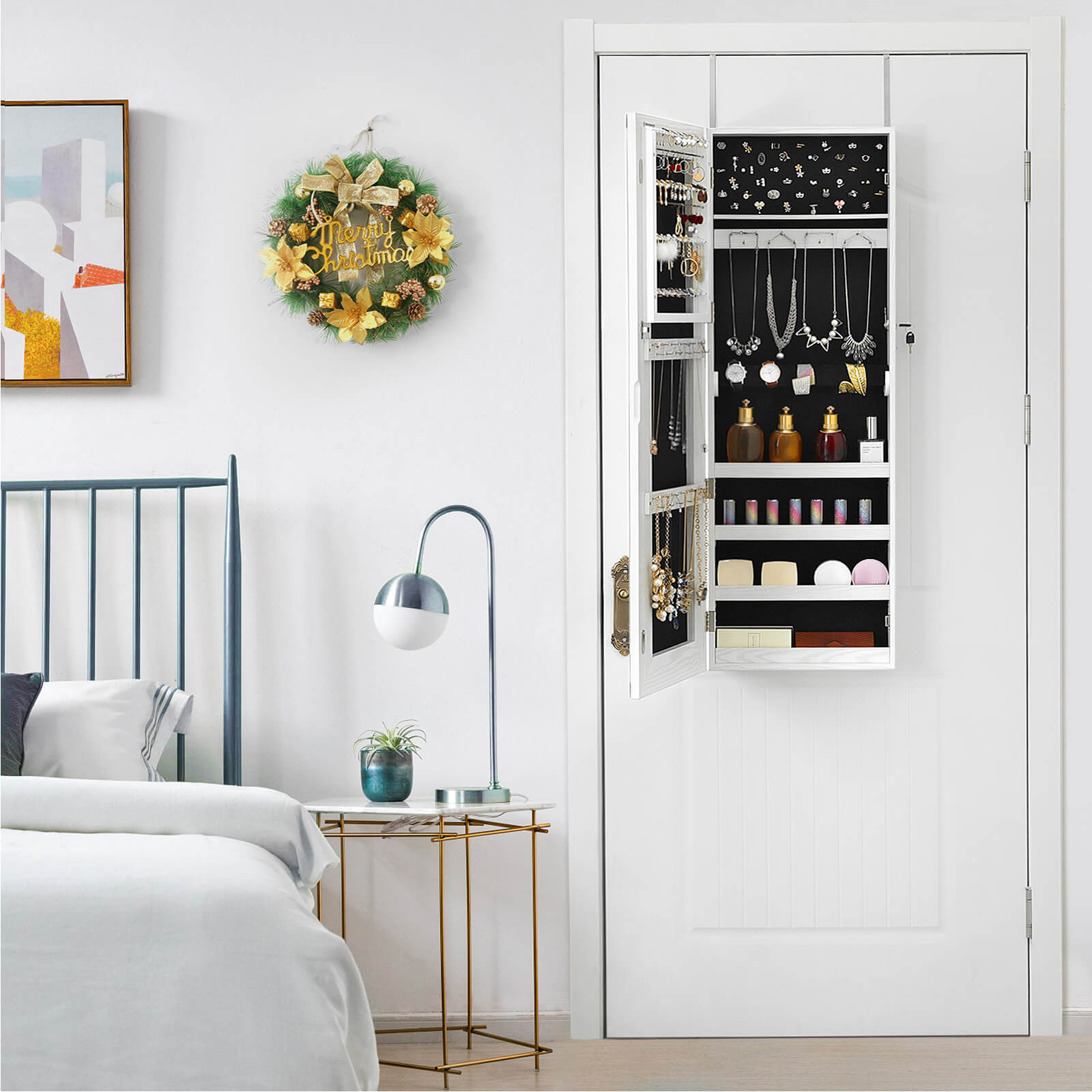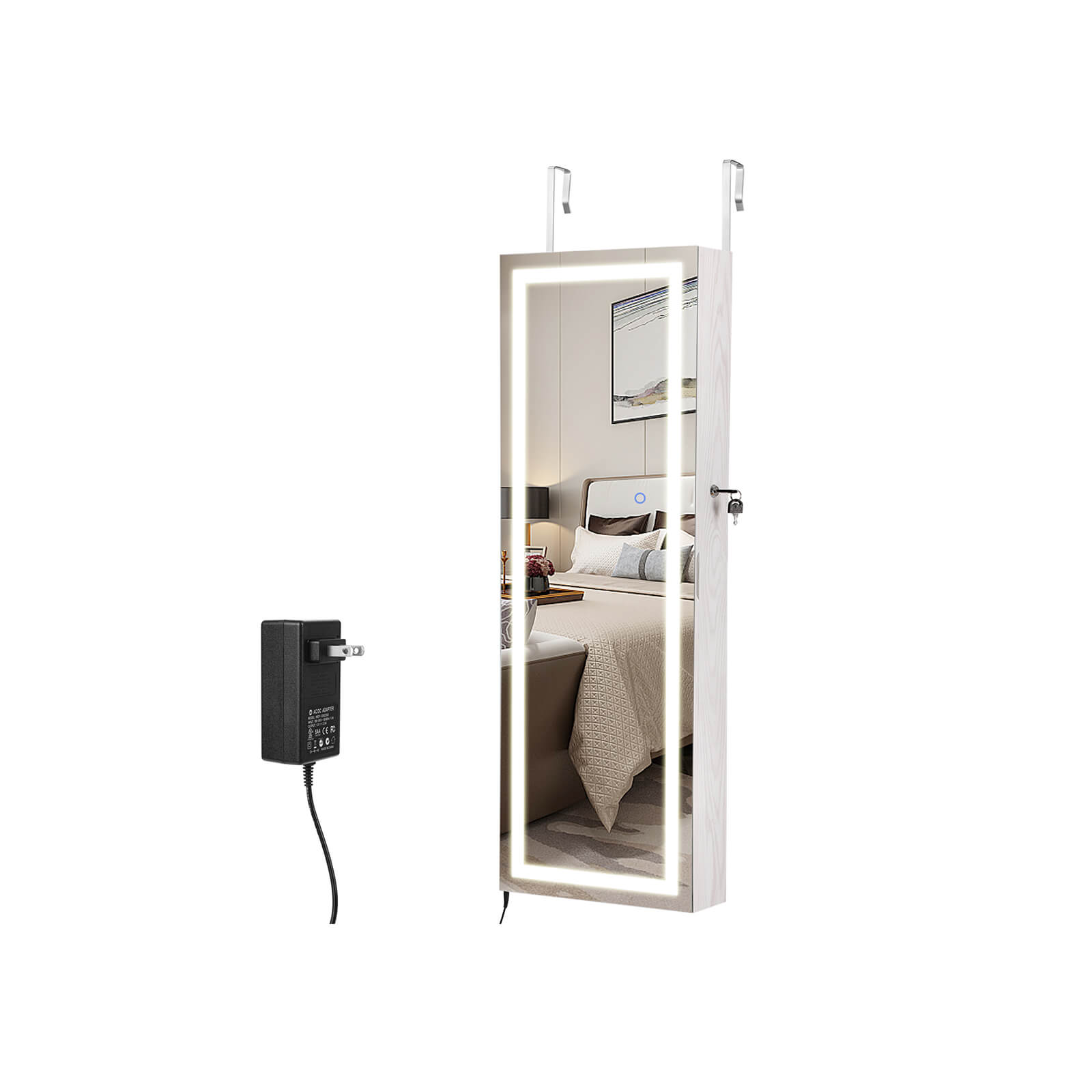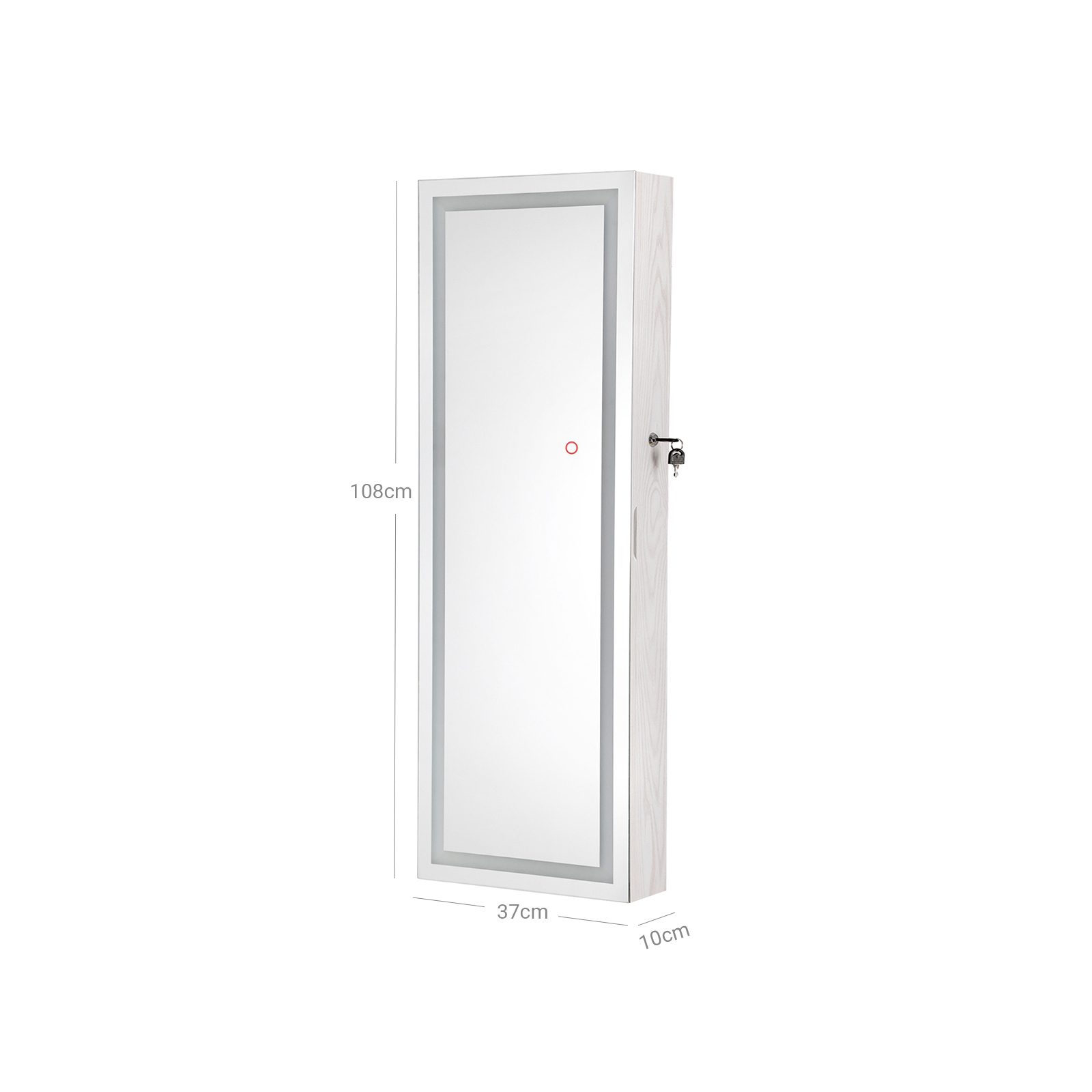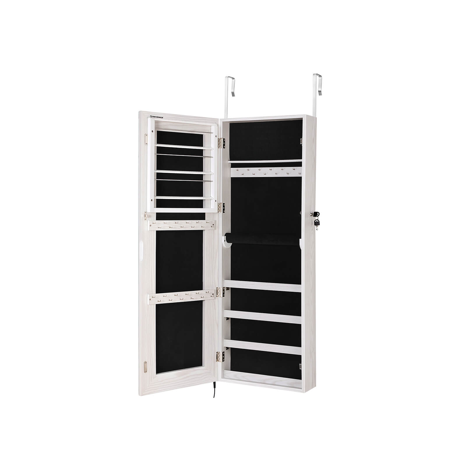 Din nye r?de kjole sidder som st?bt. Tag dine h?jh?lede sko p? og beundr dit outfit i det store, oplyste spejl p? dette opsigtsv?kkende h?ngeskab. Lysrammen kan d?mpes ved at ber?re spejlet. Hvis du imidlertid ?nsker at se din makeup, anbefales det at v?lge den lyseste indstilling p? den udvendige belysning. Stop! Der mangler noget! Matchende ?reringe og en glitrende halsk?de fuldender din styling. Heldigvis beh?ver du ikke lede l?nge efter de rigtige smykker, for de ligger p?nt opstillet bag spejlskabets d?r. Smykkeelskere kan gl?de sig over f?lgende fordele: – Bredt spejl uden ramme for en st?rre spejloverflade – Kan h?nges p? d?rkarmen eller monteres p? v?ggen – D?mpbar udvendig belysning med touch-kontakt – 3 smykkest?nger i rustfrit st?l – 4 r?kker med hver 16 pladser til ?reringe (i alt 64) – 6 r?kker med hver 13 pladser til ringe (i alt 78) – 3 r?kker med hver 12 kroge til halsk?der osv. (i alt 36) – 1 aftagelig rulle til armb?nd og armringe – 4 hylder til neglelak, parfume osv. – Kan afl?ses Produktdetaljer: – Farve: Hvid – Materiale: MDF (mediumdensitetsfiberplade) – St?rrelse: 37 x 10 x 108 cm (L x B x H) – V?gt: 10,5 kg Leveringsomfang: – 1 x smykkeskab til oph?ng – 1 x beholder med tilbeh?r – 1 x vejledning (DE, EN, FR, ES, IT) SONGMICS Bem?rkninger: – V?r forsigtig, n?r du tilslutter adapteren til str?mnettet. – B?rn m? ikke tilslutte adapteren til str?mforsyningen. – Hold b?rn v?k fra alle tilbeh?rsdele og emballagedele under montering af dette produkt. Hvis disse sluges eller ind?ndes, kan det medf?re livsfarlige situationer.