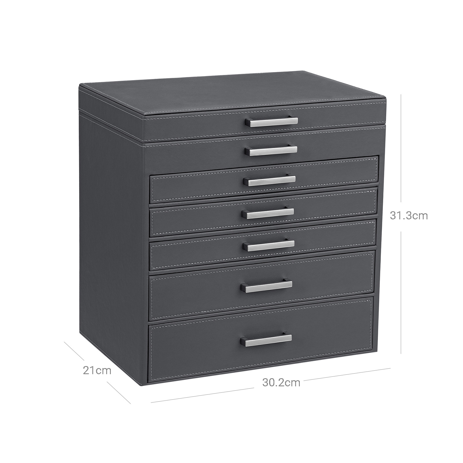 Find den rigtige opbevaringsl?sning Ligger dine smykker spredt rundt i hele huset, og er der nogle af dem, du ikke har haft p? i lang tid, fordi du har glemt, hvor de er? S? b?r du pr?ve denne rummelige smykkeopbevaring! Her kan du opbevare alle dine smykker p? ?t sted. De 6 hylder med forskellige indretninger giver dig mulighed for at opbevare dine v?rdigenstande sorteret, mens det robuste MDF-stel og det bl?de velourfor giver optimal beskyttelse. Fork?l dine ?jne med denne elegante ?ske Gr? kunstl?deroverflade, skinnende metalelementer, enkelt udseende uden dikkedarer ? denne smykkeskrin udstr?ler en tidl?s charme p? dit toiletbord eller i din smykkebutik. Desuden er denne ?ske perfekt som gave til dine k?re, der helt sikkert vil str?le af gl?de, n?r de modtager denne gave. Produktdetaljer:- Farve: Gr? – Materiale: MDF (medium densitetsfiberplade), PU-bel?gning (polyurethan), fl?jlsforing – Samlet st?rrelse: 30,2 x 21 x 31,3 cm (L x B x H) – V?gt: 4,8 kg Leveringsomfang: – 1 x smykkeskrin