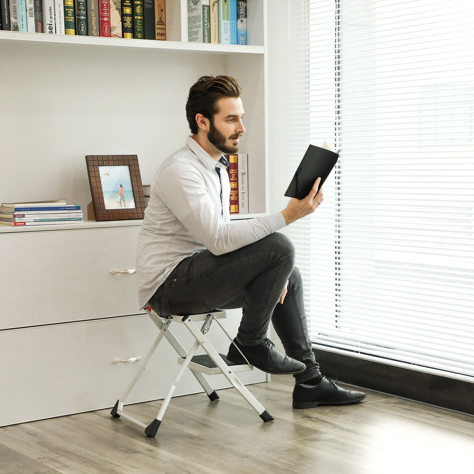 H?j stabilitet og sikkerhed En stige skal give dig en f?lelse af sikkerhed. Derfor tilbyder vi dig denne robuste trappestige. Den er fremstillet af h?jkvalitetsst?l og kan b?re op til 150 kg. Desuden sikrer de 20 cm brede trin med skridsikre gummim?tter og de skridsikre f?dder med gummibel?gning en h?jere stabilitet. Et sikkert arbejdsmilj? sikrer, at du altid kan koncentrere dig. Gennemt?nkt ned til mindste detalje Den sammenklappelige stige m?ler kun 50 x 3,5 x 55,5 cm, n?r den er klappet sammen, og passer derfor perfekt i et hj?rne af din garage eller i bagagerummet p? din bil. Desuden vejer den kun 3,5 kg og er udstyret med et b?reh?ndtag, s? du nemt kan transportere stigen fra k?lderen til haven for at besk?re grene. Stigen har desuden ingen skarpe kanter og har afrundede hj?rner samt gummikapper, hvilket sikrer en sikker brug. Produktdetaljer: – Farve: Hvid-sort – Materiale: St?l – St?rrelse sammenklappet: 50 x 3,5 x 55,5 cm (L x B x H) – St?rrelse udklappet: 50 x 59,5 x 44 cm (L x B x H) – St?rrelse trin: 30 x 20 cm – V?gt: 3,5 kg – Maks. statisk belastning: 150 kg Leveringsomfang:- 1 x trappestige med 2 trin – 1 x vejledning SONGICs bem?rkninger: – V?r forsigtig, n?r du klapper stigen sammen, for at undg? at klemme fingrene. – Brug produktet p? et plant underlag. – Brug ikke stigen, hvis der er olie eller vand p? gulvet. – F?r du bruger stigen, skal du sikre dig, at sikkerhedsanordningen er l?st automatisk.
