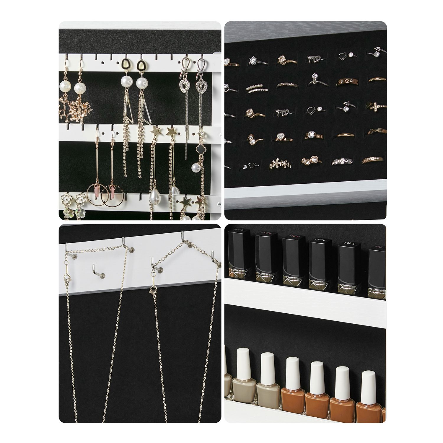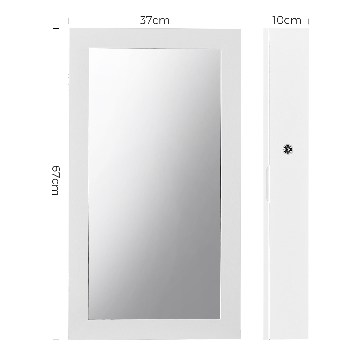 Hvis du leder efter et v?gspegel med opbevaringsmuligheder, er Songmics spejl- og smykkeskab det rette valg. Skabet tilbyder masser af plads og kan rumme alt uden at det bliver rodet. De ?nskede smykker er nemme at finde. Det er super nemt at samle, da skabskroppen allerede er f?rdigmonteret. Du skal blot h?nge det op p? en v?g. Desuden vil emballagen helt sikkert overraske dig, n?r du ?bner pakken. Med Songmics spejl- og smykkeskab vil du have gl?de af dit k?b i mange ?r. Bem?rkninger: – Spejlet er skr?beligt, s? behandl det forsigtigt, og beskyt skabet mod at v?lte for at undg?, at spejlet g?r i stykker. Produktdetaljer: – Farve: hvid – M?l: 37 x 67 x 10,5 cm (B x H x D) – Spejlm?l: 59 x 29 cm (B x D) – Materiale: MDF-plade + fl?jl + spejl – V?gt: 5,4 kg Leveringsomfang: – 1 x smykkeskab – 2 x n?gler – 2 x skruer – 2 x dyvler